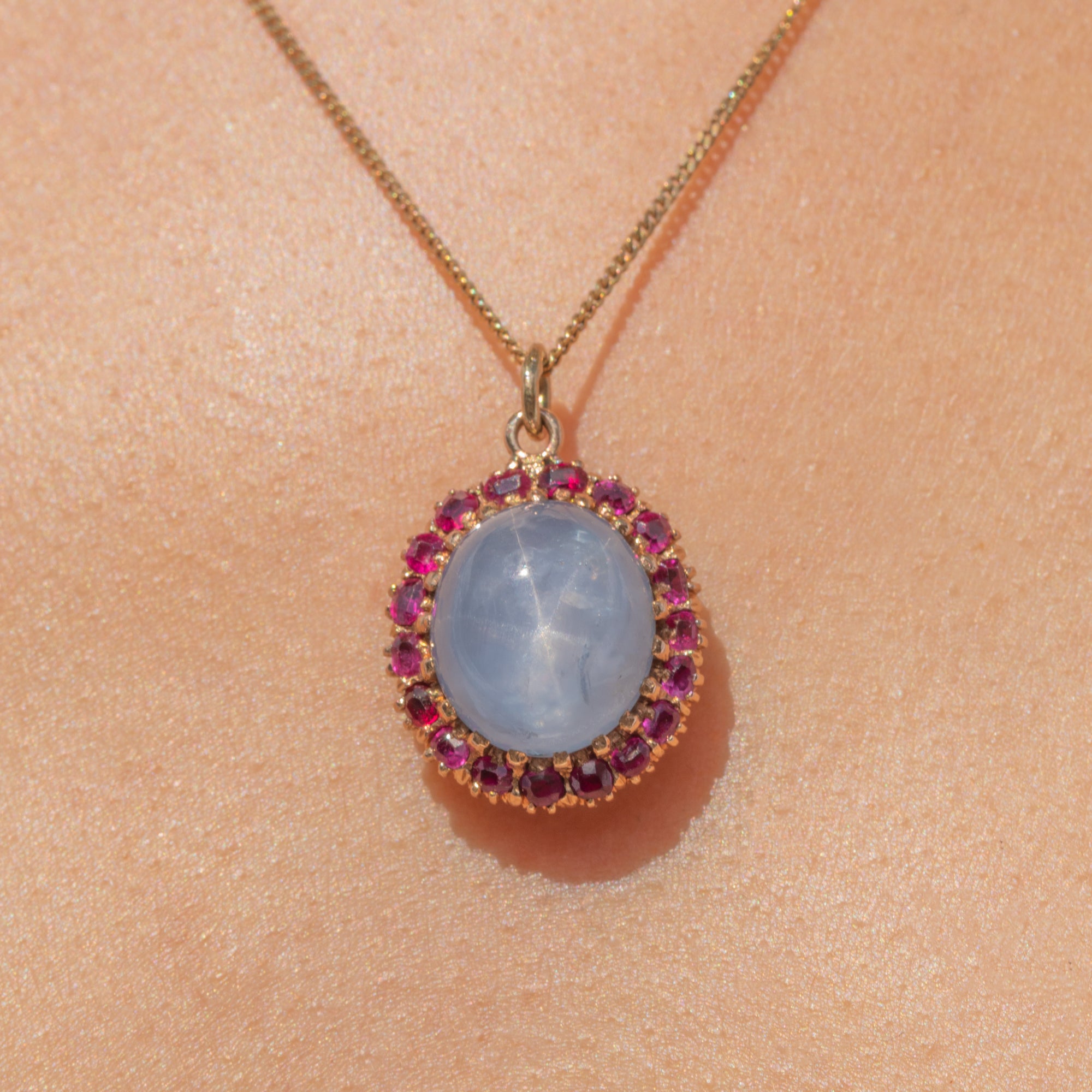 VERY GOOD-EXCELLENT: This antique 14ct Gold Natural Star Sapphire Ruby cluster pendant is in wonderful condition, with all stones securely set and the original craftsmanship beautifully preserved. The central Natural Star Sapphire is smoothly domed, with only a few mild surface marks, largely concealed by the Sapphire's soft, shimmering asterism but visible under close inspection. The surrounding Rubies are all present with a radiant hue, they exhibit some minor abrasions, typical for antique pieces of this kind, but this does not detract from the overall appearance or integrity of the setting.