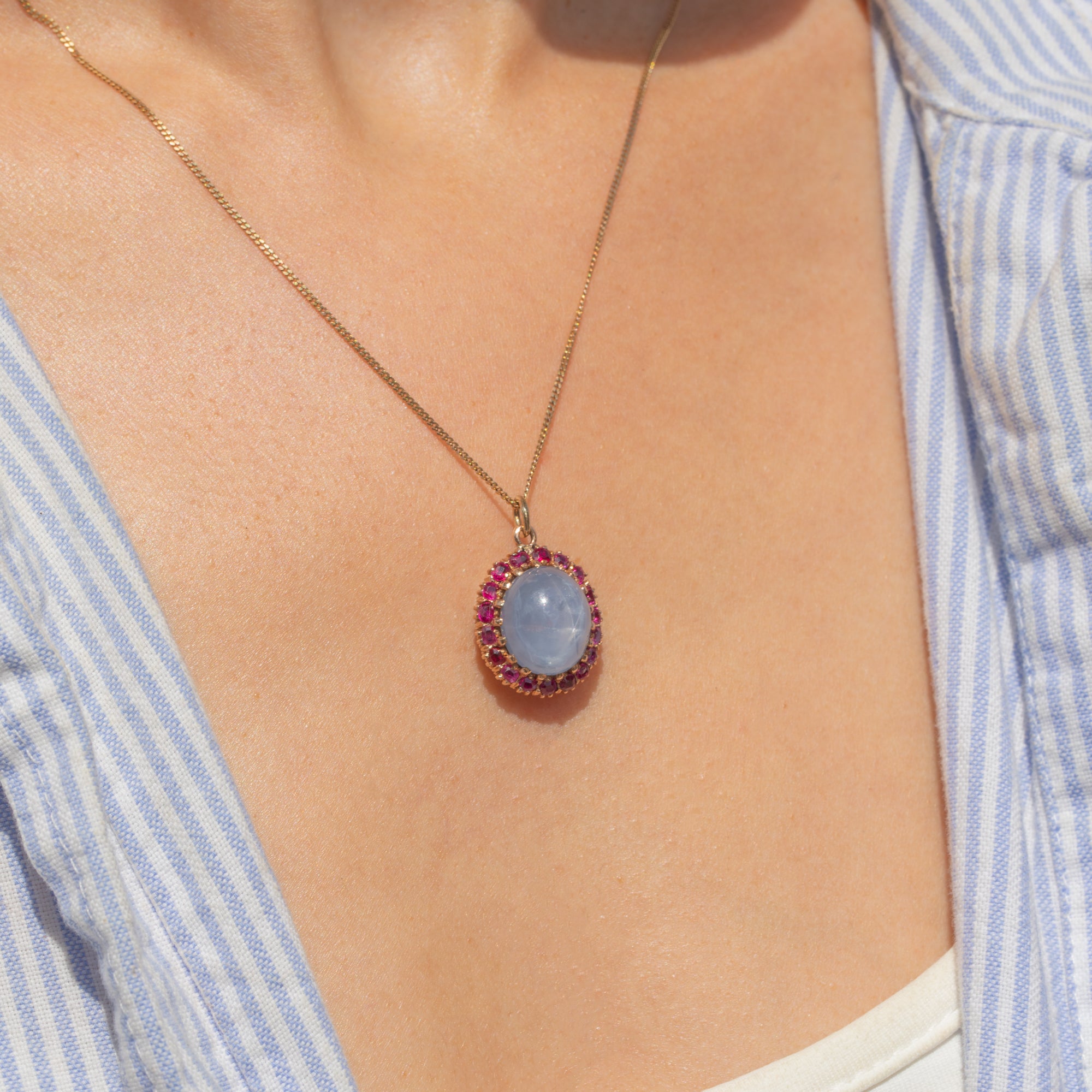 VERY GOOD-EXCELLENT: This antique 14ct Gold Natural Star Sapphire Ruby cluster pendant is in wonderful condition, with all stones securely set and the original craftsmanship beautifully preserved. The central Natural Star Sapphire is smoothly domed, with only a few mild surface marks, largely concealed by the Sapphire's soft, shimmering asterism but visible under close inspection. The surrounding Rubies are all present with a radiant hue, they exhibit some minor abrasions, typical for antique pieces of this kind, but this does not detract from the overall appearance or integrity of the setting.
