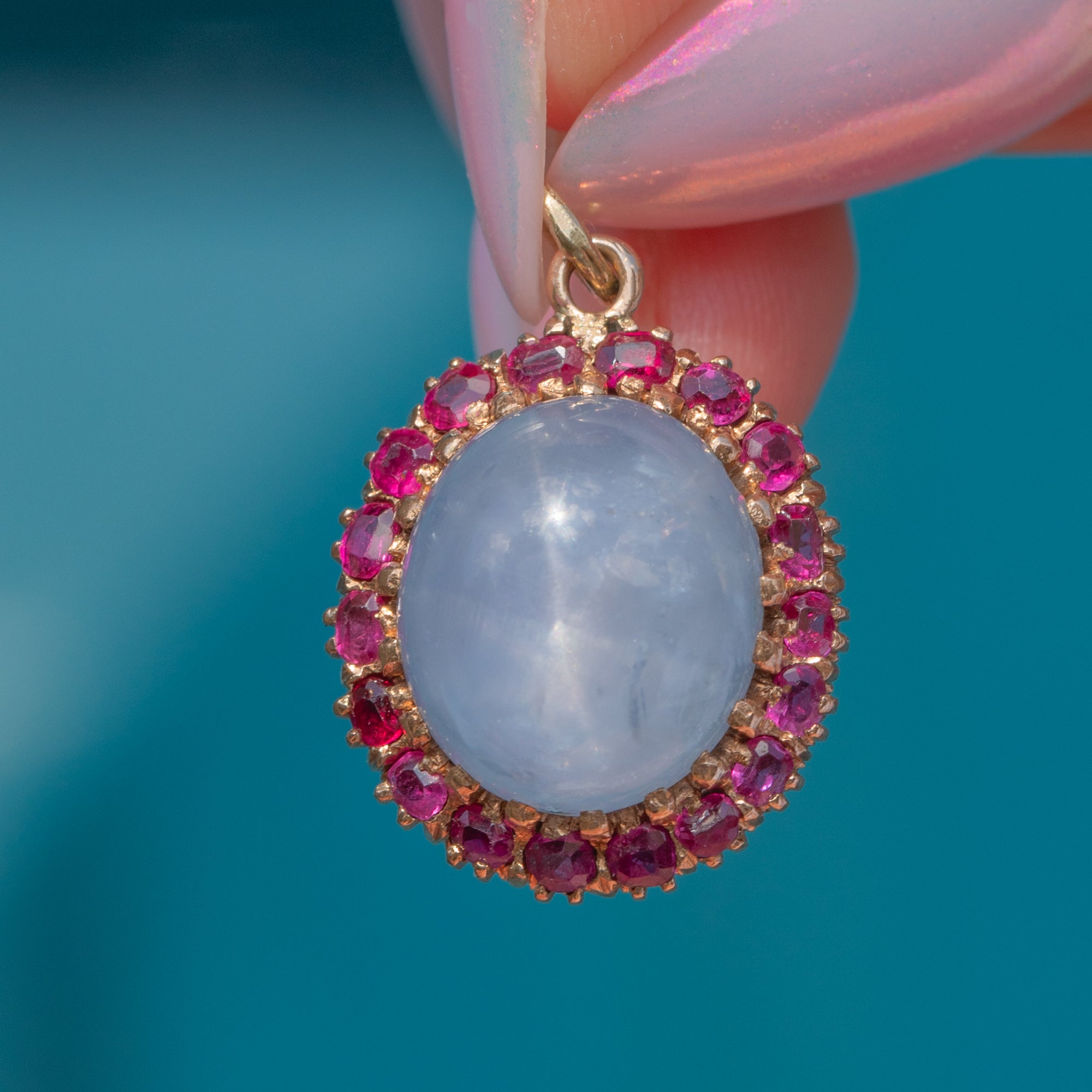 VERY GOOD-EXCELLENT: This antique 14ct Gold Natural Star Sapphire Ruby cluster pendant is in wonderful condition, with all stones securely set and the original craftsmanship beautifully preserved. The central Natural Star Sapphire is smoothly domed, with only a few mild surface marks, largely concealed by the Sapphire's soft, shimmering asterism but visible under close inspection. The surrounding Rubies are all present with a radiant hue, they exhibit some minor abrasions, typical for antique pieces of this kind, but this does not detract from the overall appearance or integrity of the setting.