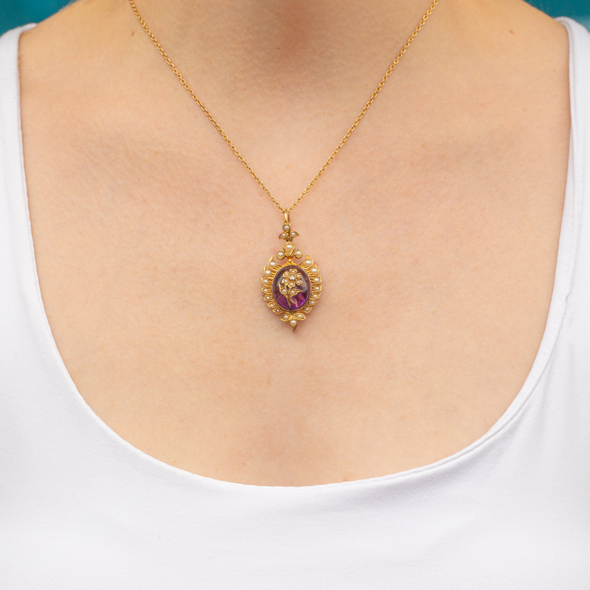 MATERIALS: Tests as 15ct Gold. (The metal inner frame of the locket provides strength and durability) 6.40ct Amethyst cabochon (foiled), Natural Pearls, Rose-cut Diamond.