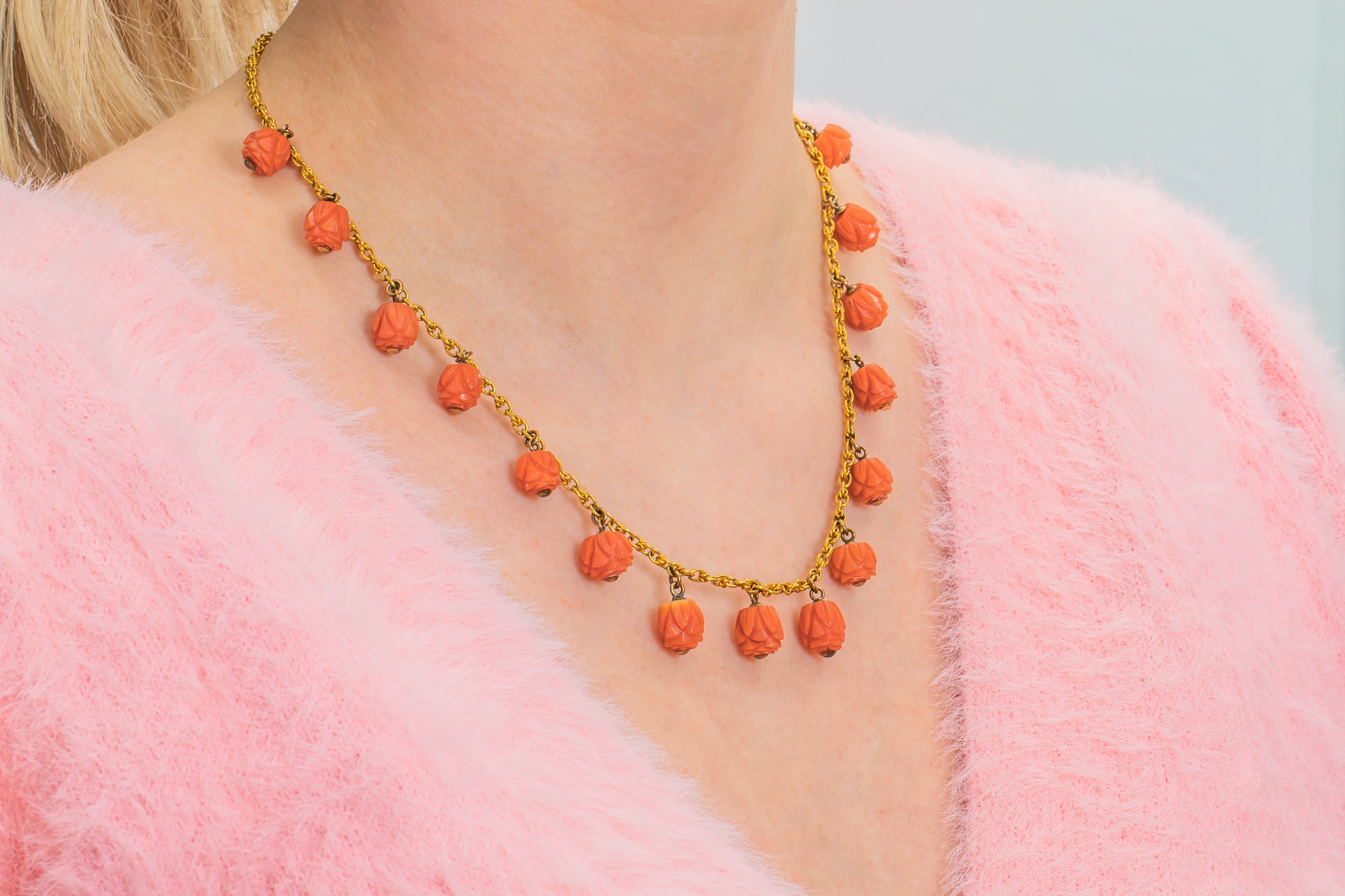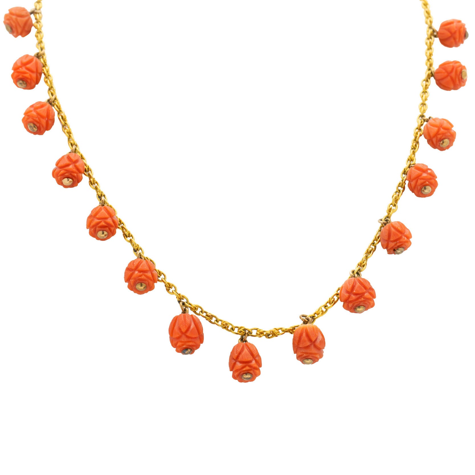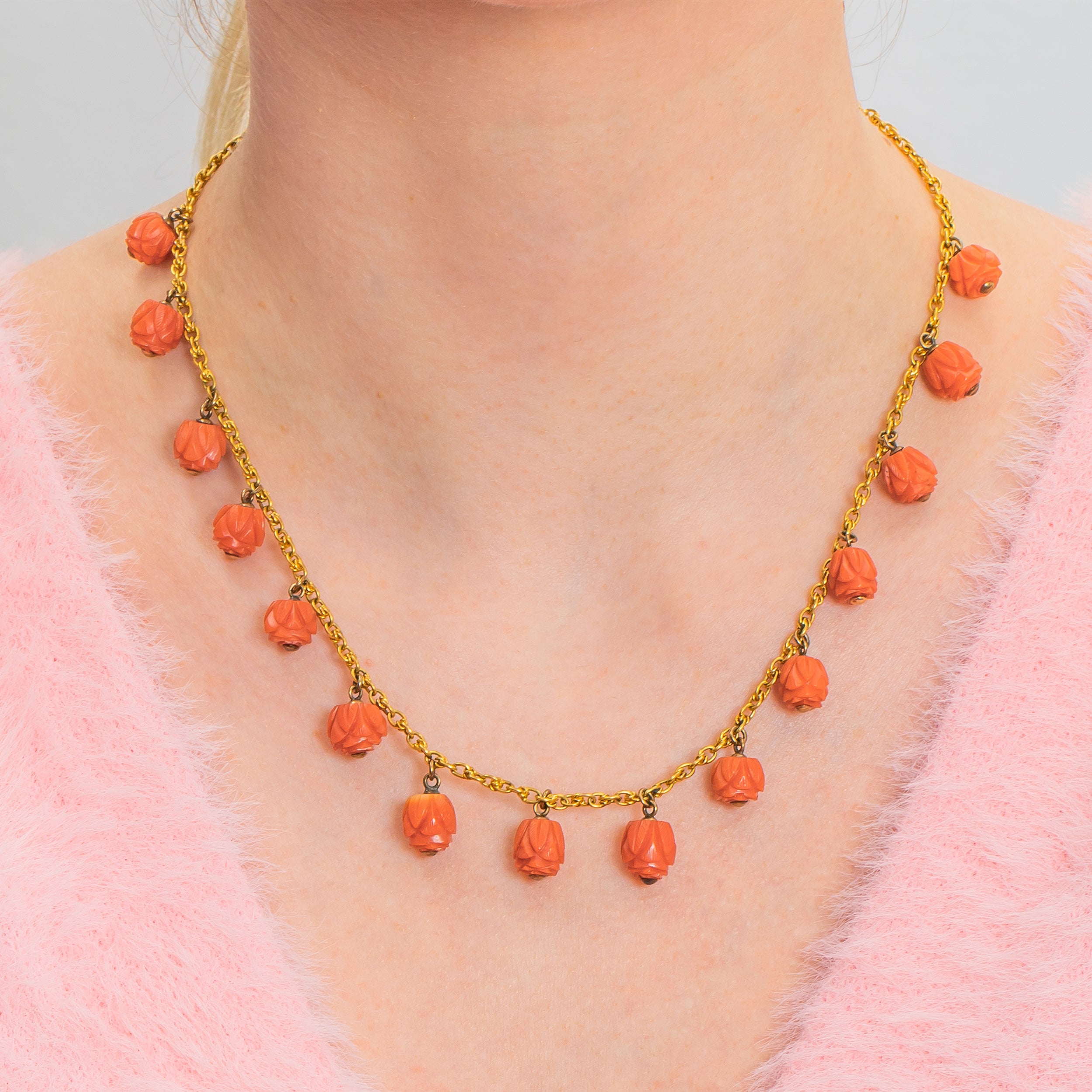 We are super excited to introduce you to this spectacular antique 15ct Gold Coral necklace! Fifteen stunning hand-carved Coral beads drop delicately below the buttercup 15ct Gold chain to which they are attached, falling ever so elegantly across the collarbones!
