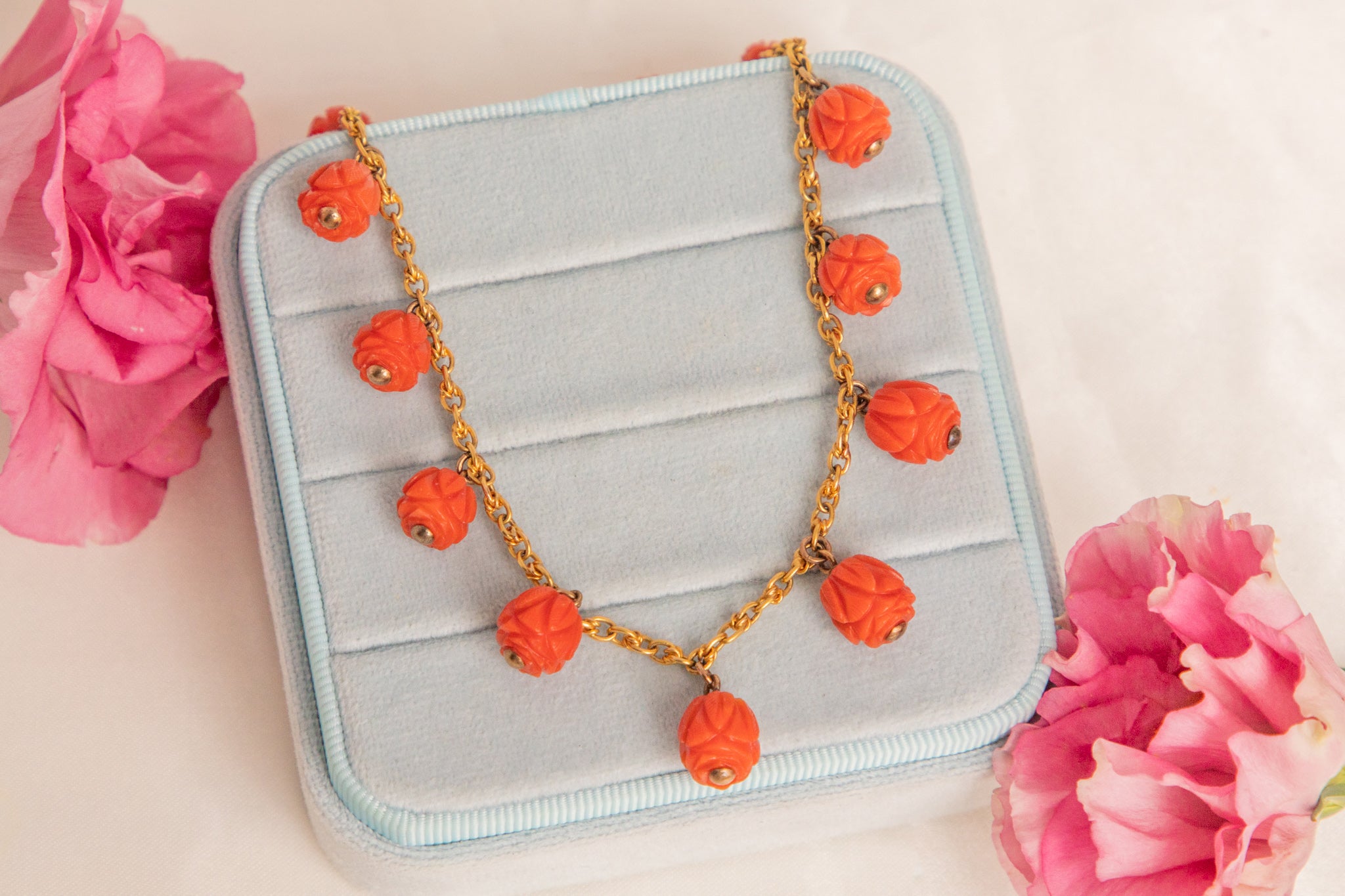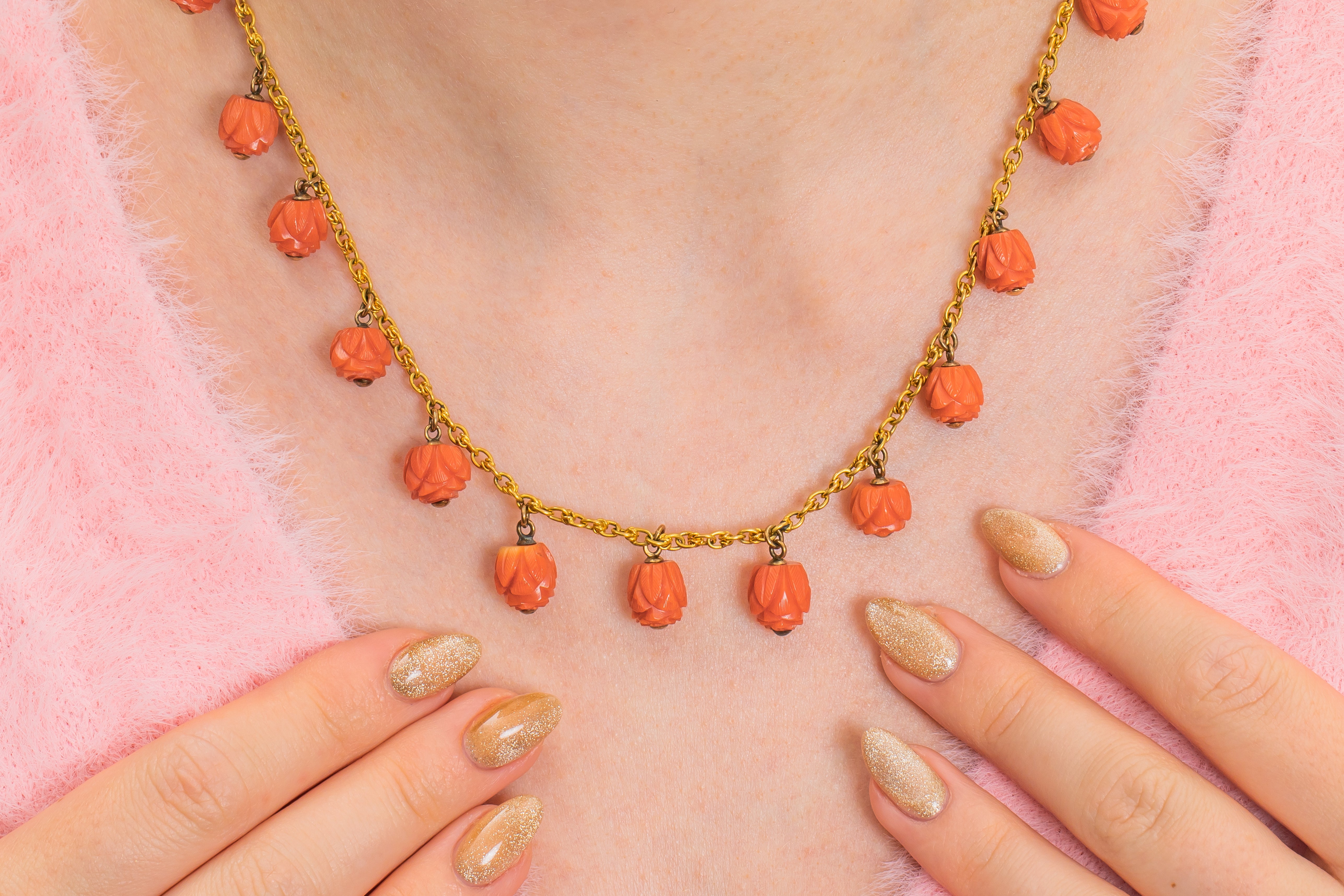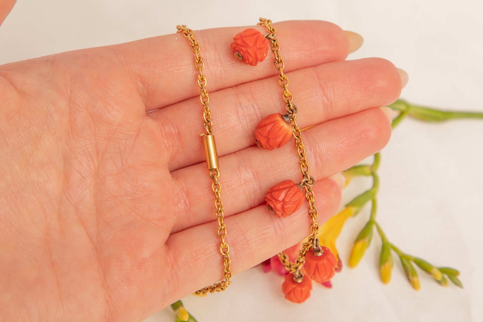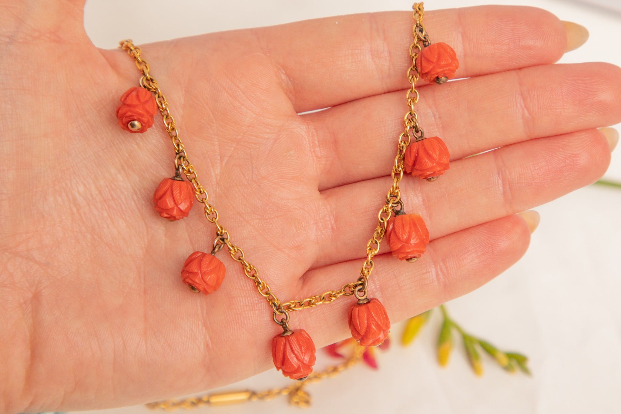 We are super excited to introduce you to this spectacular antique 15ct Gold Coral necklace! Fifteen stunning hand-carved Coral beads drop delicately below the buttercup 15ct Gold chain to which they are attached, falling ever so elegantly across the collarbones!