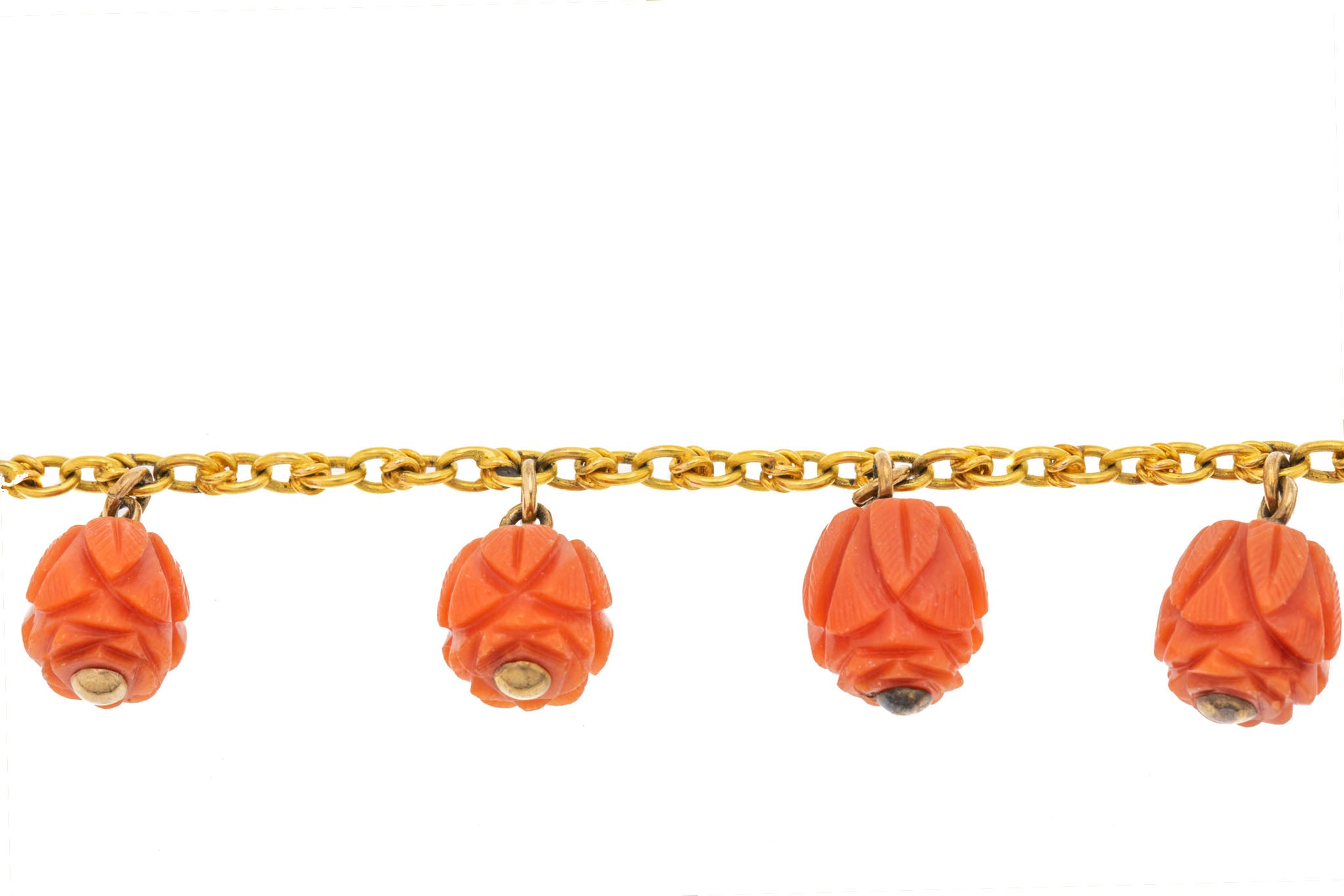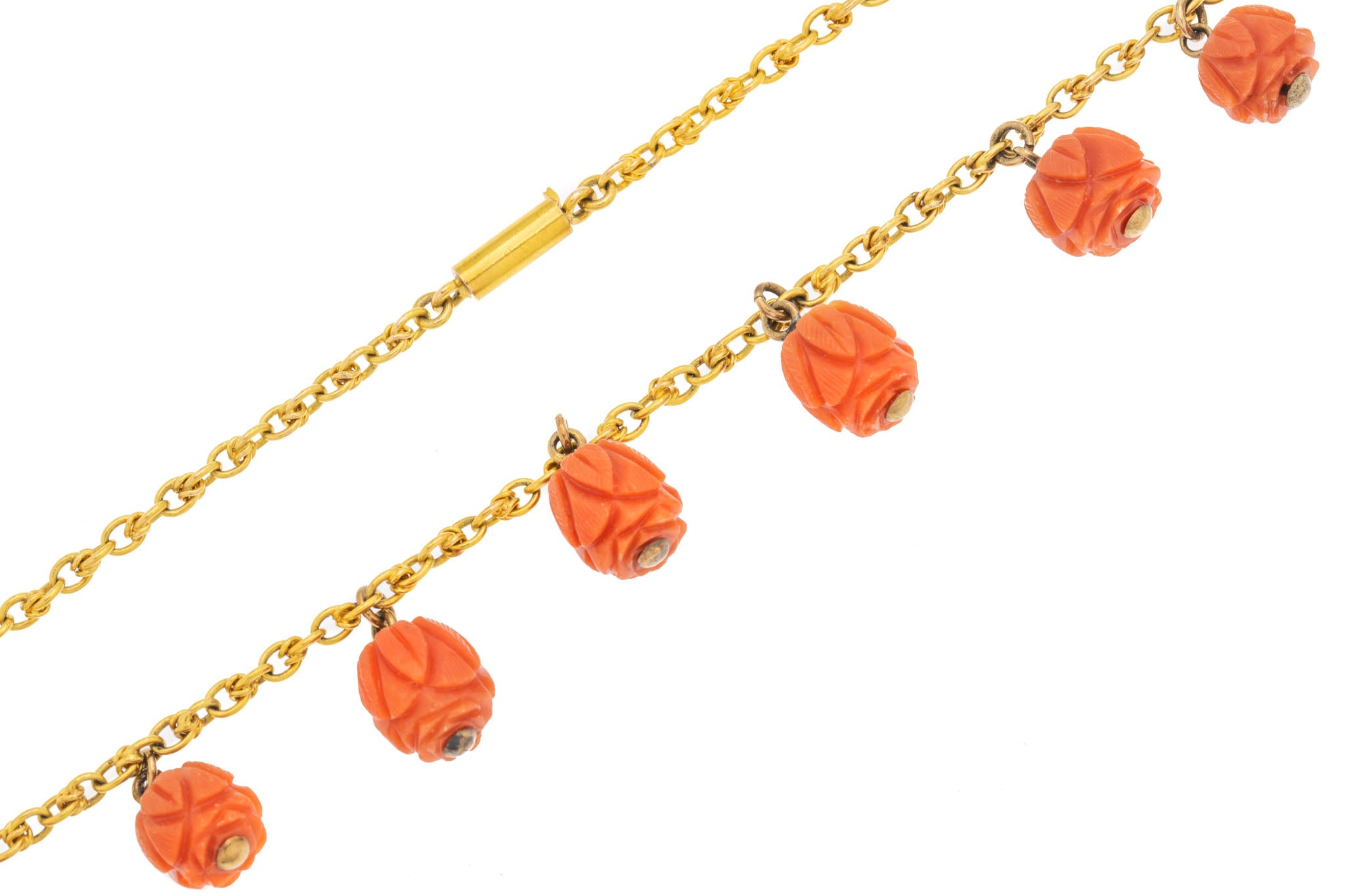 EXCELLENT: This antique 15ct Gold Coral necklace is in excellent condition. The Gold is bright and all the links are well connected, with the barrel clasp in perfect working order. Each hand-carved Coral bead is securely connected to a 15ct Gold bar. They are without any nibbles or fleabites which is incredible for their grand age. This antique necklace is definitely a statement beauty that craves to be worn straight out of the box!