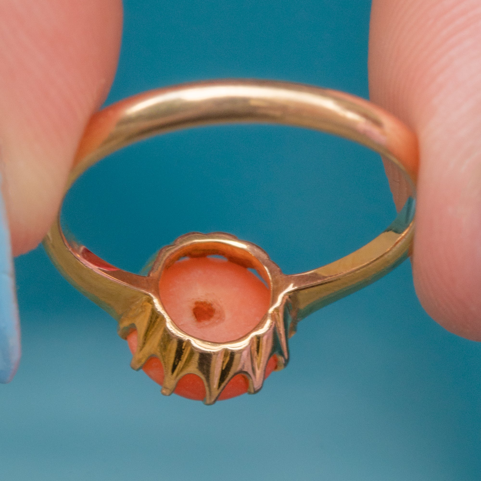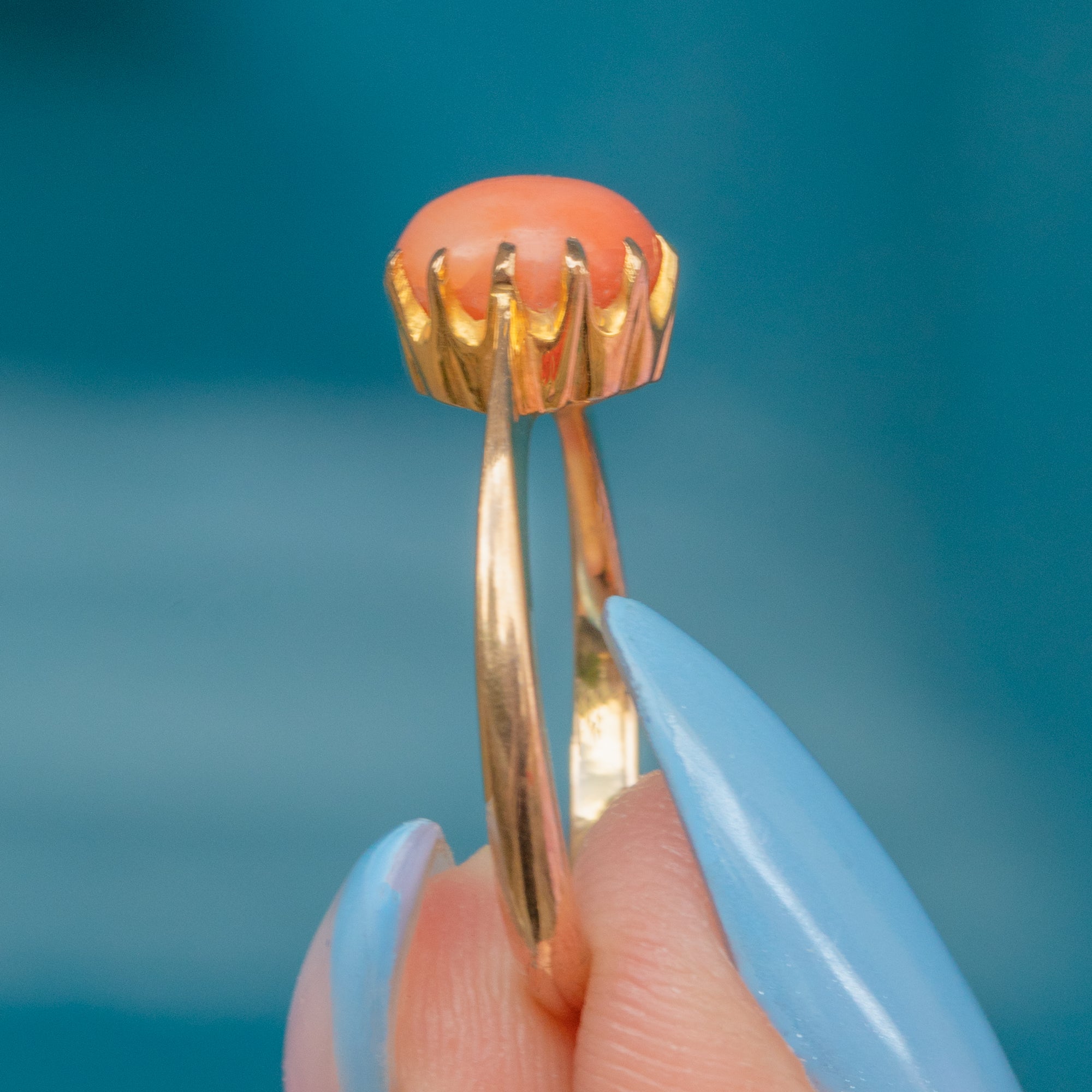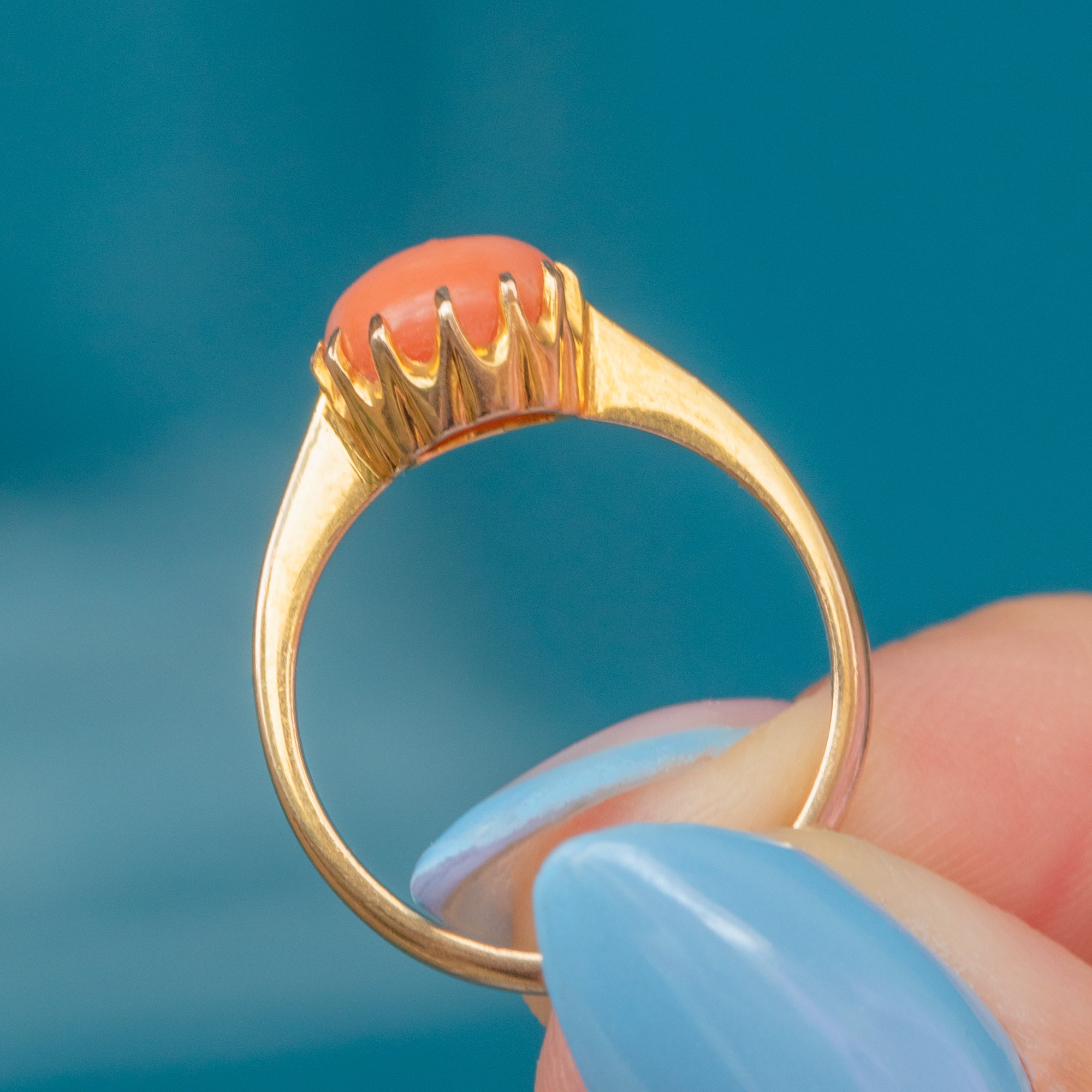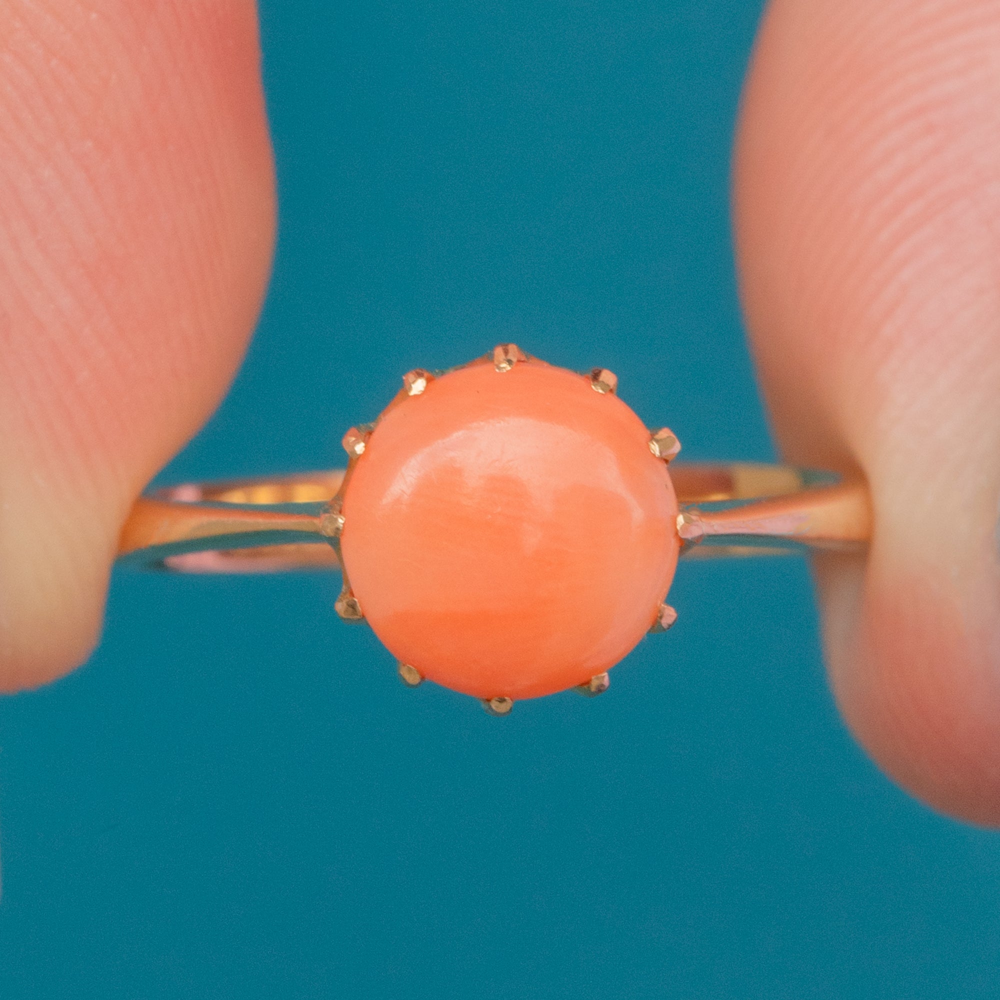 A smooth peachy Coral cabochon sits beautifully at the centre of this antique ring, set securely within glossy 15ct Gold claws for a luxurious finish.