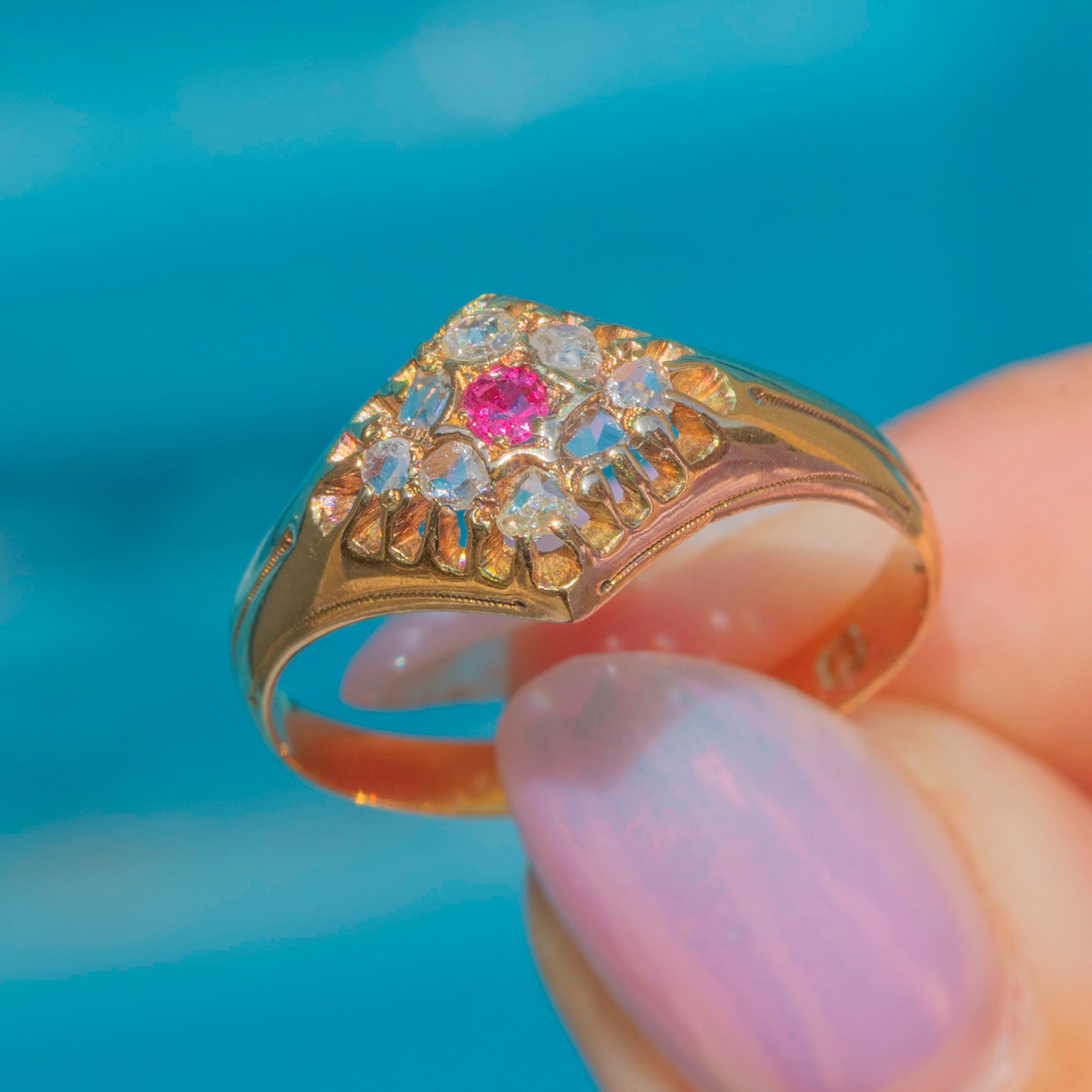 This luxurious antique Diamond Ruby ring impresses from every angle! The buttery 15ct Gold band displays a vibrant, raspberry-pink Ruby at her centre in a distinct star setting, adorned by a halo of Diamonds creating a sea of sparkle.