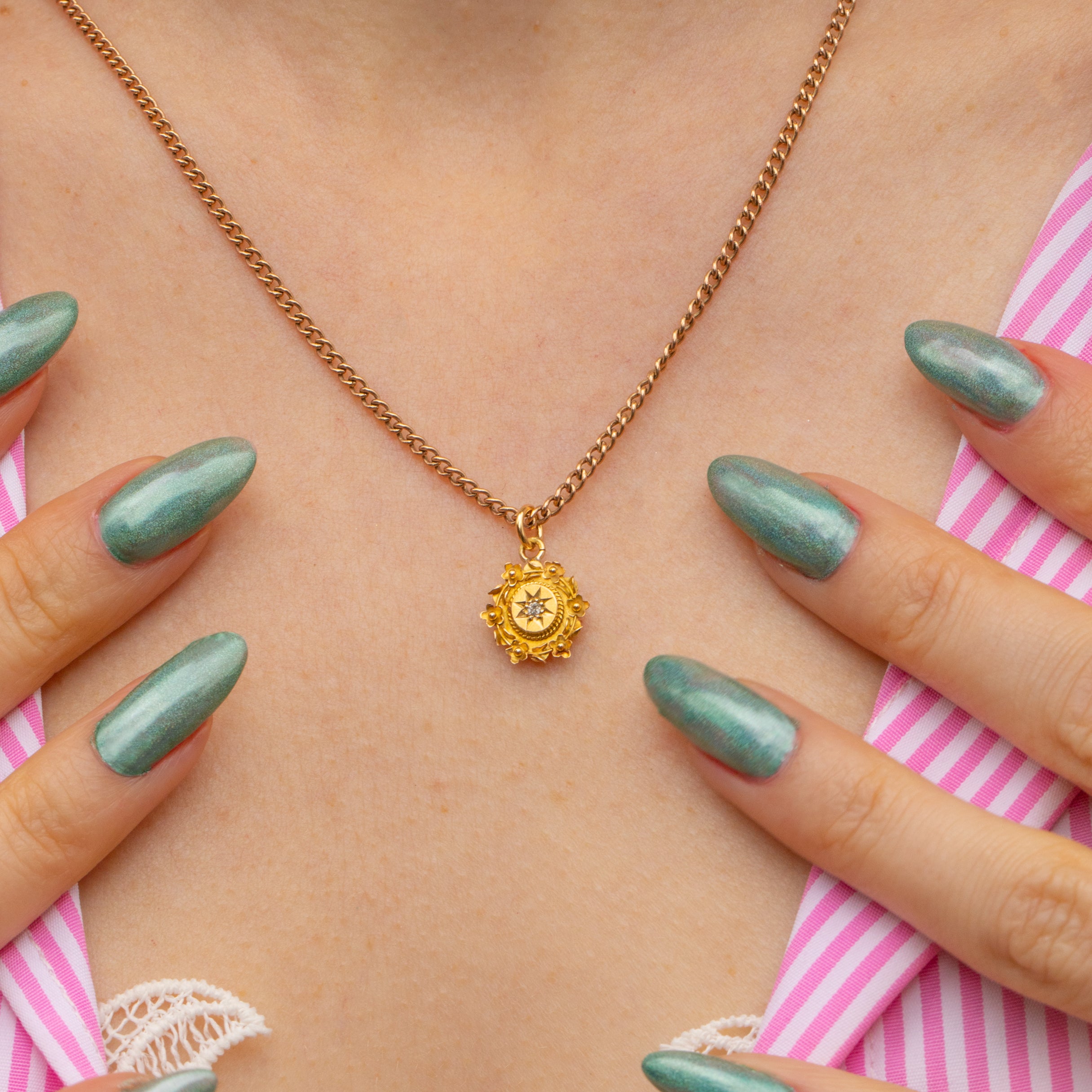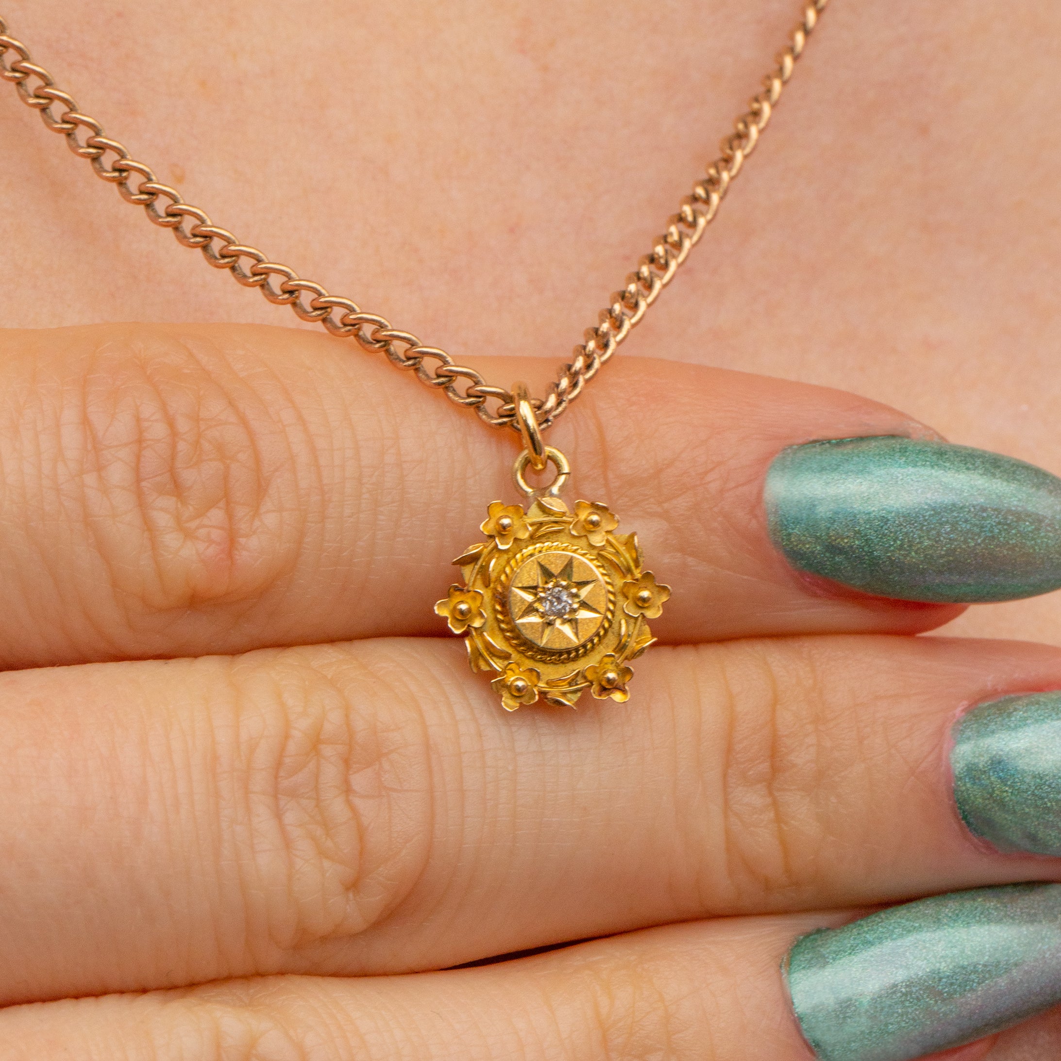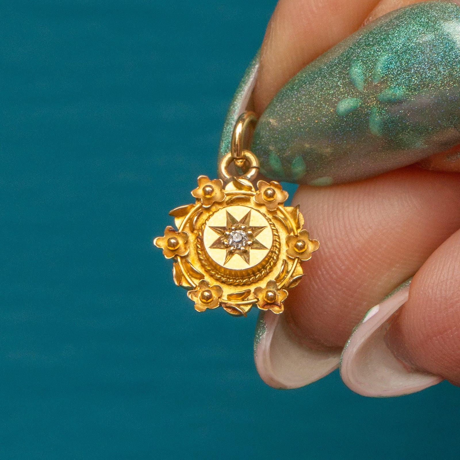 This dainty antique 15ct Gold Diamond star-set charm is a feast for the eyes! Exquisitely formed, this Etruscan revival pendant has intricately engraved floral patterns adorning her circumference with a petite twinkling Diamond flush set into a star bringing a celestial touch.