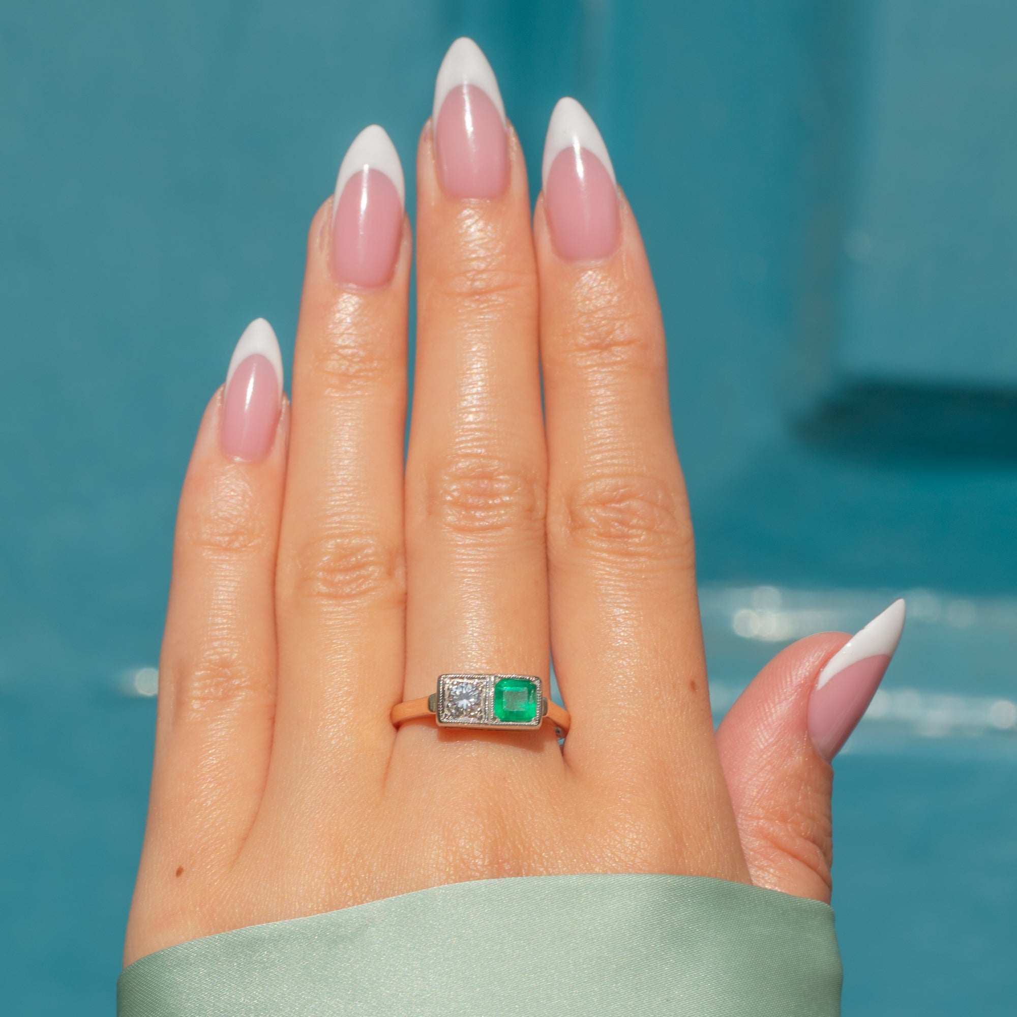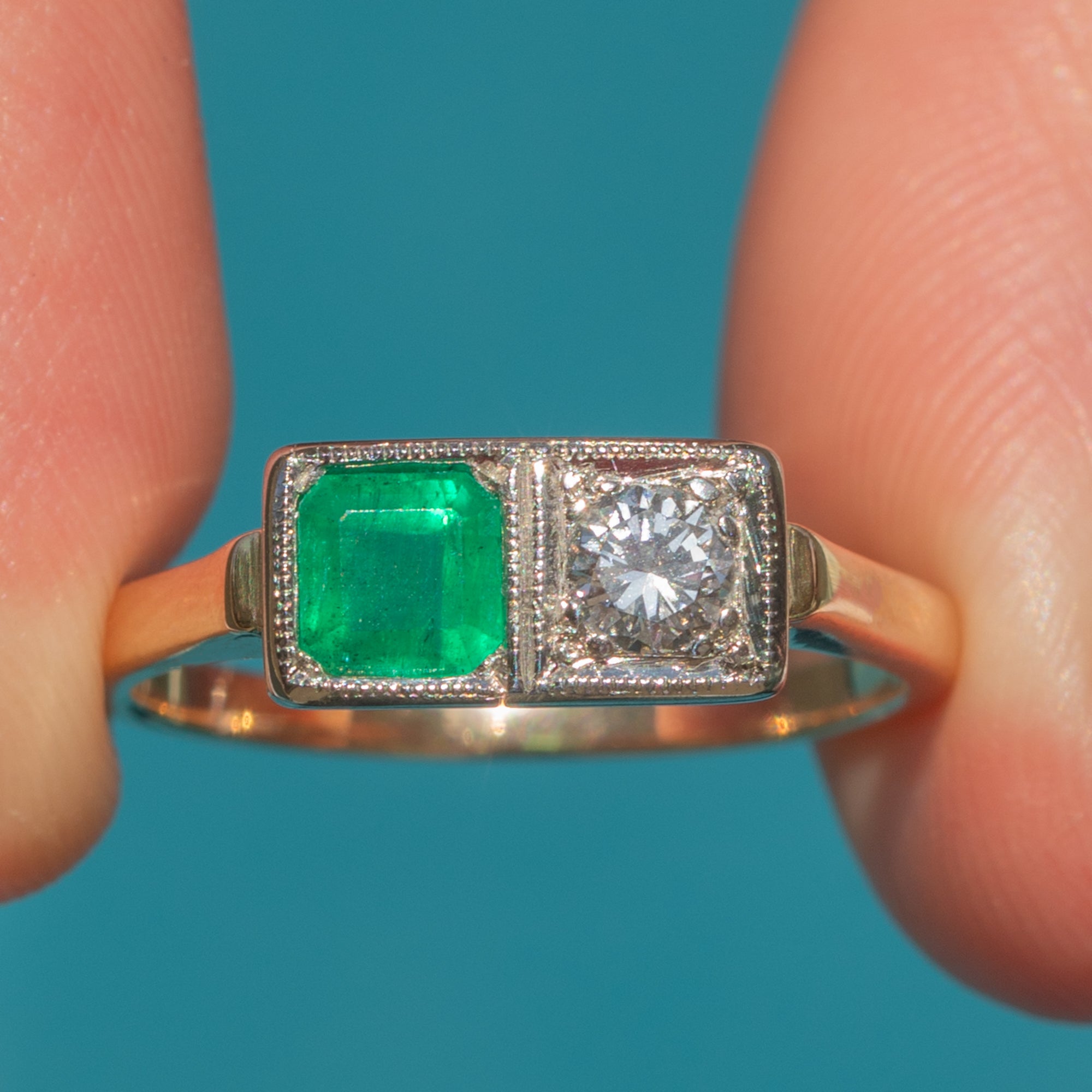 Featuring a twinkling gemstone duo, this resplendent 15ct Gold Edwardian ring is a wonderfully romantic and elegant option for your attire. In its centre sits a vibrant Emerald and scintillating Diamond set in Platinum, boasting 0.25ct and 0.17ct respectively.