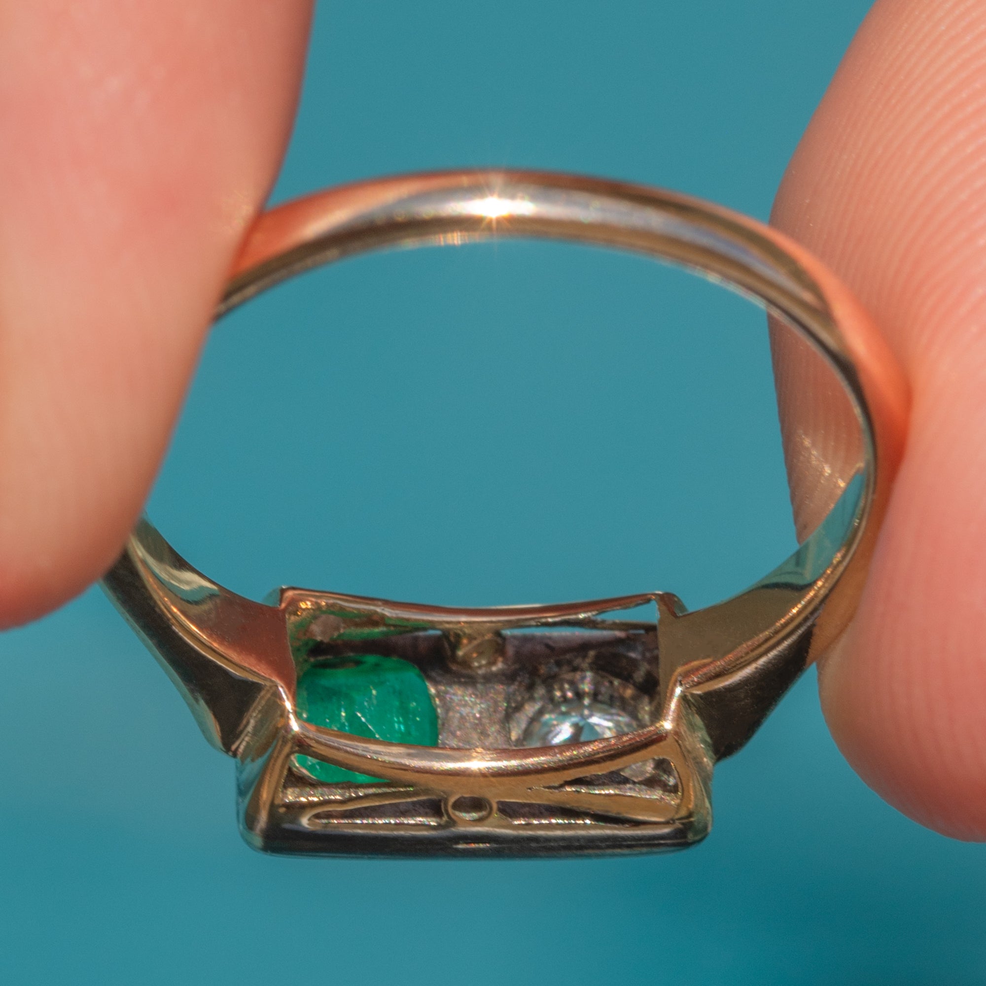 MATERIALS: Tests as 15ct Gold, Platinum settings, Emerald (0.25ct), Diamond (
