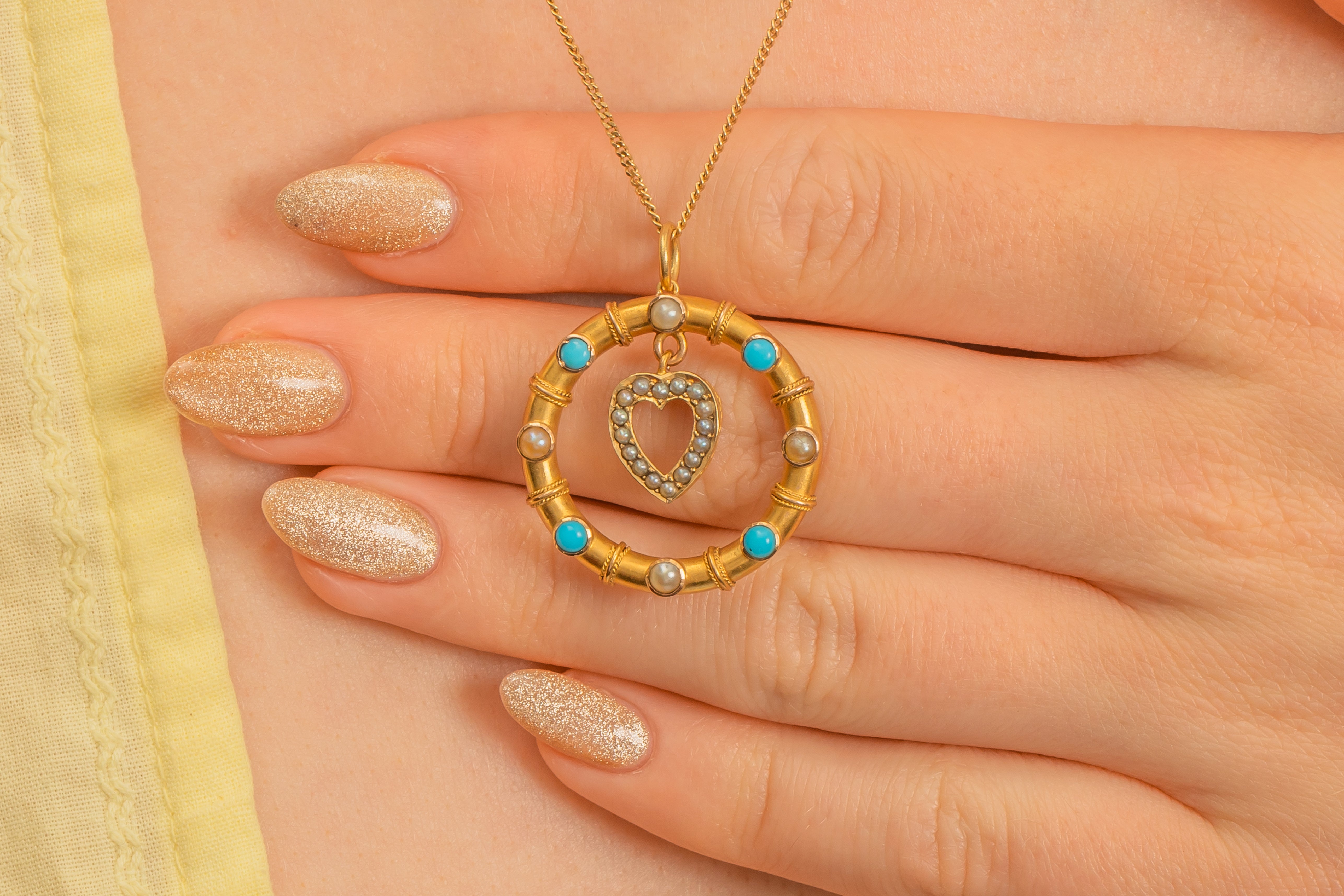 This Victorian 15ct Gold pendant has dainty Turquoise and Pearl gemstones dotted all over, complete with alternating rope detailing. This splendid piece has plenty of charm, and we think she would be in her element suspended from an antique Gold chain!