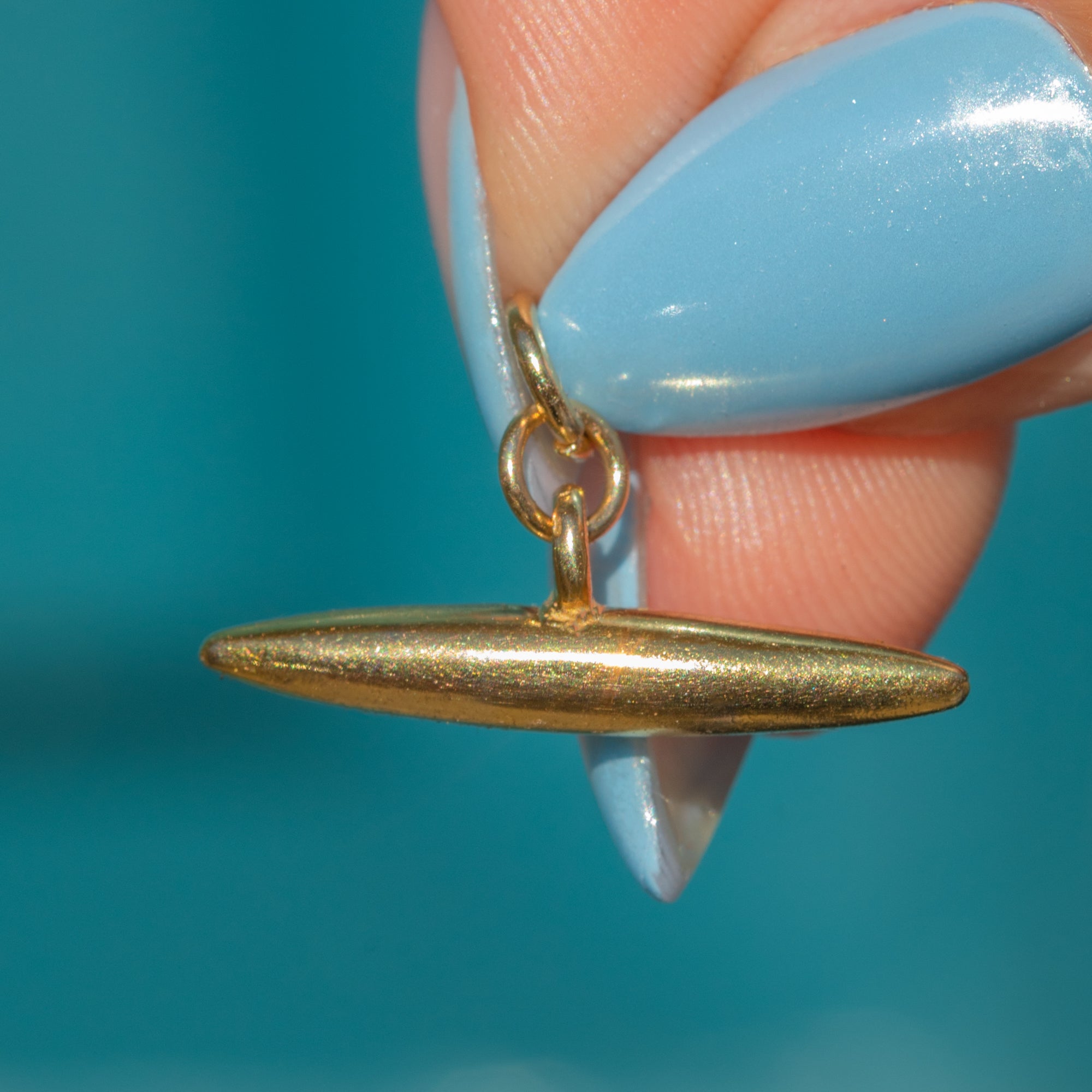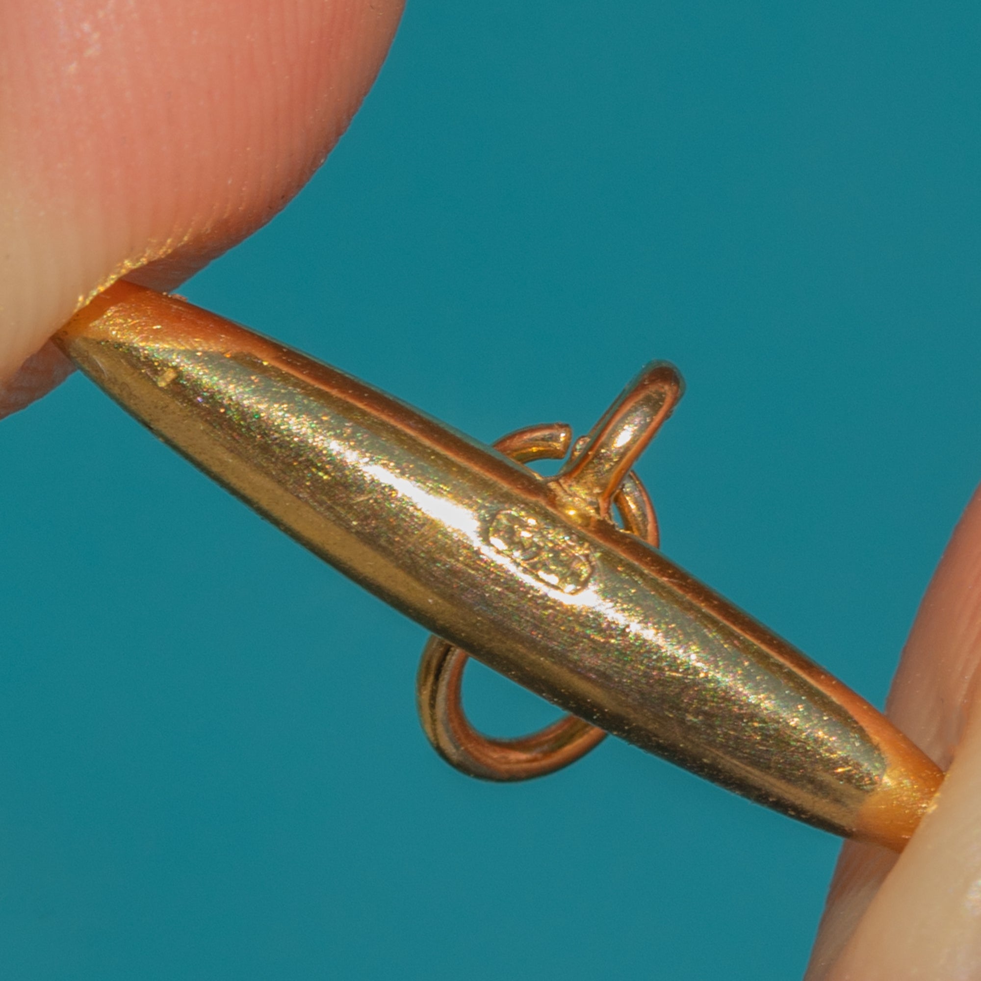 Add a slab of Gold to your repertoire with this Victorian torpedo charm! Her sleek form is crafted entirely from honey-hued 15ct Gold, possessing mouthwatering reflective qualities.