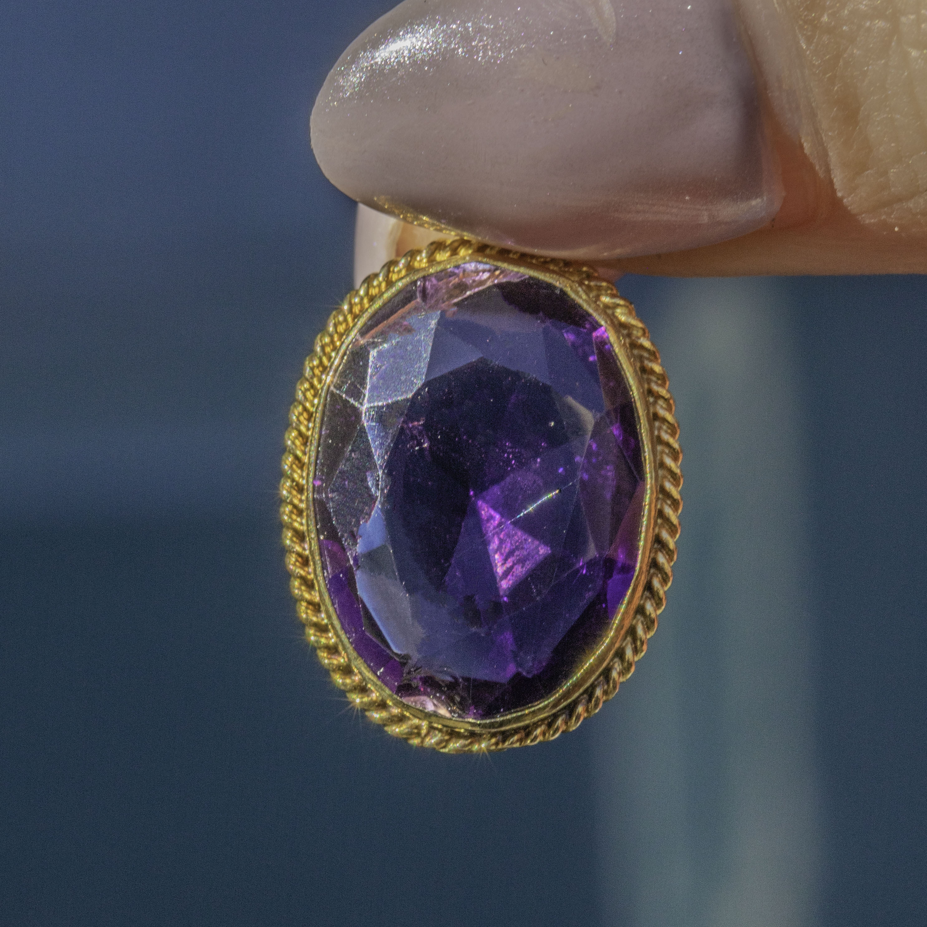 GOOD. This antique 18ct Gold Amethyst oval pendant is in good condition. Her Amethyst has a magnificent deep purple hue and facets that catch the light beautifully with some natural inclusions that can be admired when looking up close. The facets have worn slightly over time and there is a small nibble at the base of the Amethyst and a minor chip at the top, however, this is commensurate with age and reflected in the price. She is set in a brightly saturated 18ct yellow Gold bezel that holds the Amethyst securely. This antique Amethyst pendant is a must-have!
