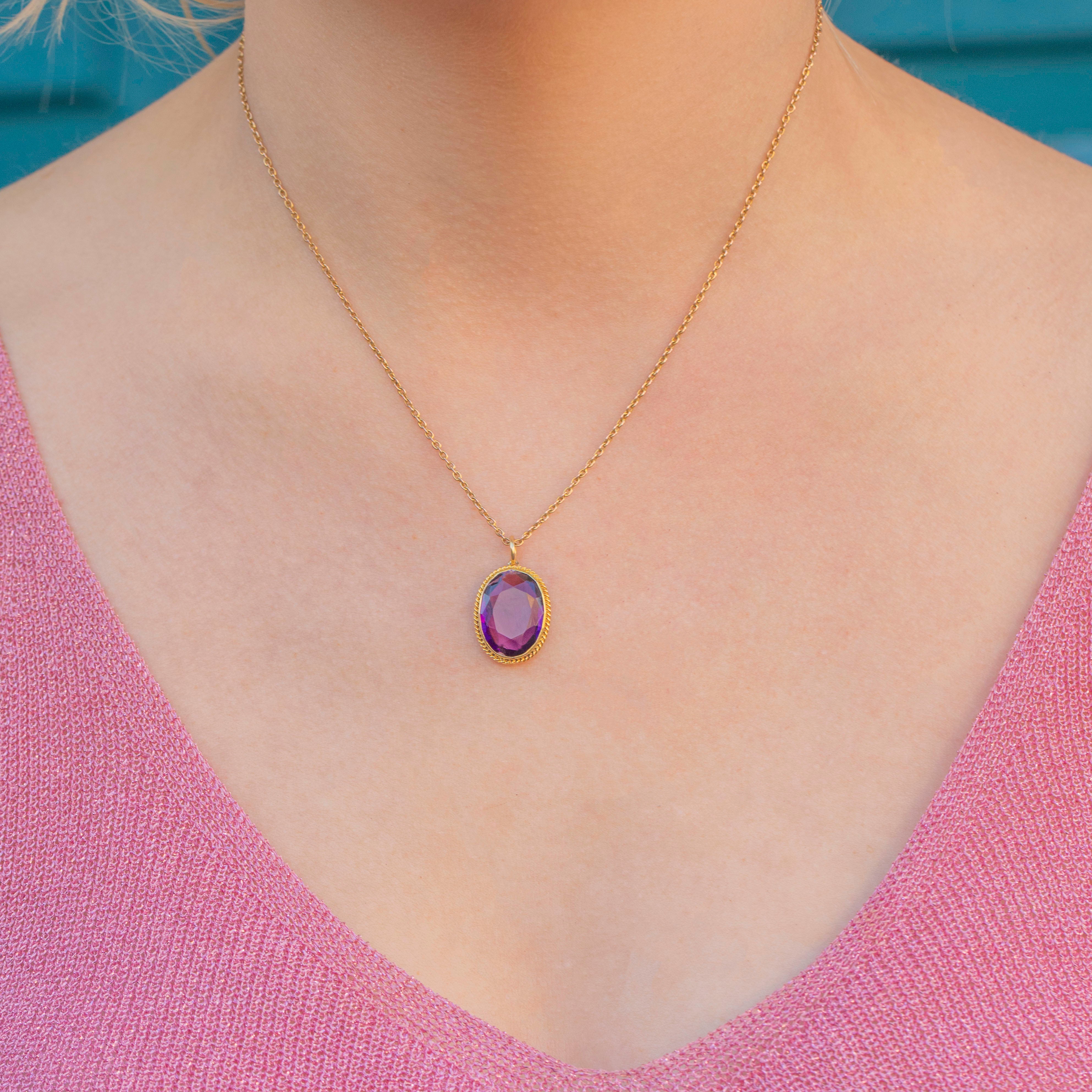 This antique 18ct Gold Amethyst Oval Pendant is a real treasure! Her rich lavender-hued 4.57ct Amethyst catches the light beautifully, revealing flashes of lilac and exuding regality and charm.