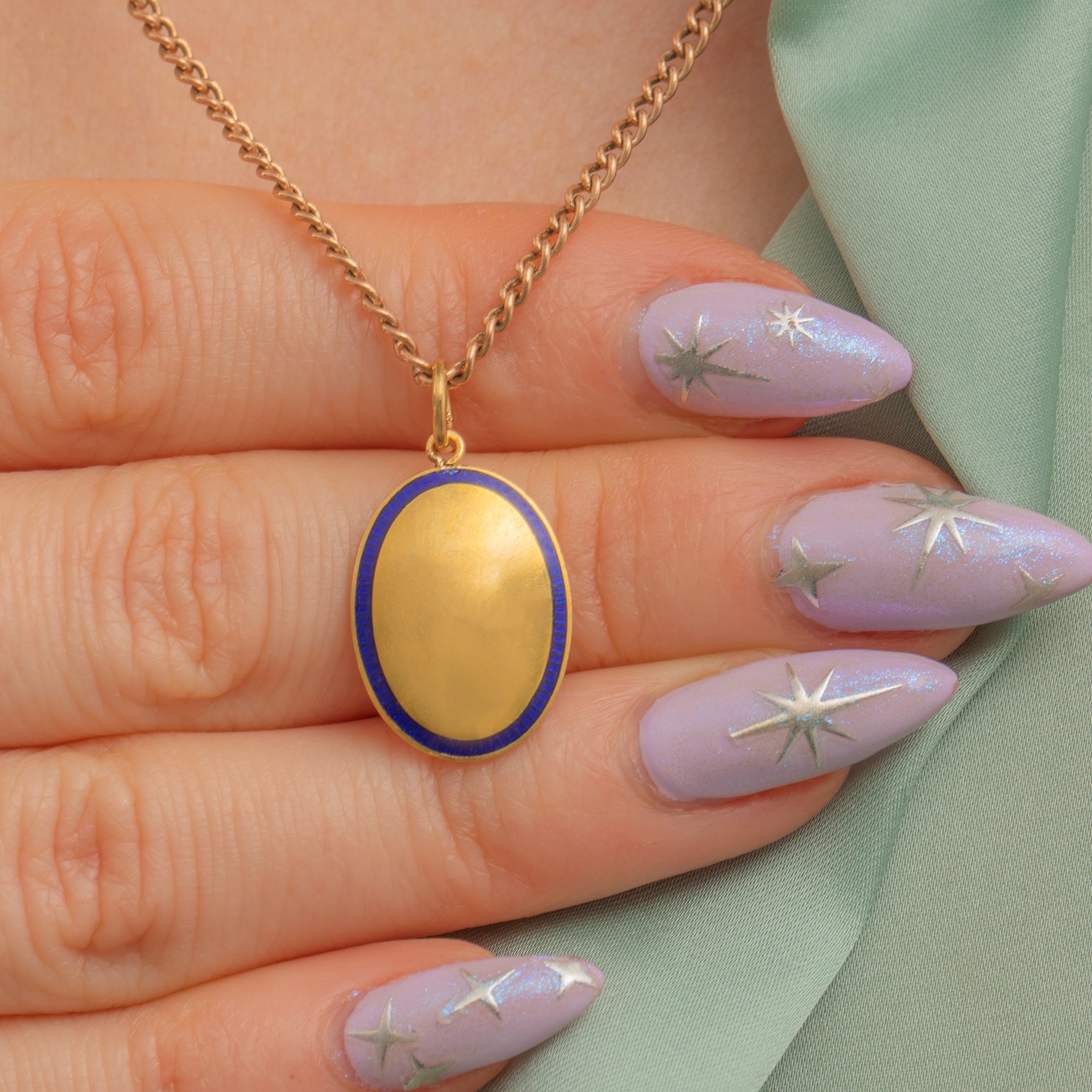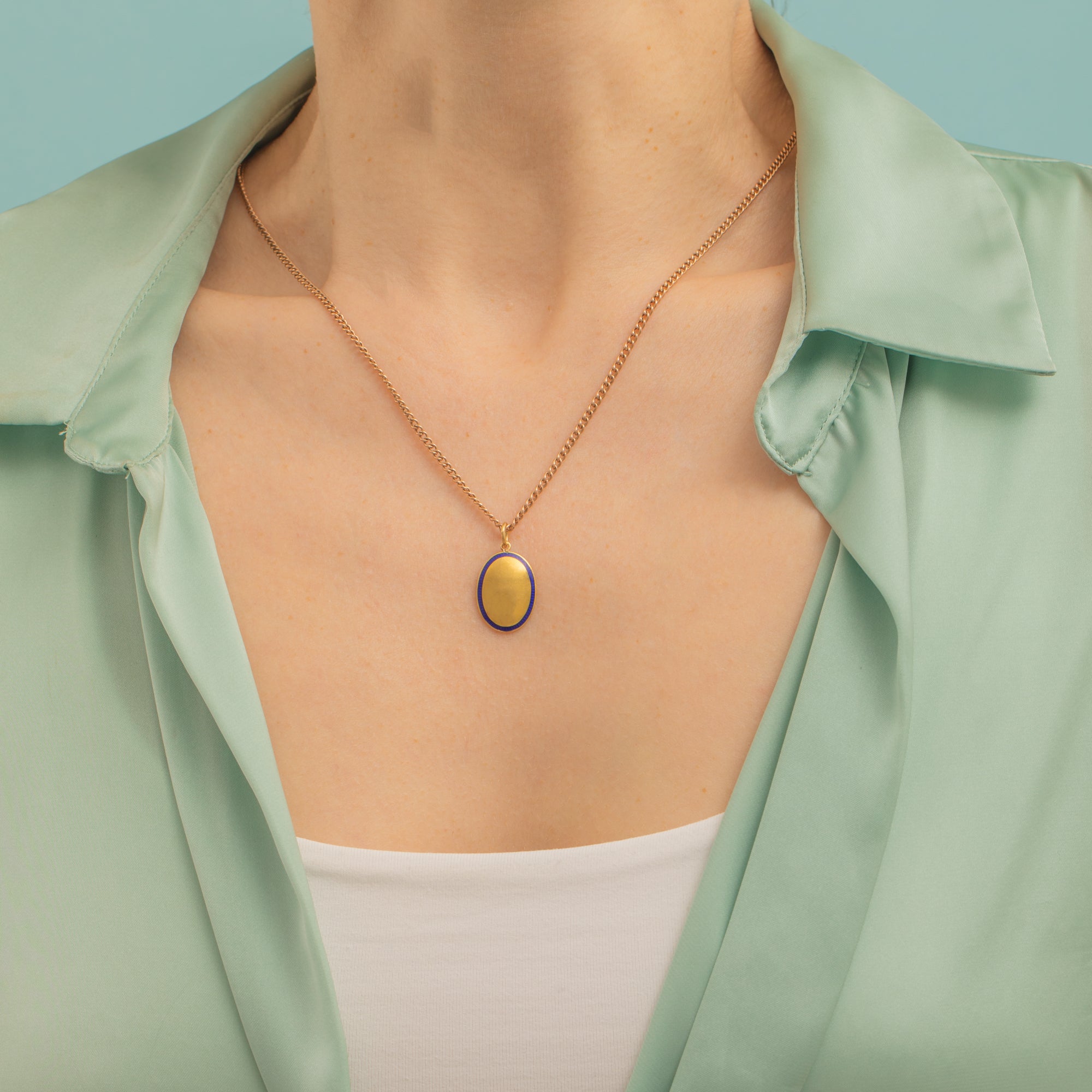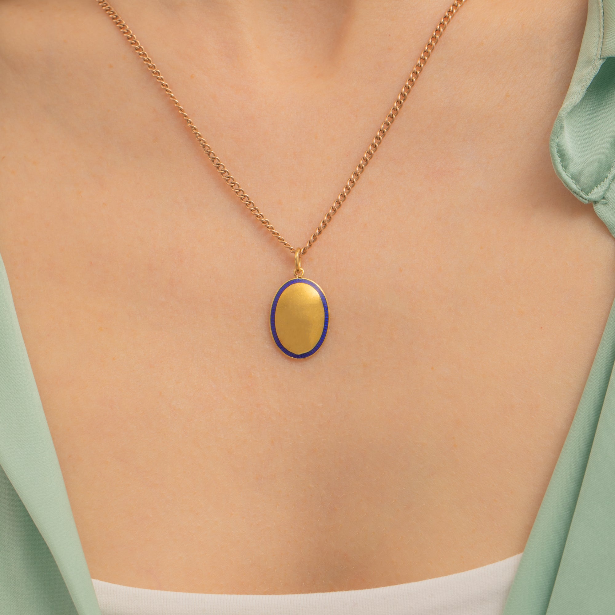 Crafted from saturated 18ct Gold, this oval pendant is delicately accented by a ring of royal blue Enamel, adding refined detail and depth. Simply suspend this Edwardian pendant from a chain to add a droplet of Gold to your attire!