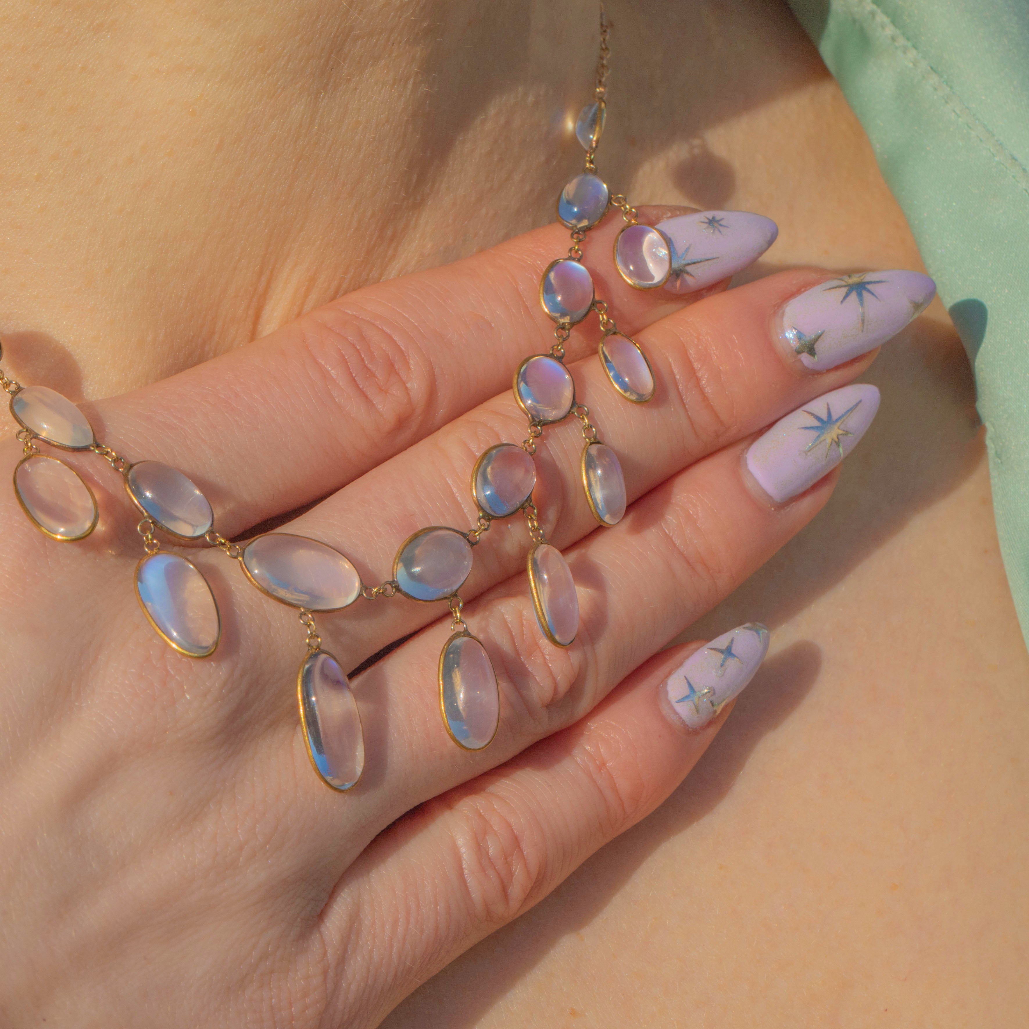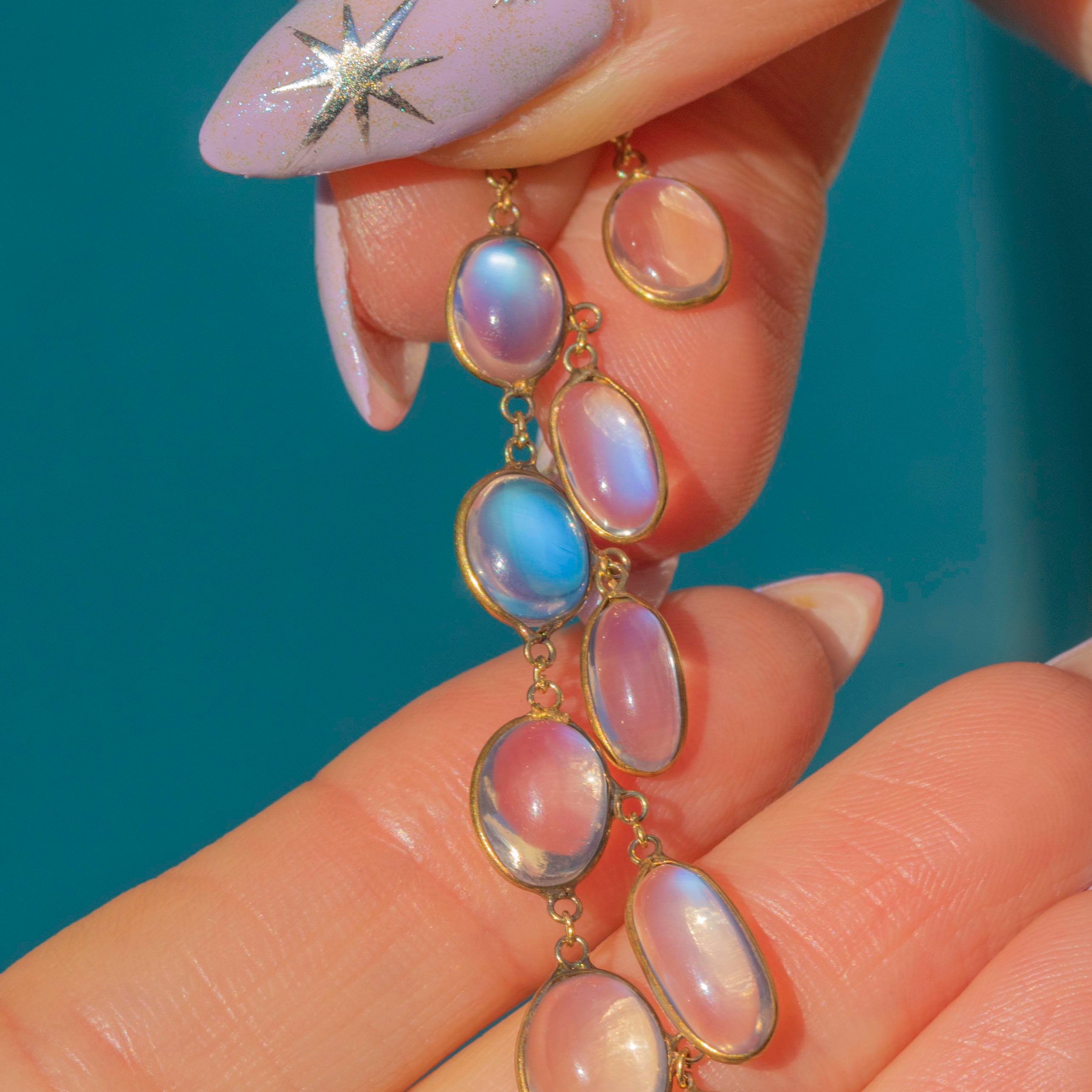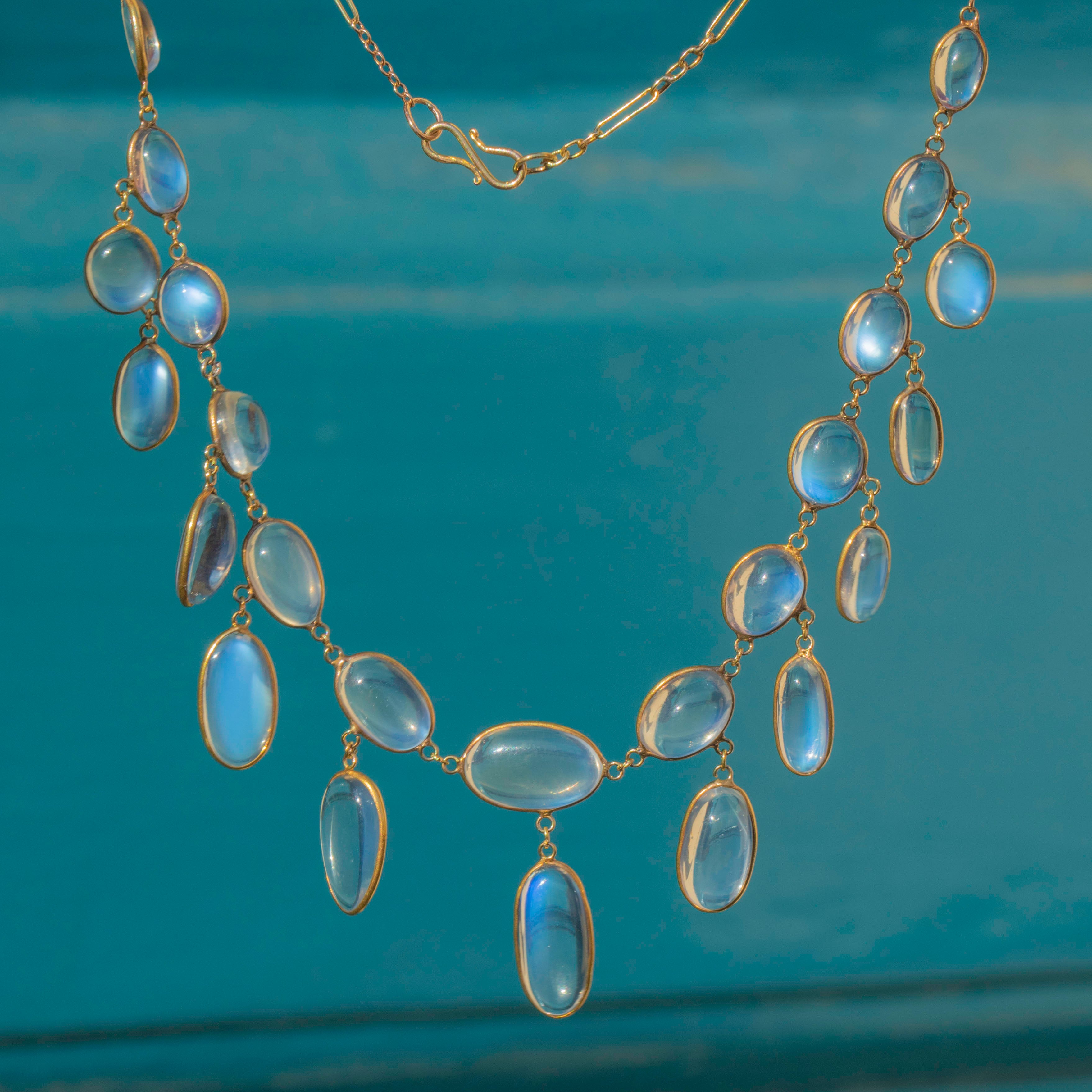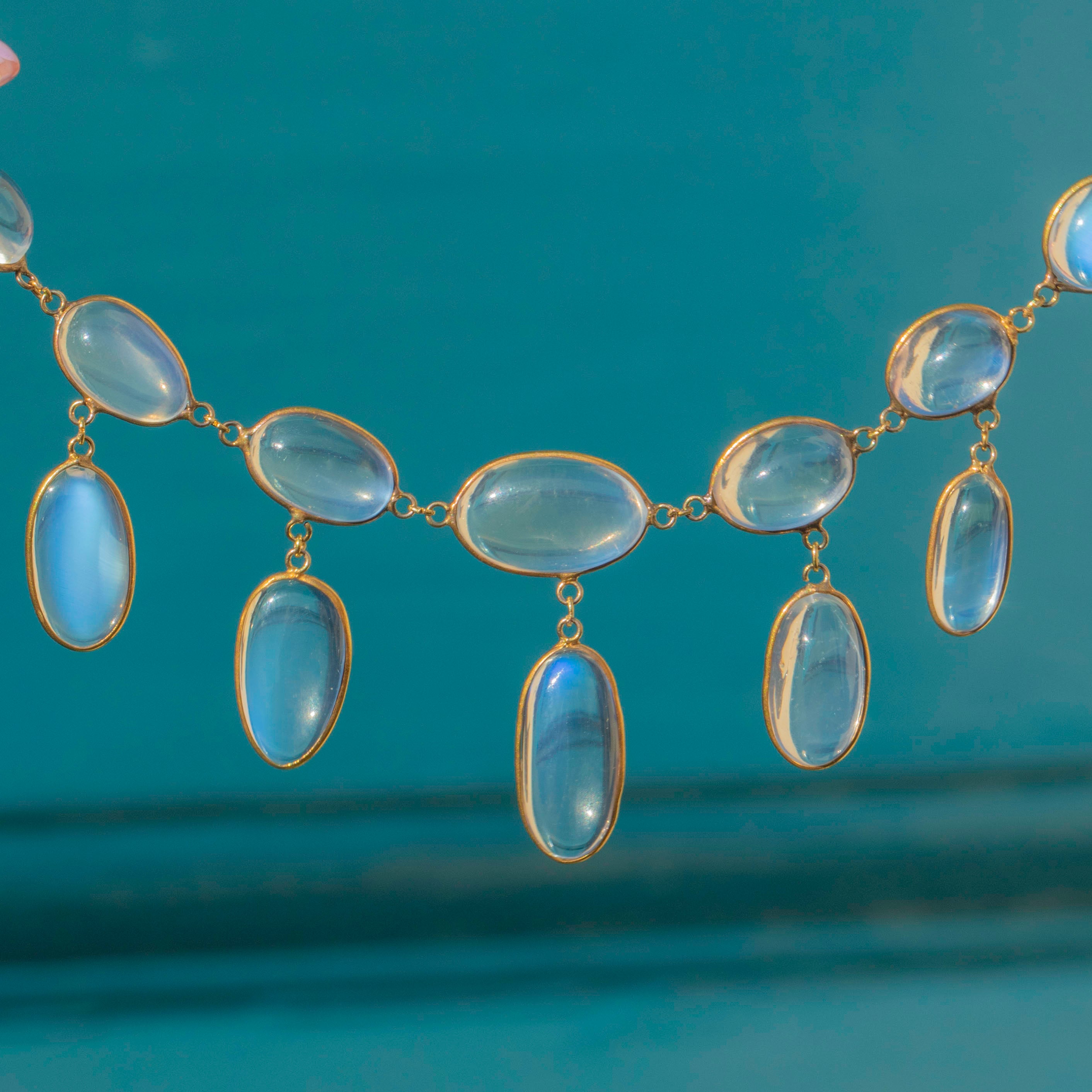 We adore how this antique fringe drapes on the neck, providing a beautiful statement while retaining an elegant sophistication. Each Ceylon Moonstone has a delightful blue adularescence, for which antique Moonstone is so desired; this piece is steeped in Victorian elegance, a true reflection of the era itself!