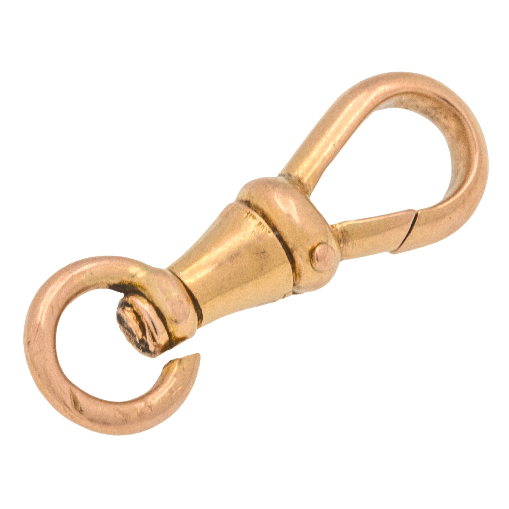 VERY GOOD. This antique 18ct Gold dog-clip charm holder is offered in very good condition. The Gold has an even saturation throughout and will attend to all of your charm holding needs! The clip mechanism functions well, but it does prefer moving to the left side upon opening. The dog-clip does also have a small hairline crack that is visible running down the centre when looking at the clasp mechanism, but this does not effect how she can be used, still functioning beautifully. Most importantly, the dog clip has excellent spring-back and will hold any charm safely in place.