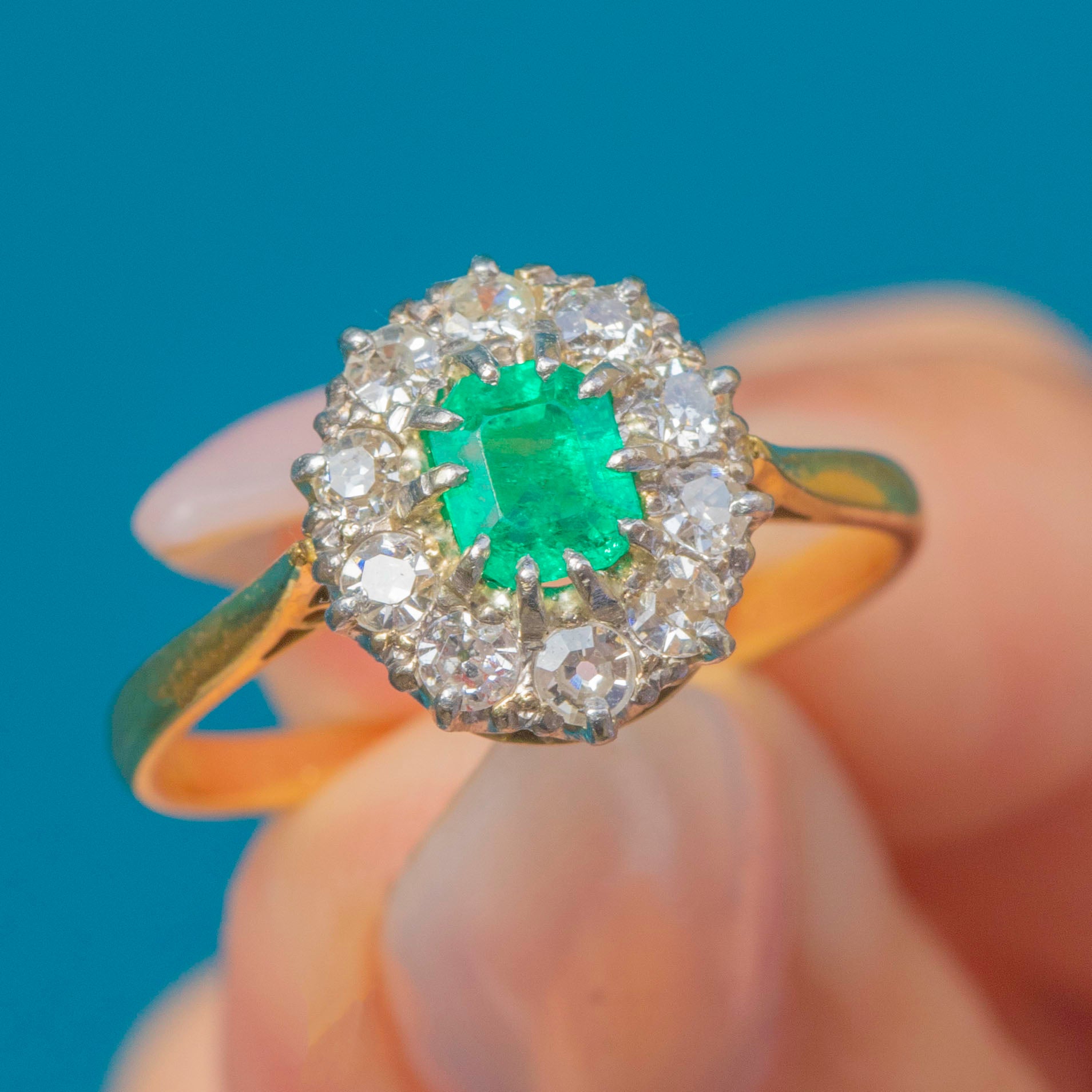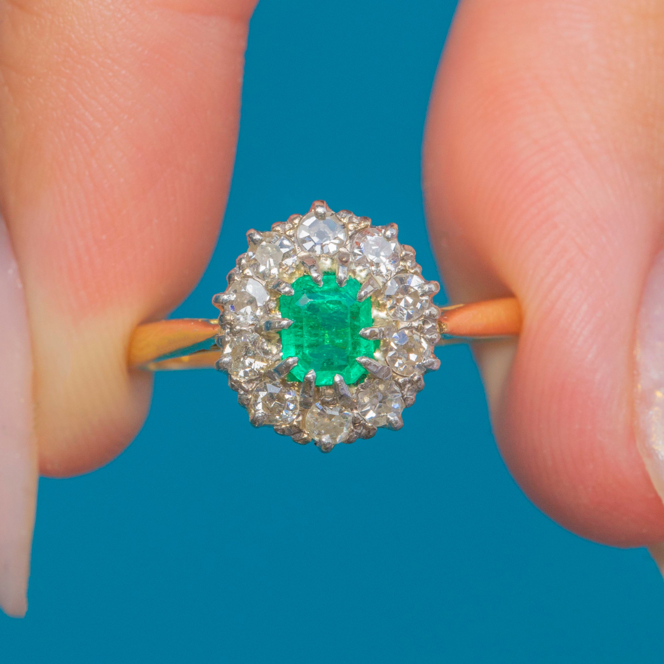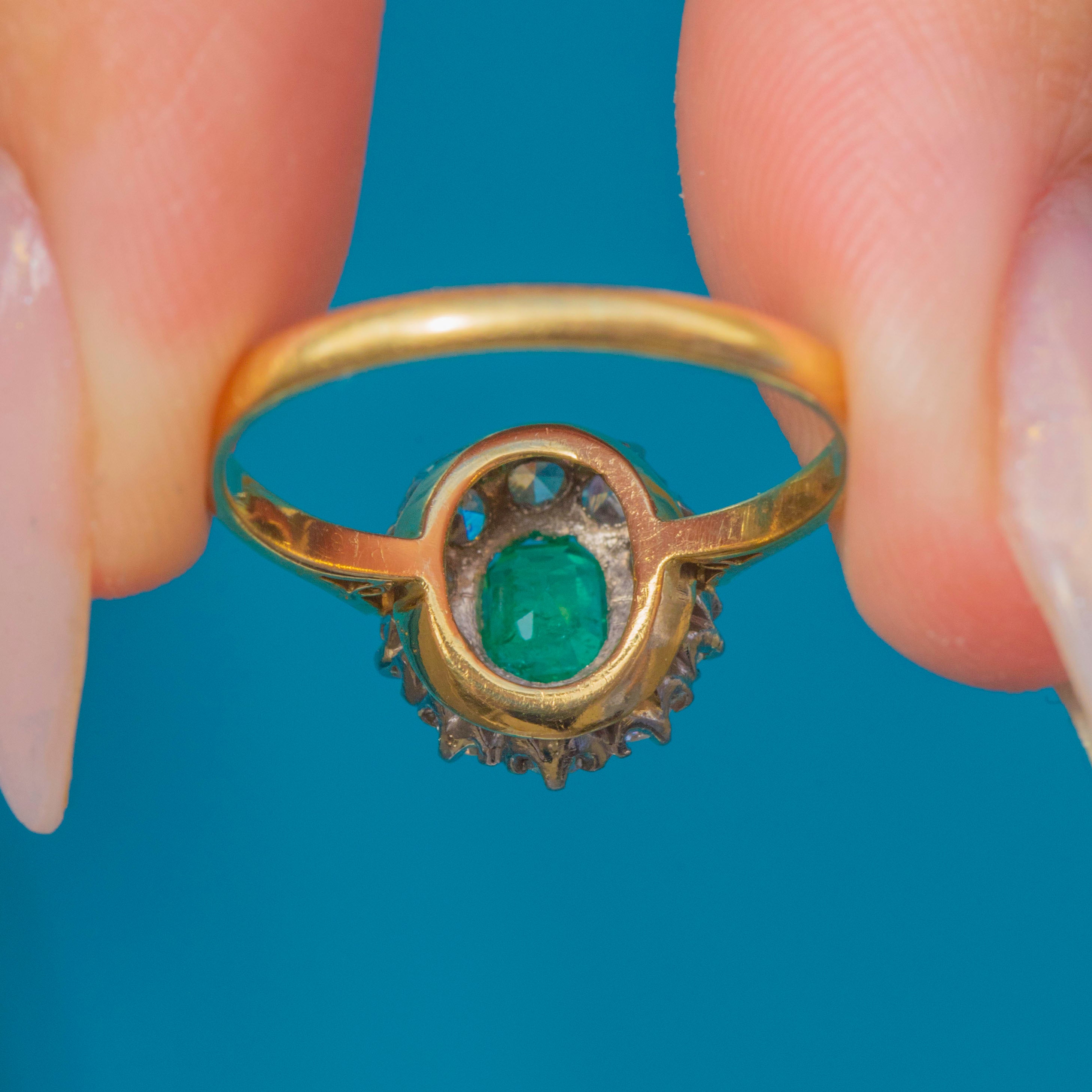 Antique 18ct Gold Emerald Diamond Cluster Engagement Ring