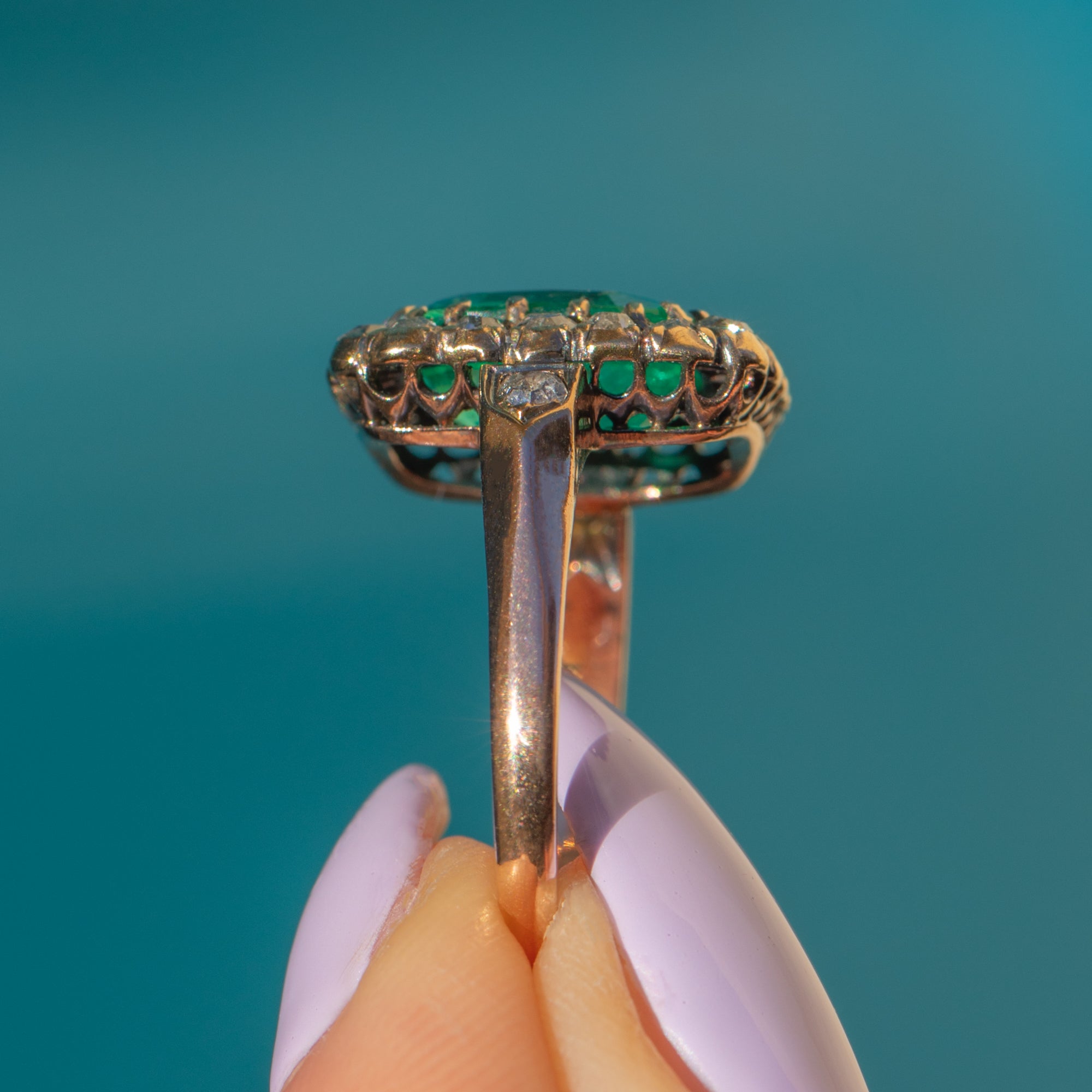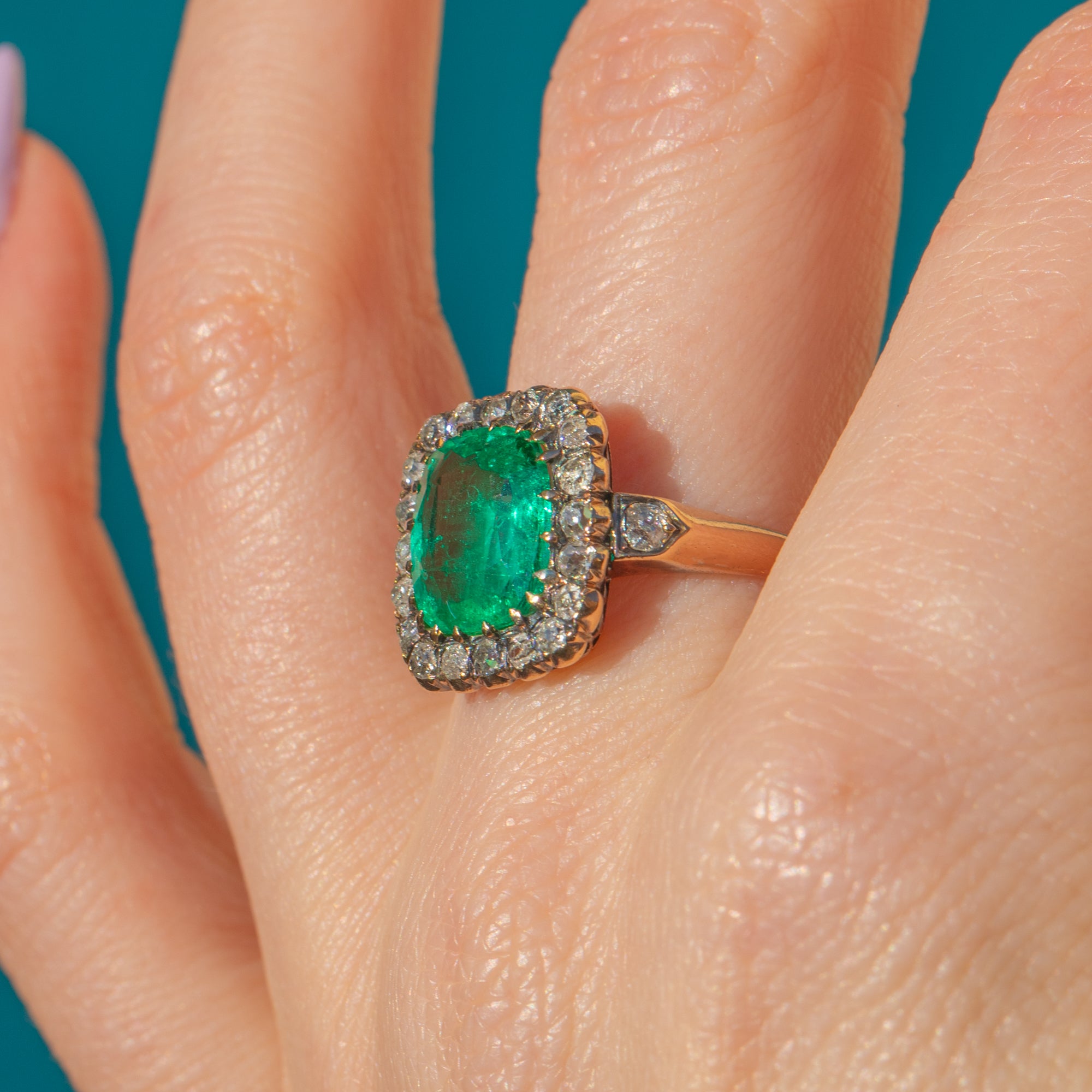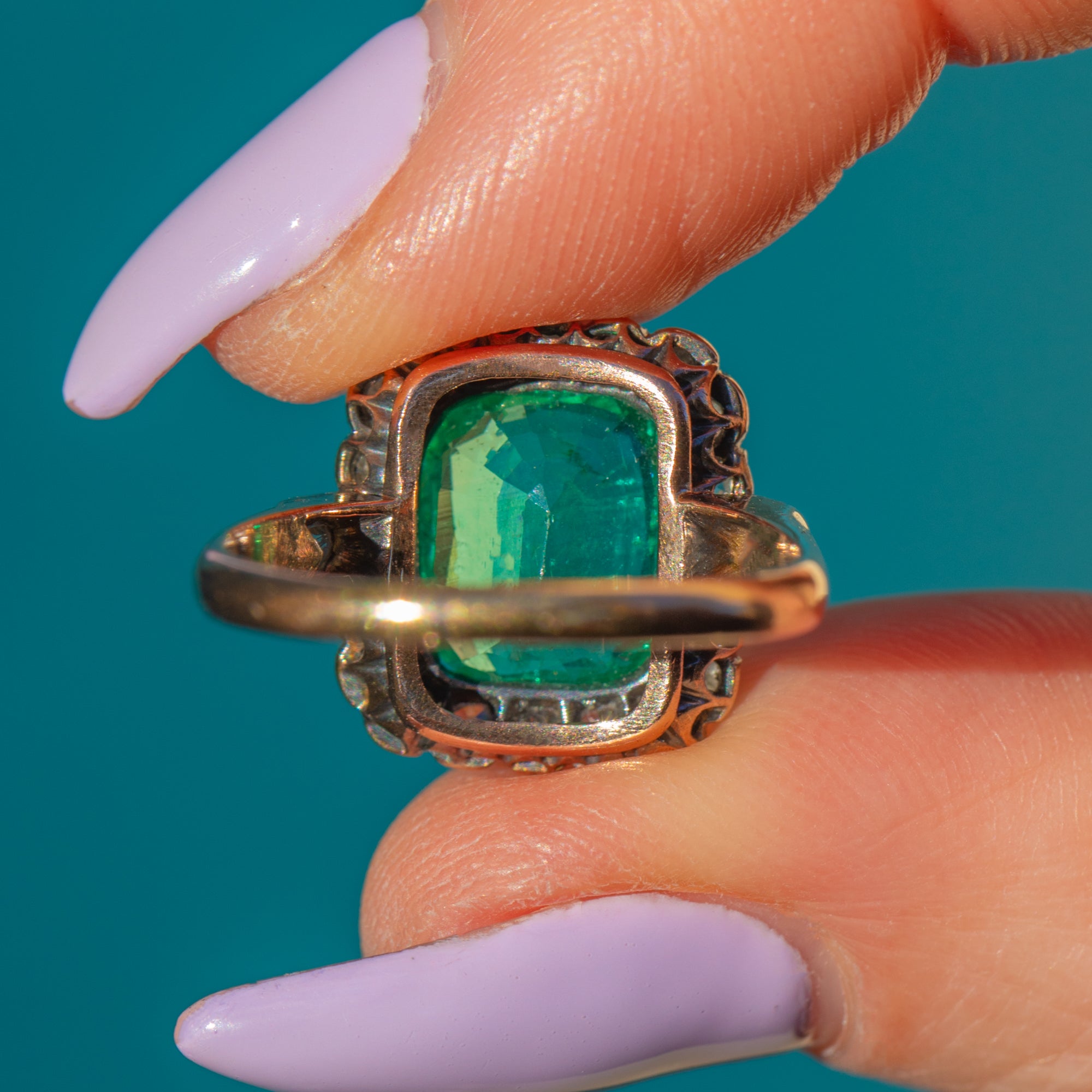 Set atop a rich 18ct Gold shank, the deep, velvety green Emerald contrasts beautifully against the mesmerising sparkle of over three quarters of a carat antique rose-cut Diamonds, creating an irresistible harmony of elegance and prestige. Whether chosen as an engagement ring or a once-in-a-lifetime treat, this exceptional piece is a true statement of sophistication and romance—a jewell fit for royalty!