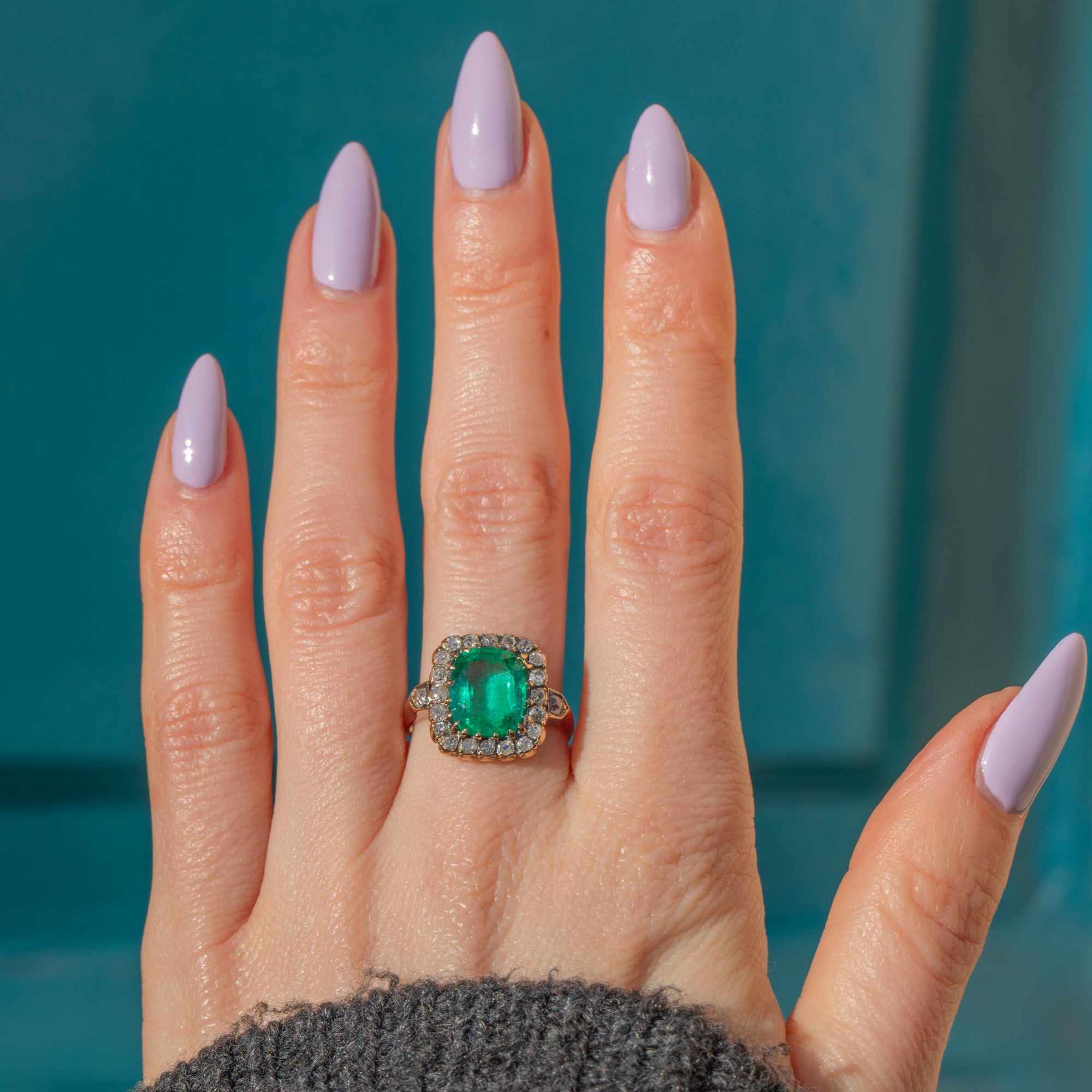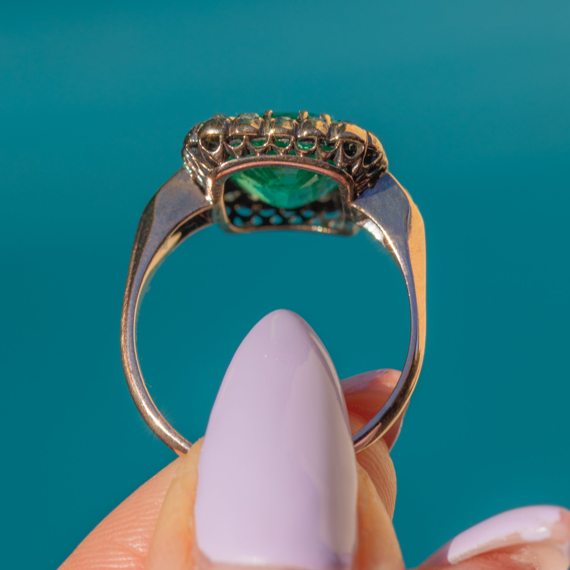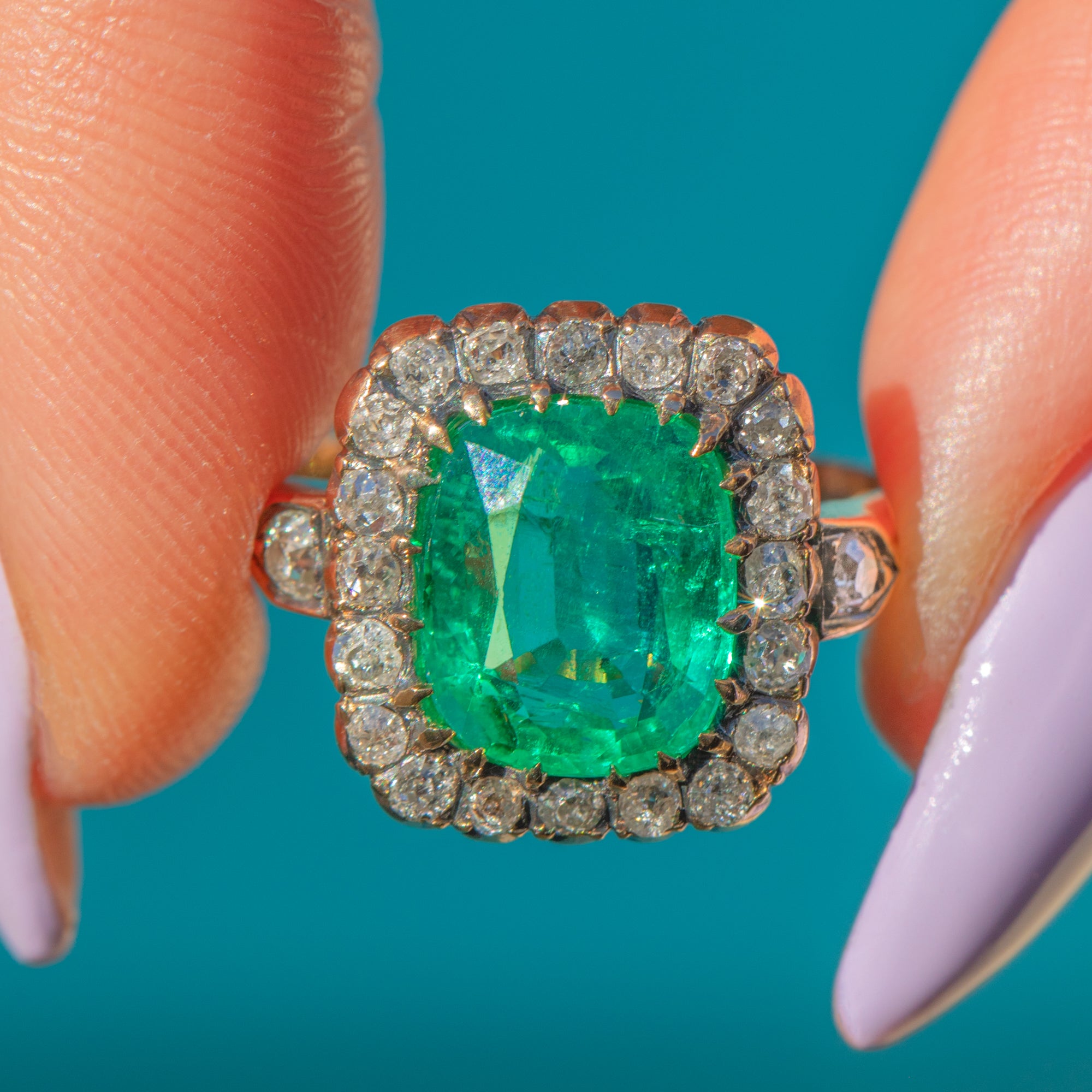 Set atop a rich 18ct Gold shank, the deep, velvety green Emerald contrasts beautifully against the mesmerising sparkle of over three quarters of a carat antique rose-cut Diamonds, creating an irresistible harmony of elegance and prestige. Whether chosen as an engagement ring or a once-in-a-lifetime treat, this exceptional piece is a true statement of sophistication and romance—a jewell fit for royalty!
