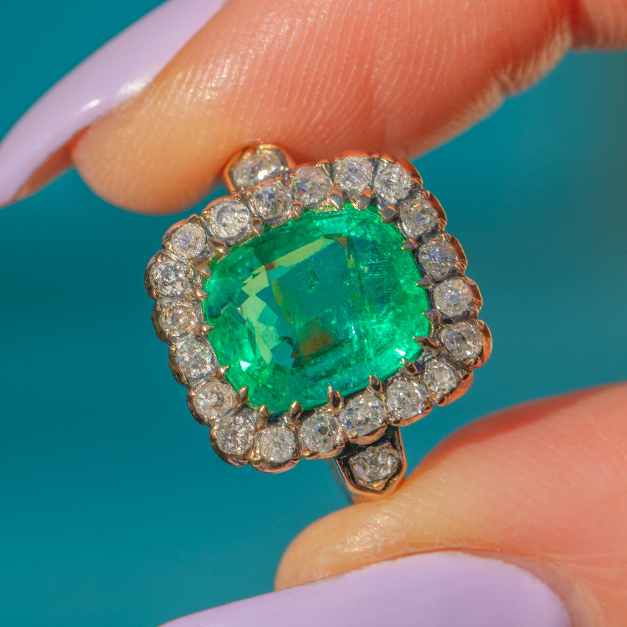VERY GOOD. This exquisite antique 18ct Gold Emerald & Diamond cluster ring is in very good condition, with all gemstones securely set and the Diamonds retaining their exceptional sparkle. The stunning 3.90ct Emerald boasts a rich, vibrant green hue, with natural inclusions typical of Emeralds, adding to her unique character. There is some evidence of previous resizing to the shank, but this does not affect the ring’s beauty or wearability.