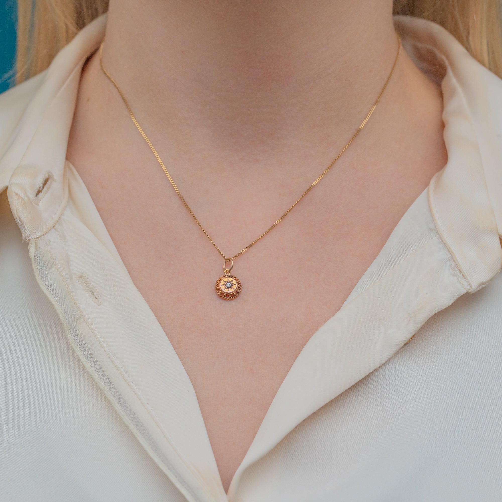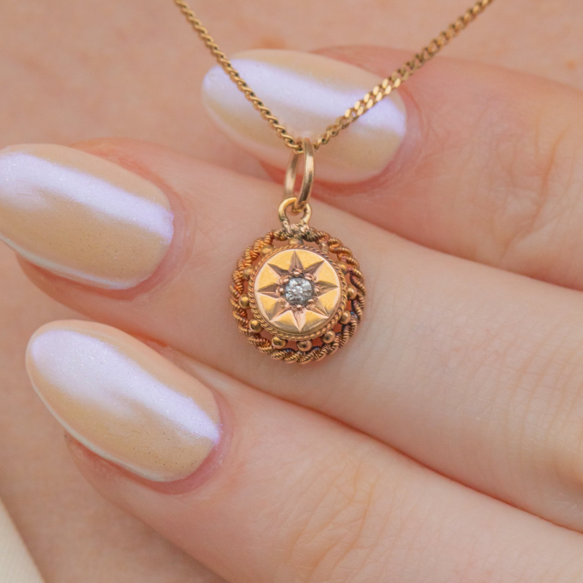 Crafted from solid buttery 18ct Gold, this Victorian charm showcases a star-set twinkling Diamond at her centre surrounded by intricate details for a refined finish. This Etruscan beauty will look exquisite suspended from a dainty Gold chain!