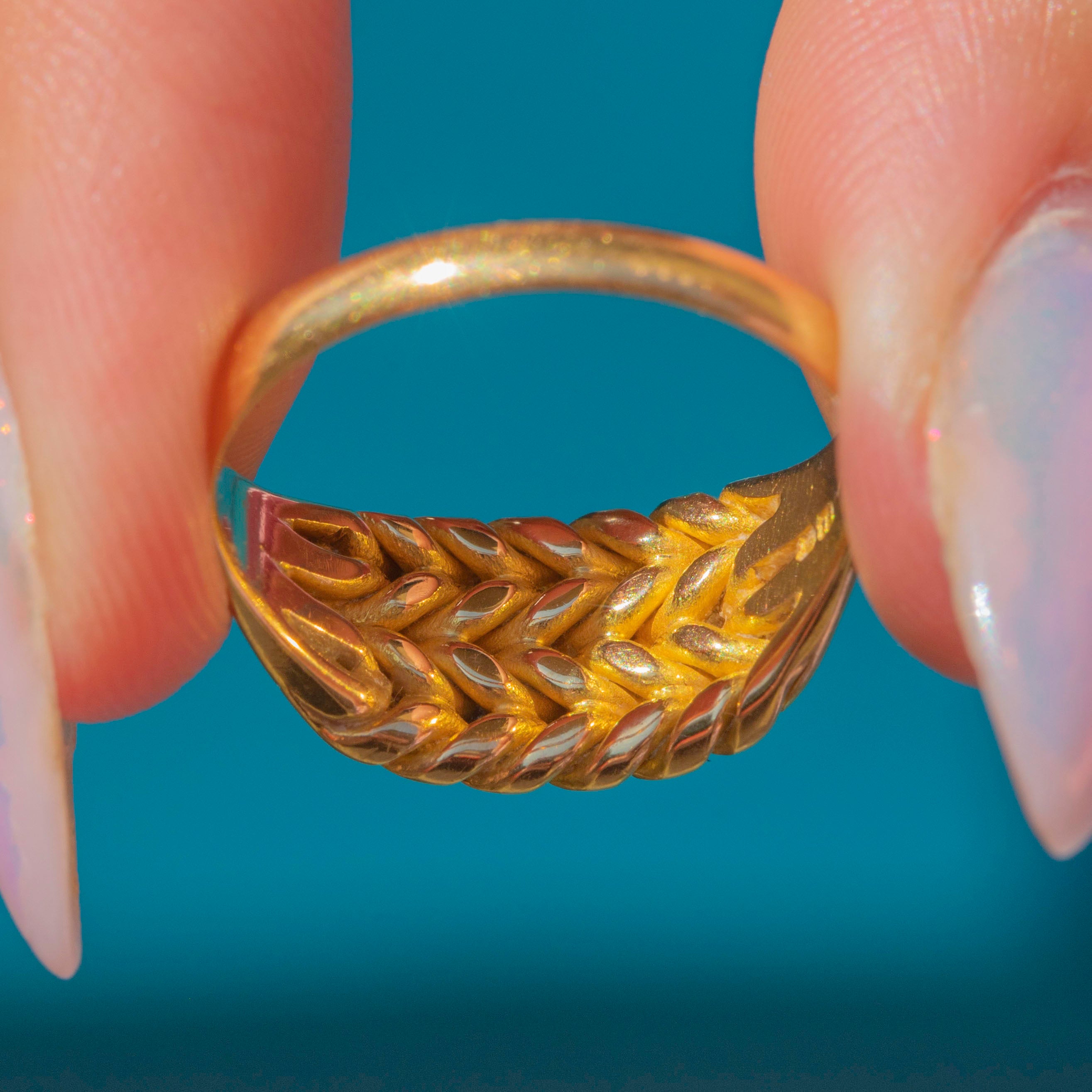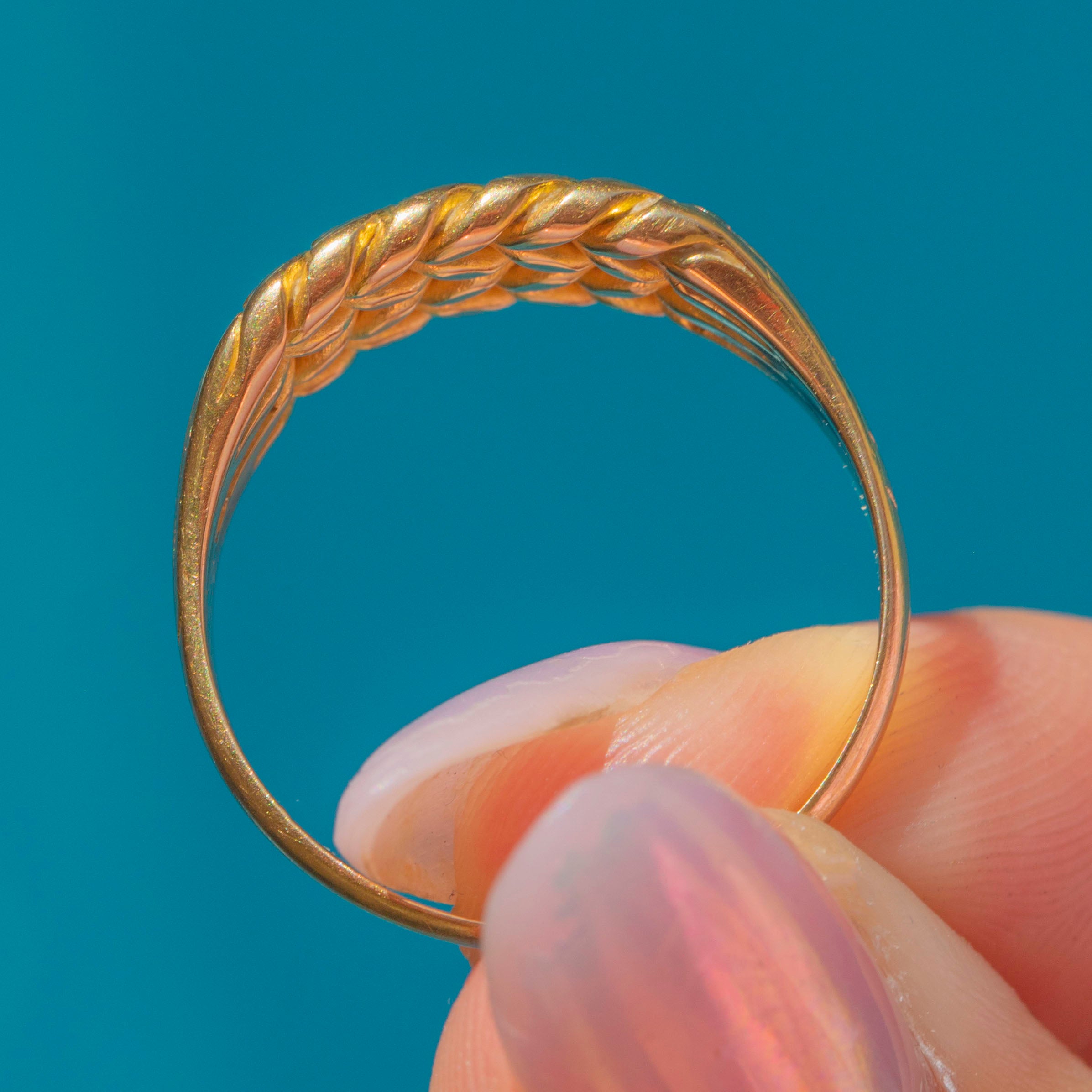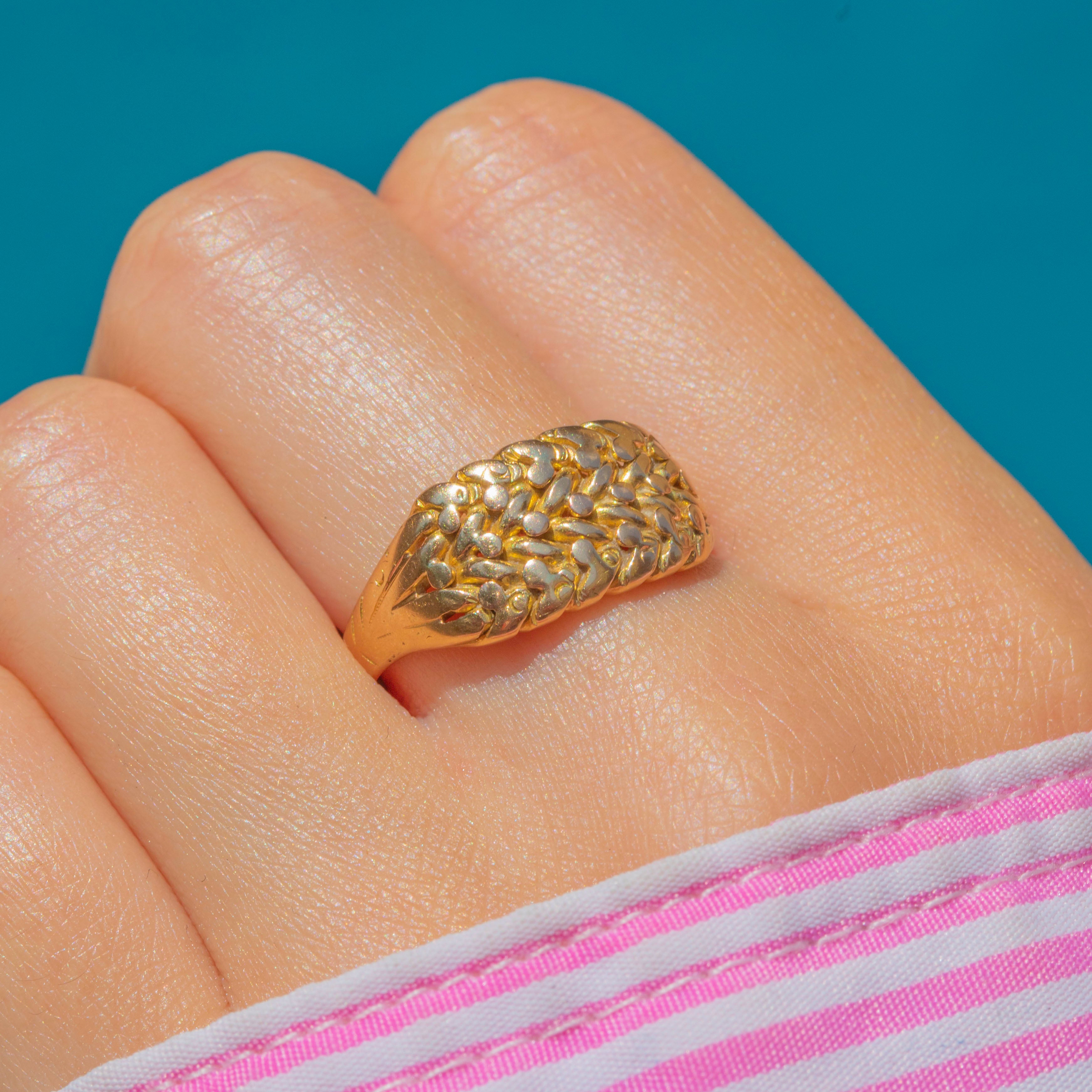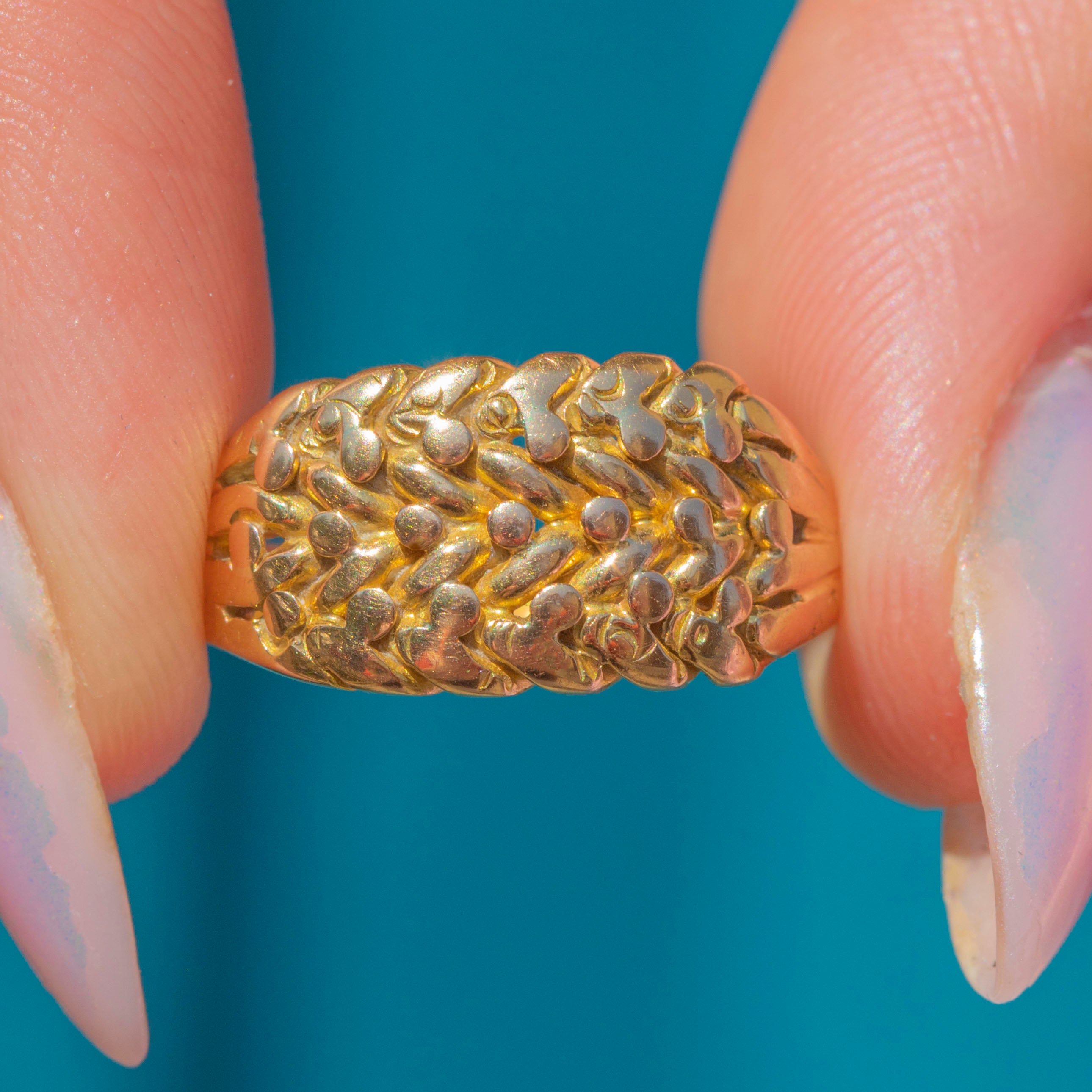 This antique 18ct Gold keeper ring is a beautiful chunky piece perfect for everyday wear, with its distinctive braiding adorning the front of the ring and smooth surface comfortably hugging your finger in all the right places.