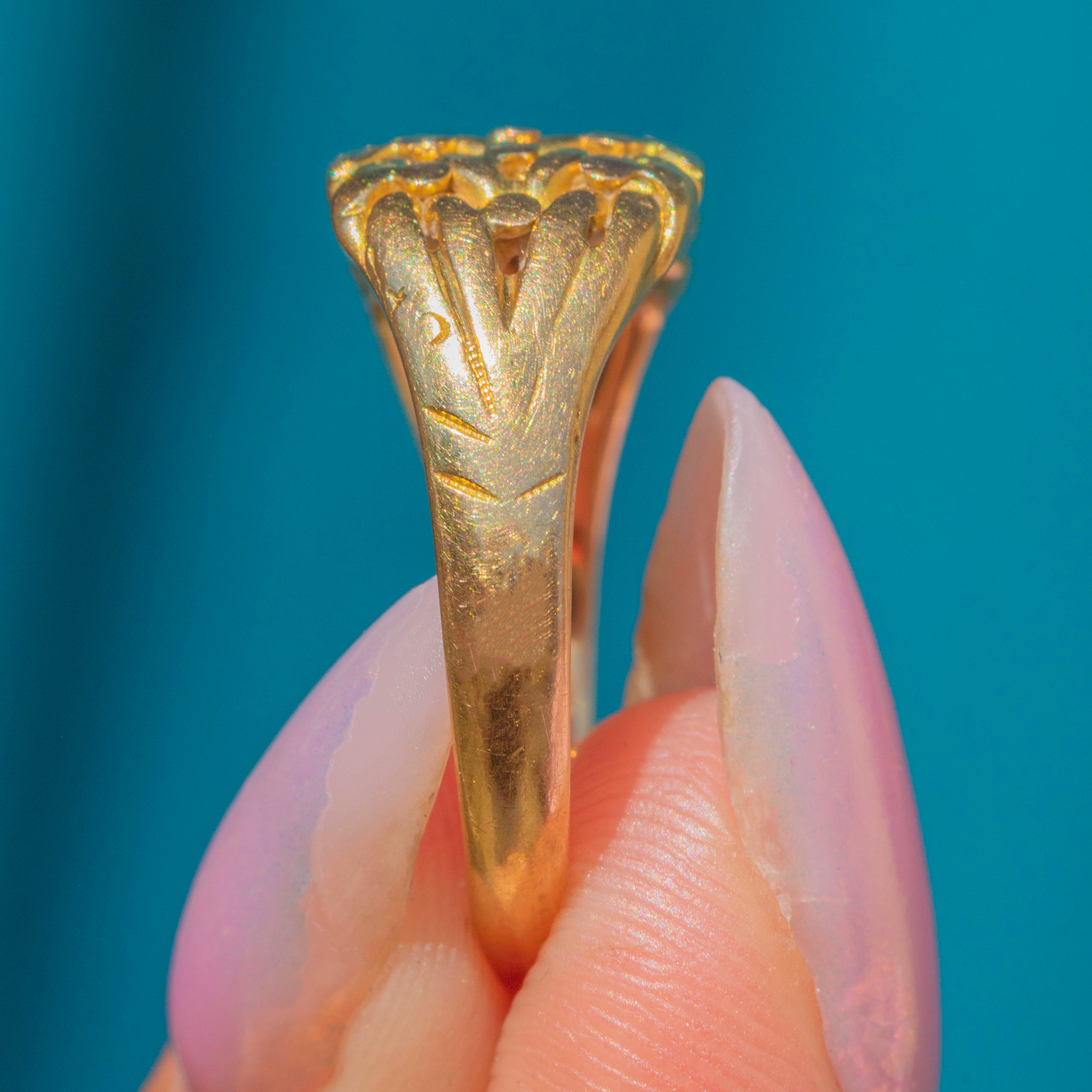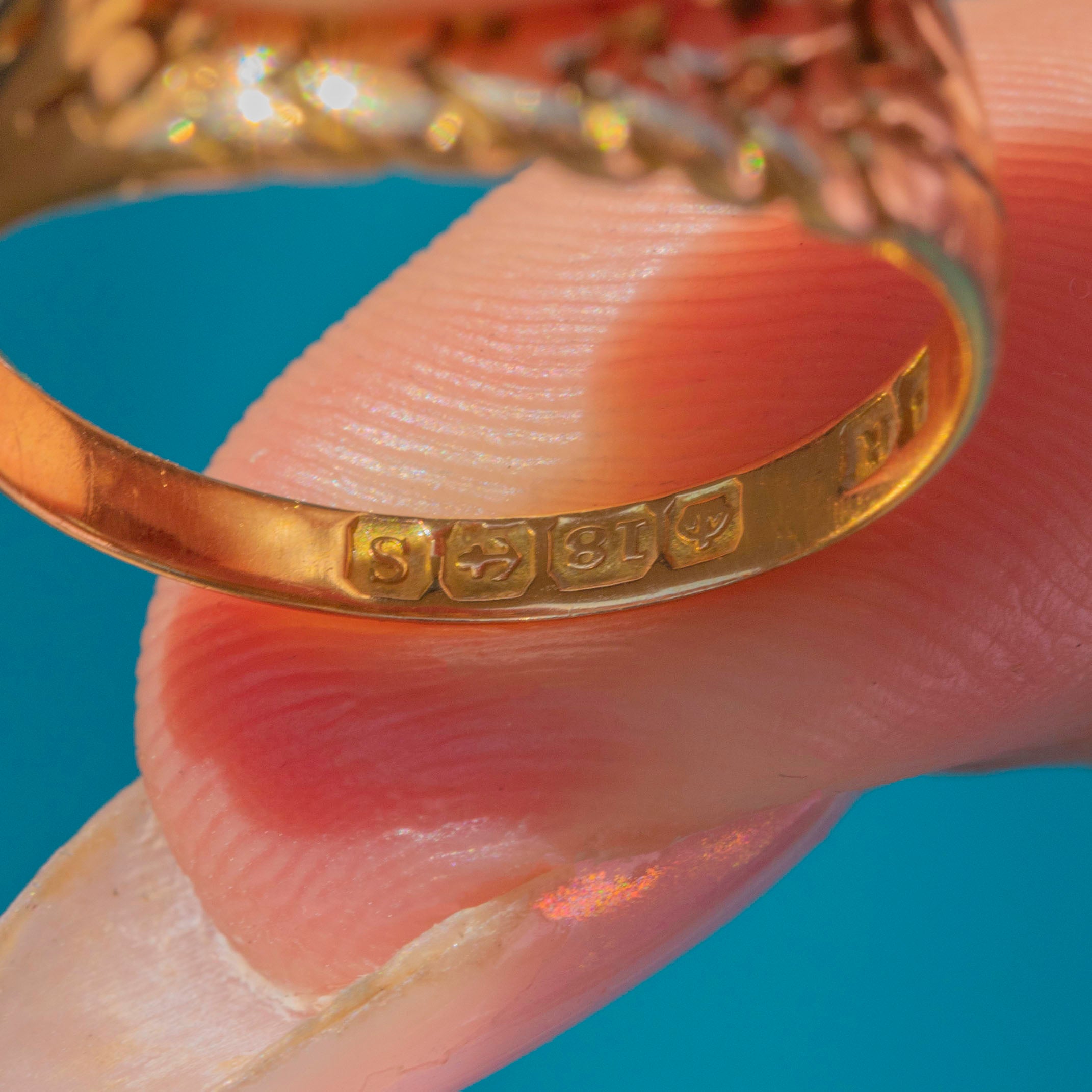 EXCELLENT: This antique ring has retained a perfectly rounded shape, providing comfort for everyday wear. The 18ct Gold is rich and buttery, and the band has a full set of English hallmarks dating to 1917!