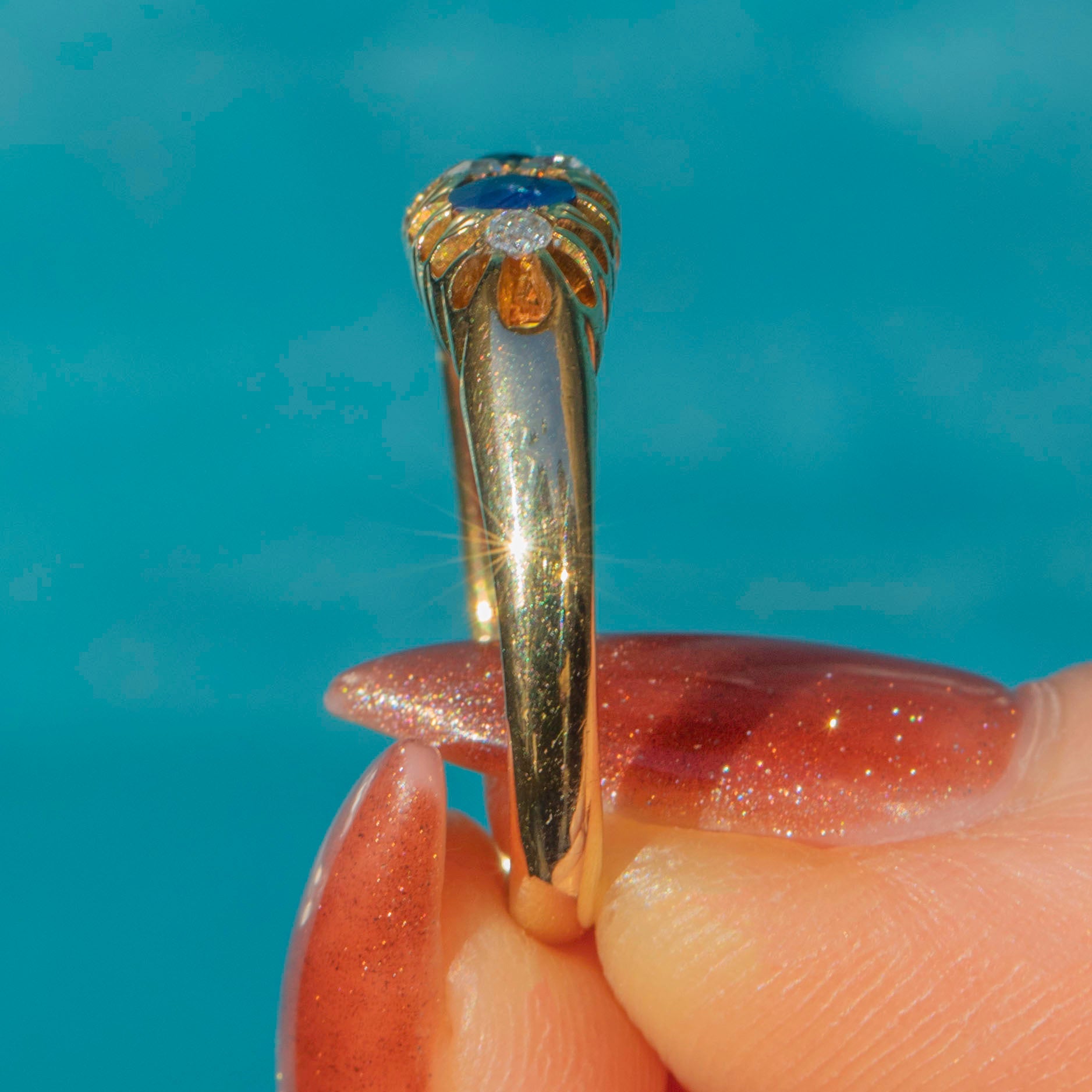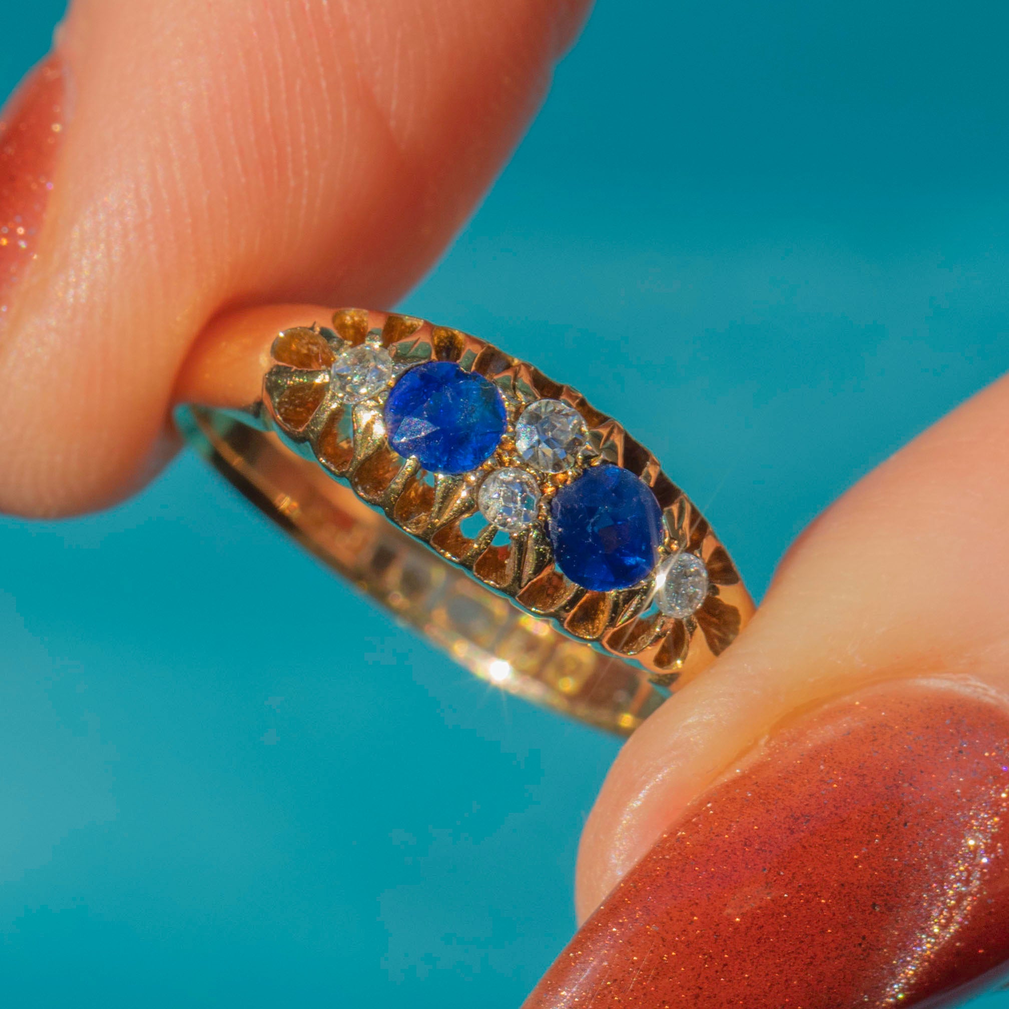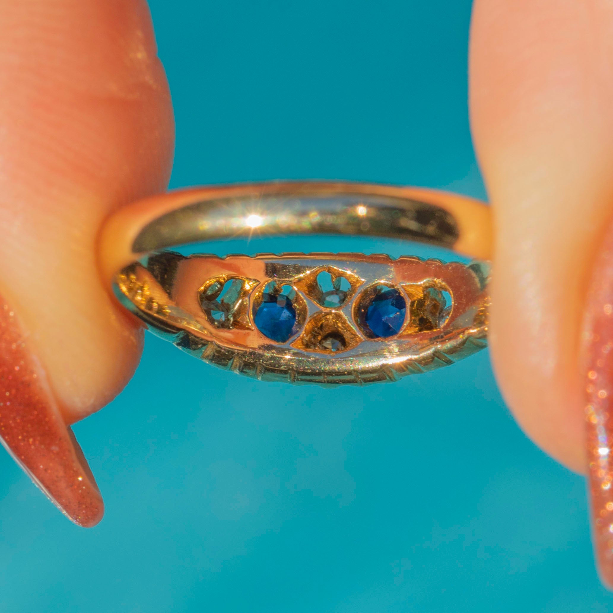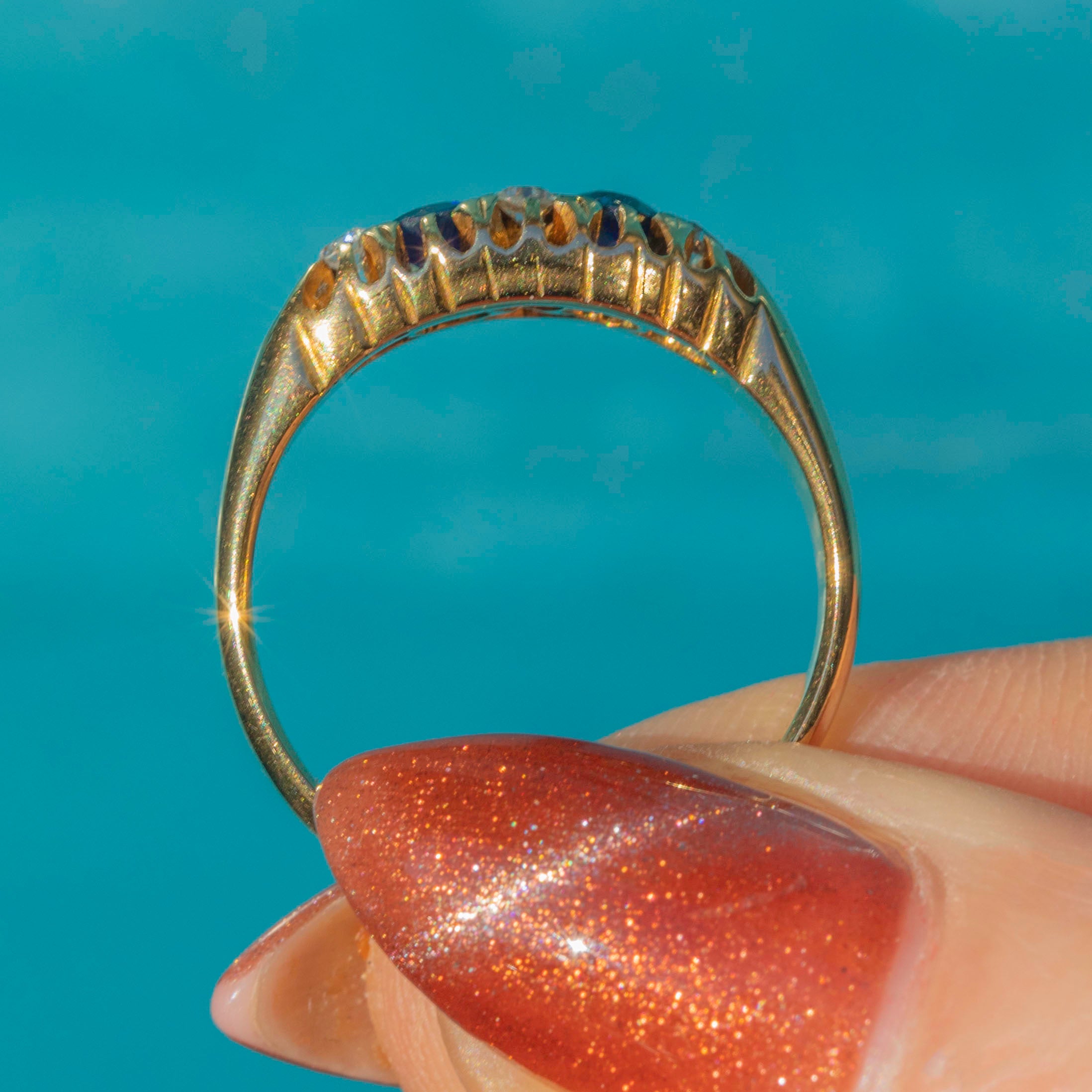 This antique 18ct Gold Natural Sapphire Diamond boat ring is a sweet piece. The Sapphires possess a midnight-blue hue and are accompanied by four twinkling Diamonds, creating an eye-catching piece ideal for everyday wear!