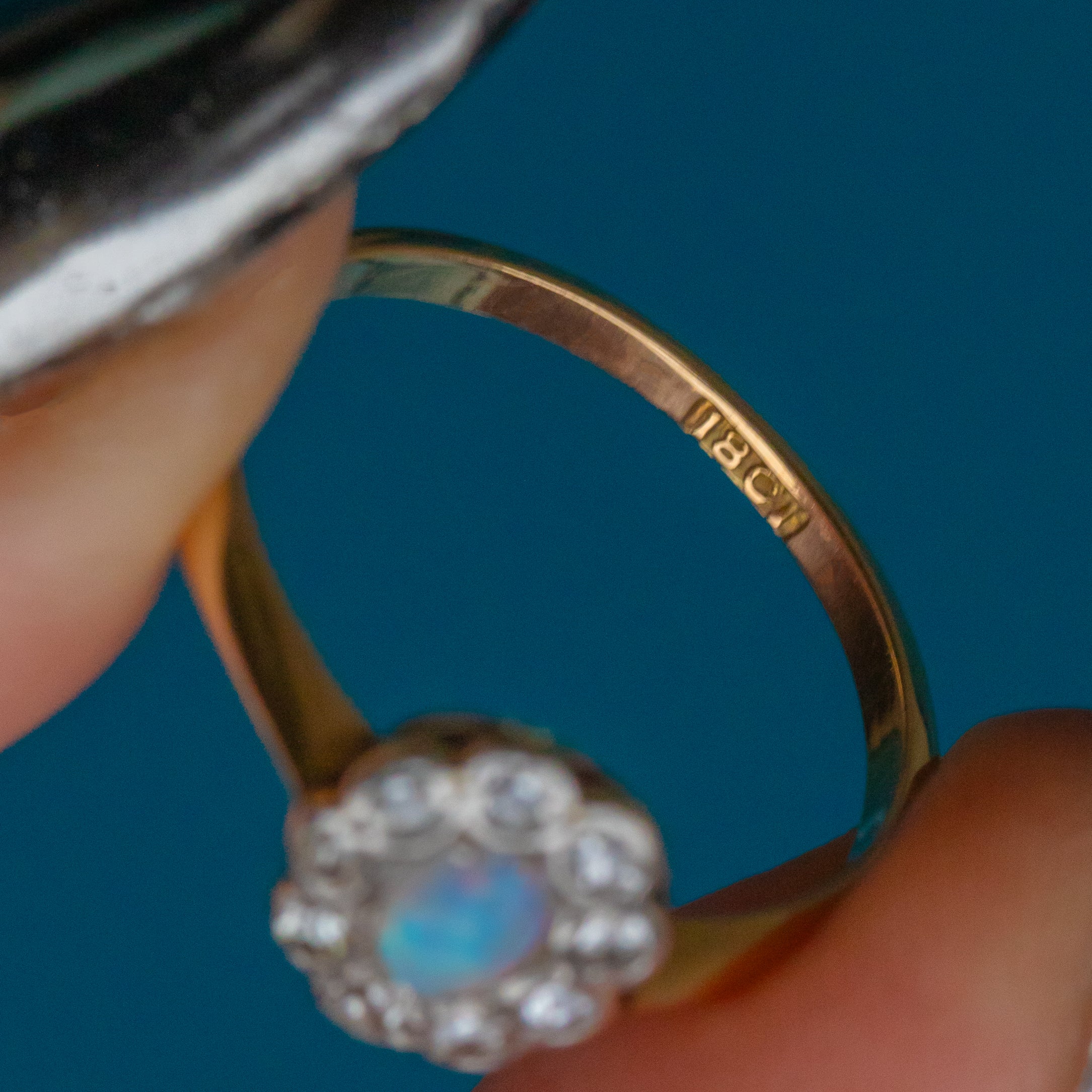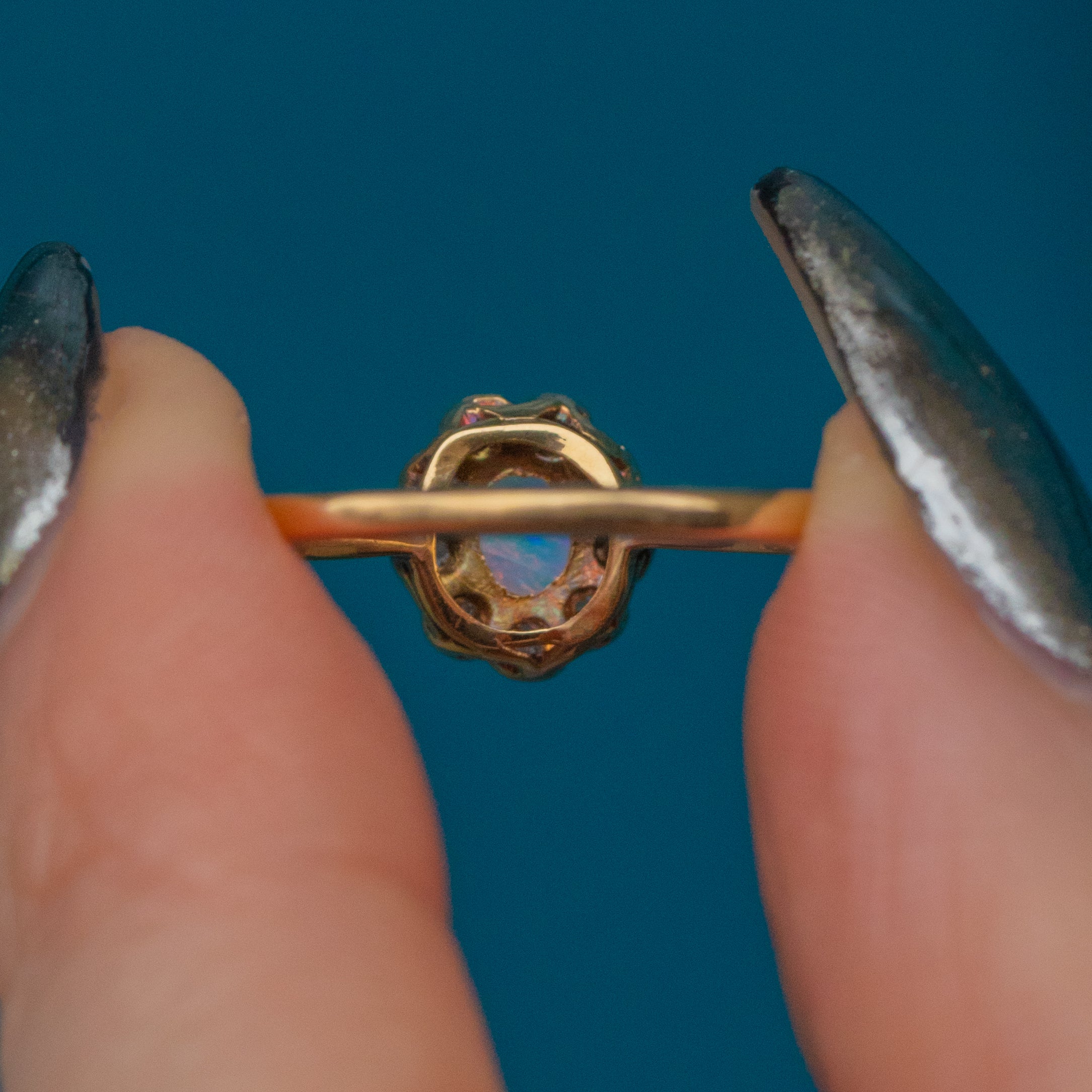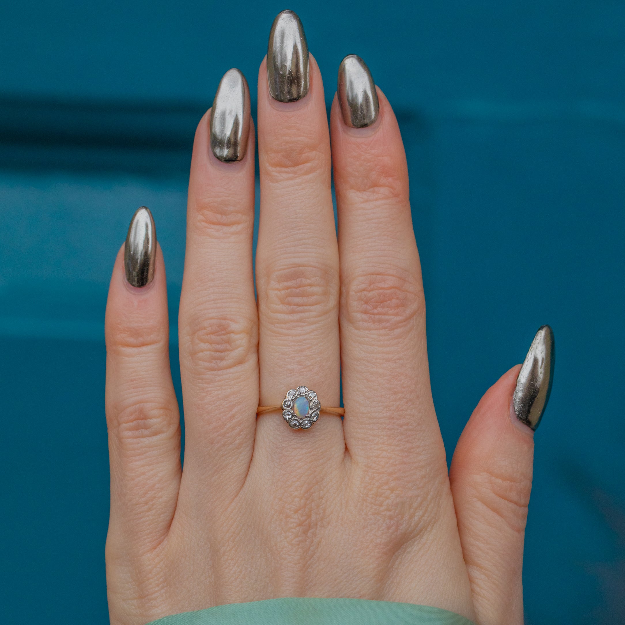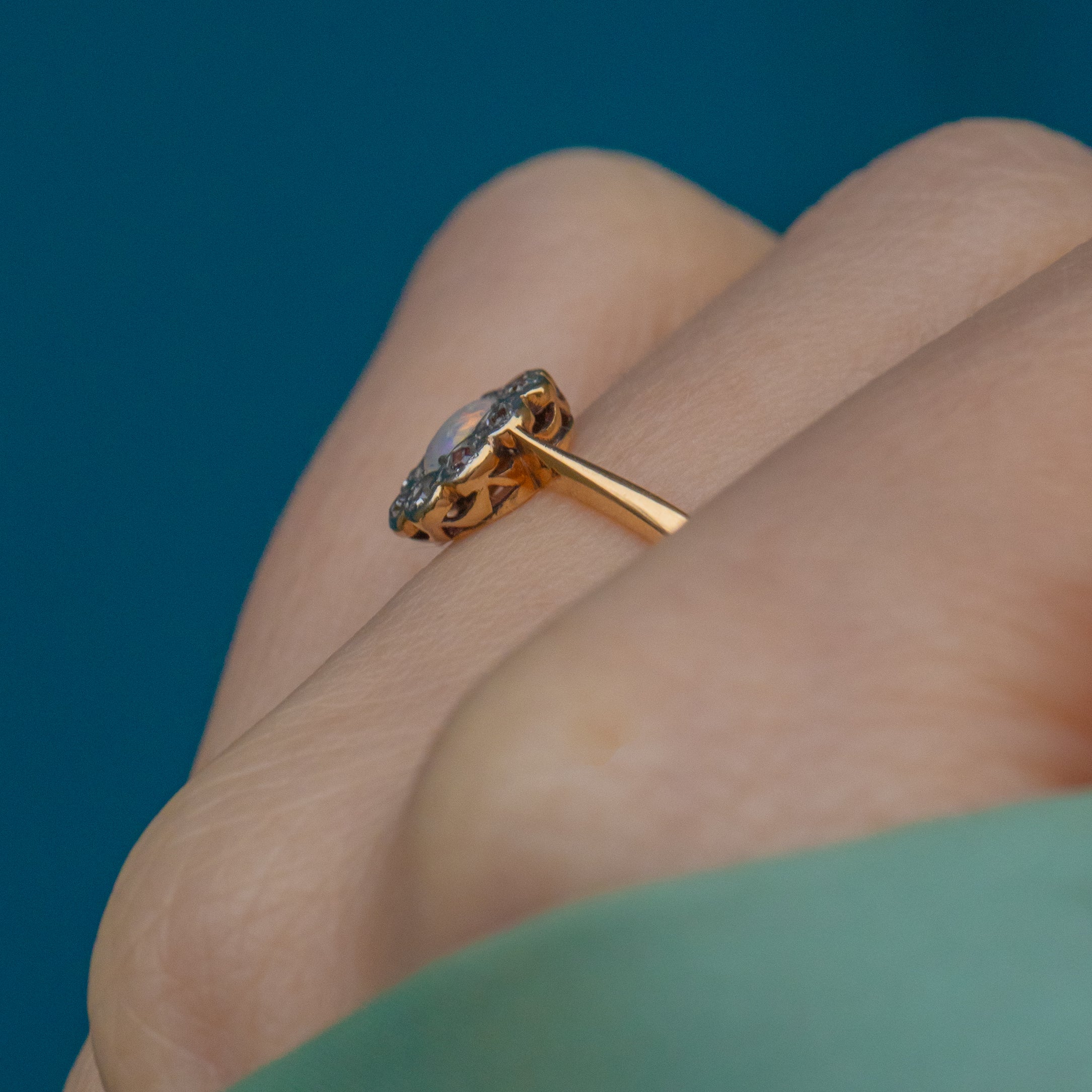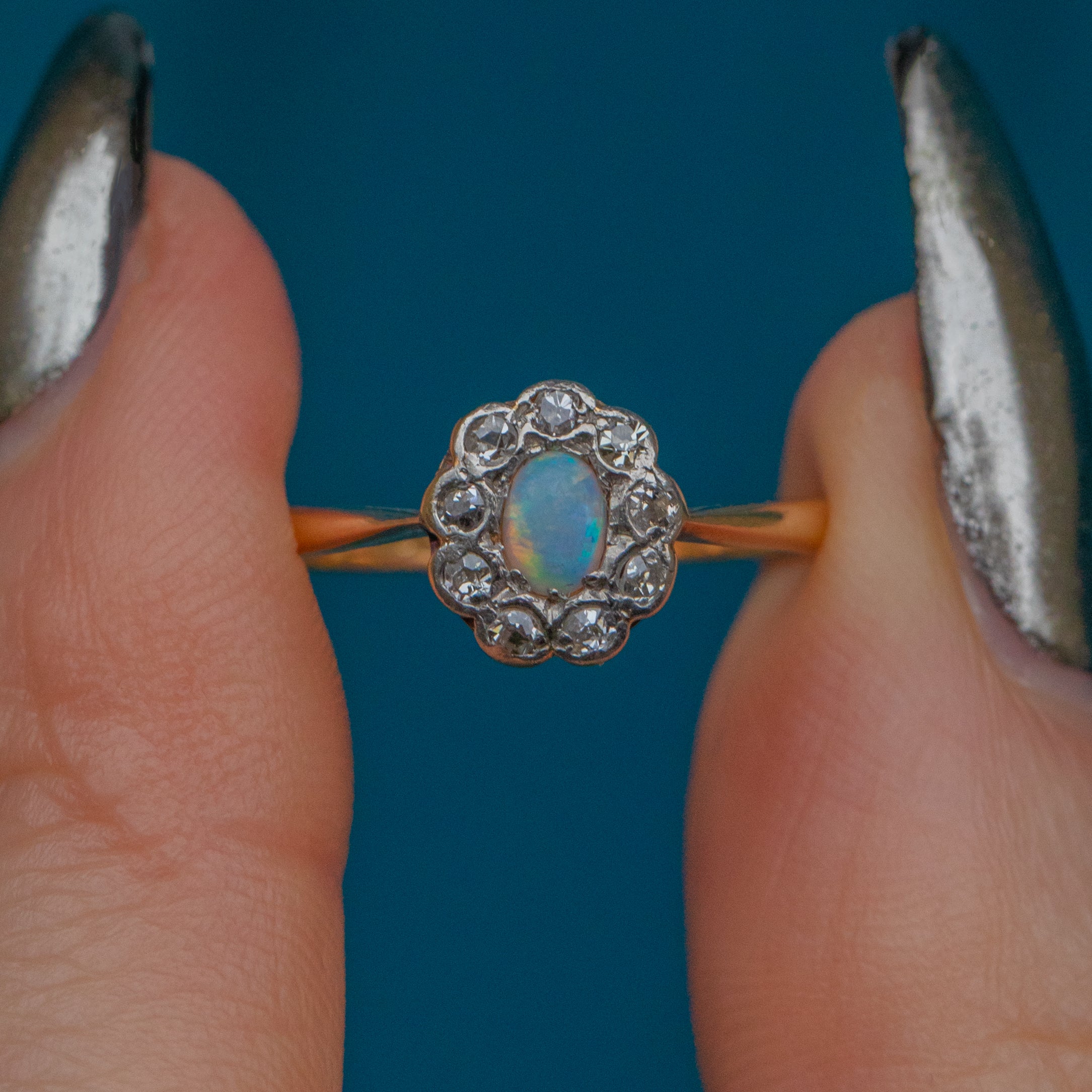 This antique 18ct Gold Opal Diamond cluster ring is the perfect dainty piece to add to your everyday wear. Her radiant Opal is a sea of iridescent colours flashing from every angle.