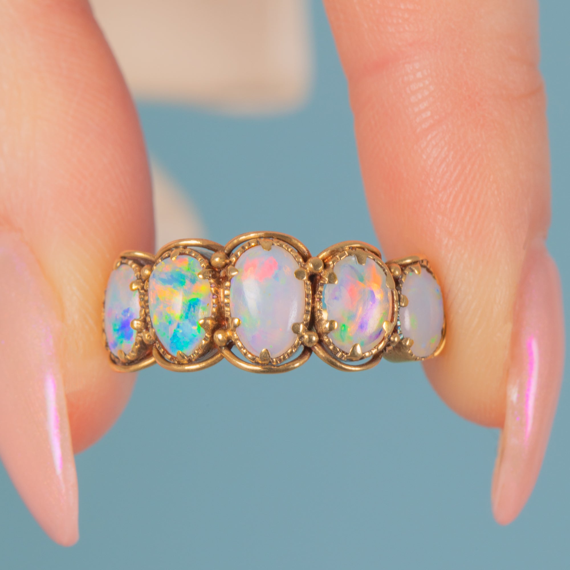 This jaw-dropping antique 18ct Gold Opal five stone ring will bring you all the right kind of attention! Crafted from luxurious sunshine-yellow 18ct Gold, she encases five luminous Opal cabochons, each with a galactic milky hue, fit for a space princess!