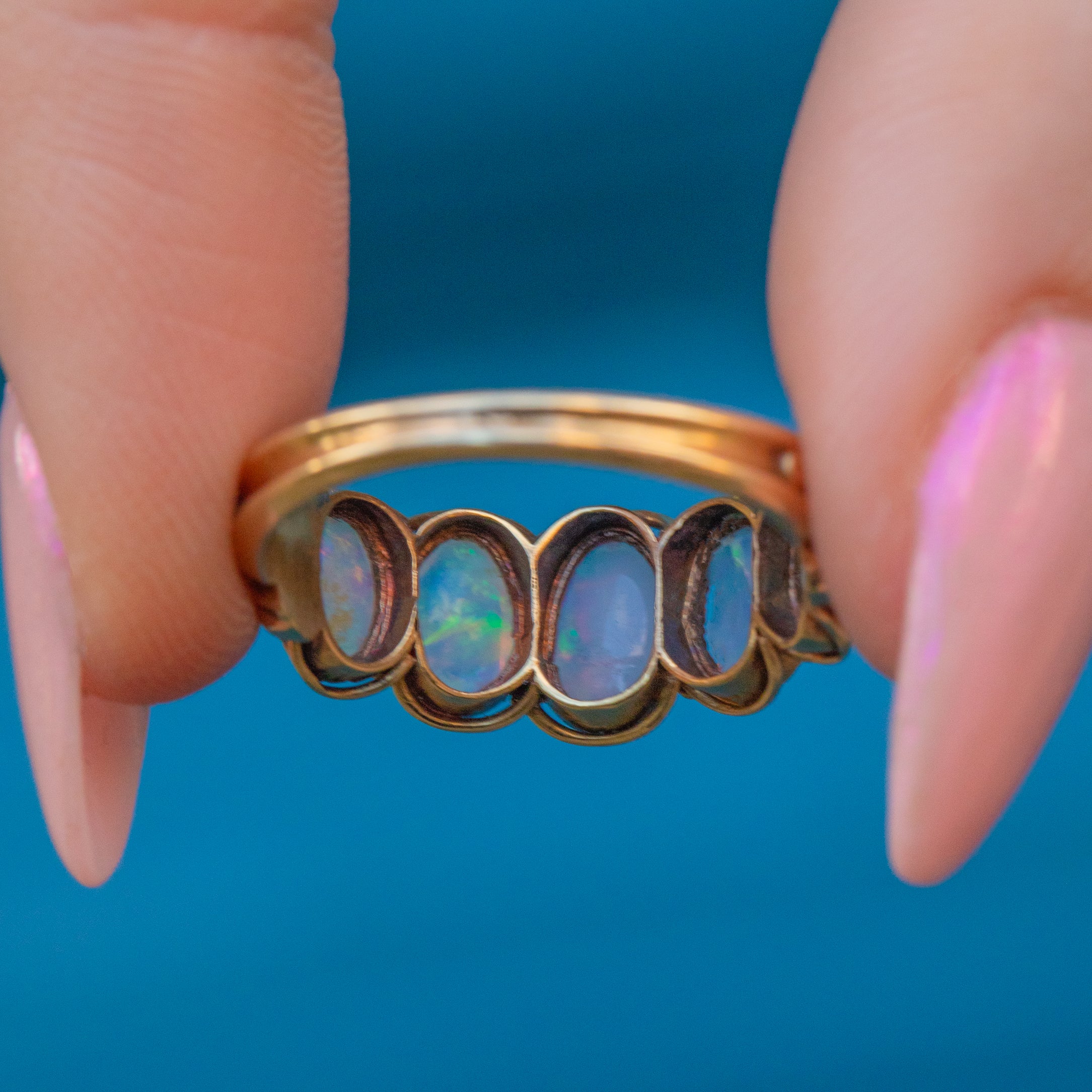 VERY GOOD. This antique 18ct Gold Opal five stone ring is in excellent condition throughout! Her Opal cabochons are vibrant and lively, perfectly domed and smooth to the touch. There is one scratch on the back of one of the Opals, however, this is only visible from the back of the ring. Crafted from richly saturated 18ct Gold her slender band remains ever so comfortable to wear. What a treat!