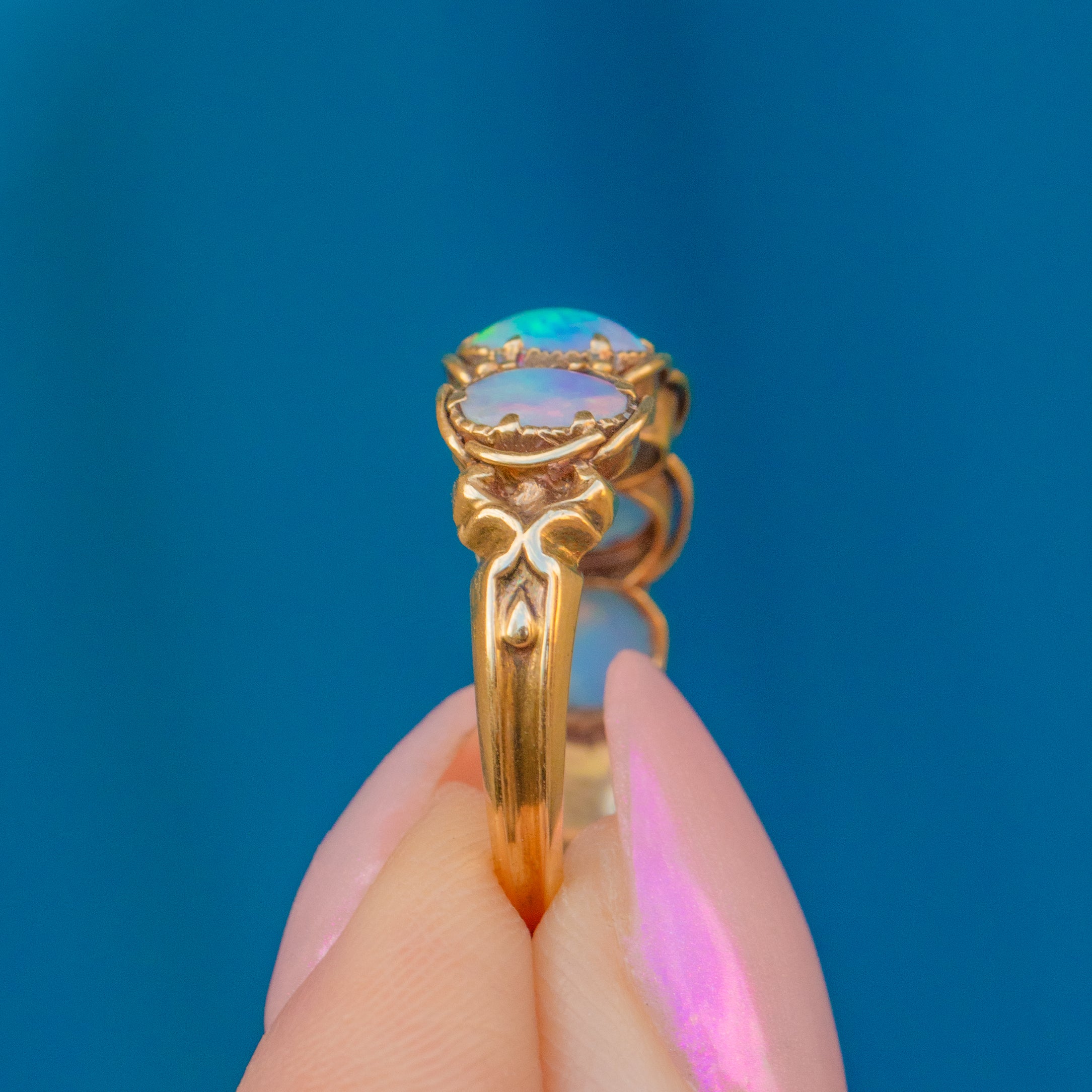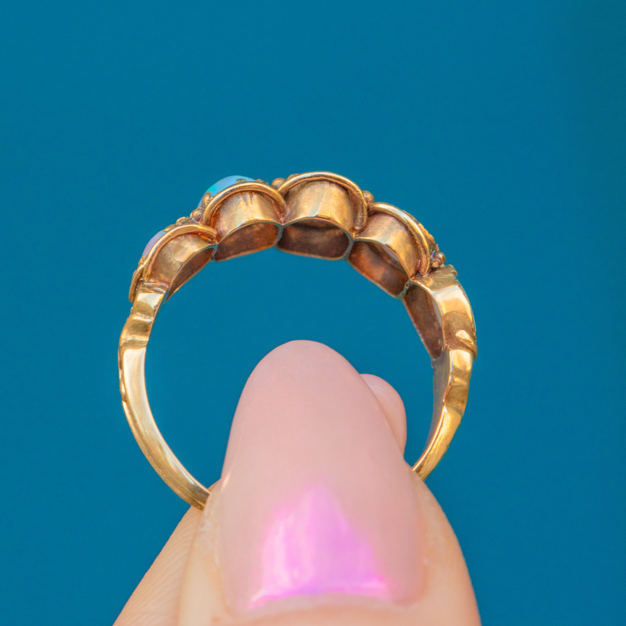 Each magical Opal exudes flashes of fluorescent greens, flaming oranges, and fuchsia pinks, encased in exquisitely detailed settings. A real Victorian showstopper, this antique Opal ring will prove hard to resist.