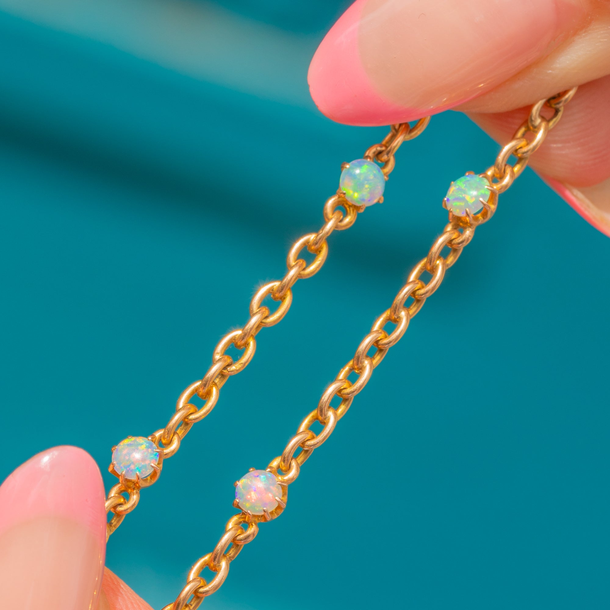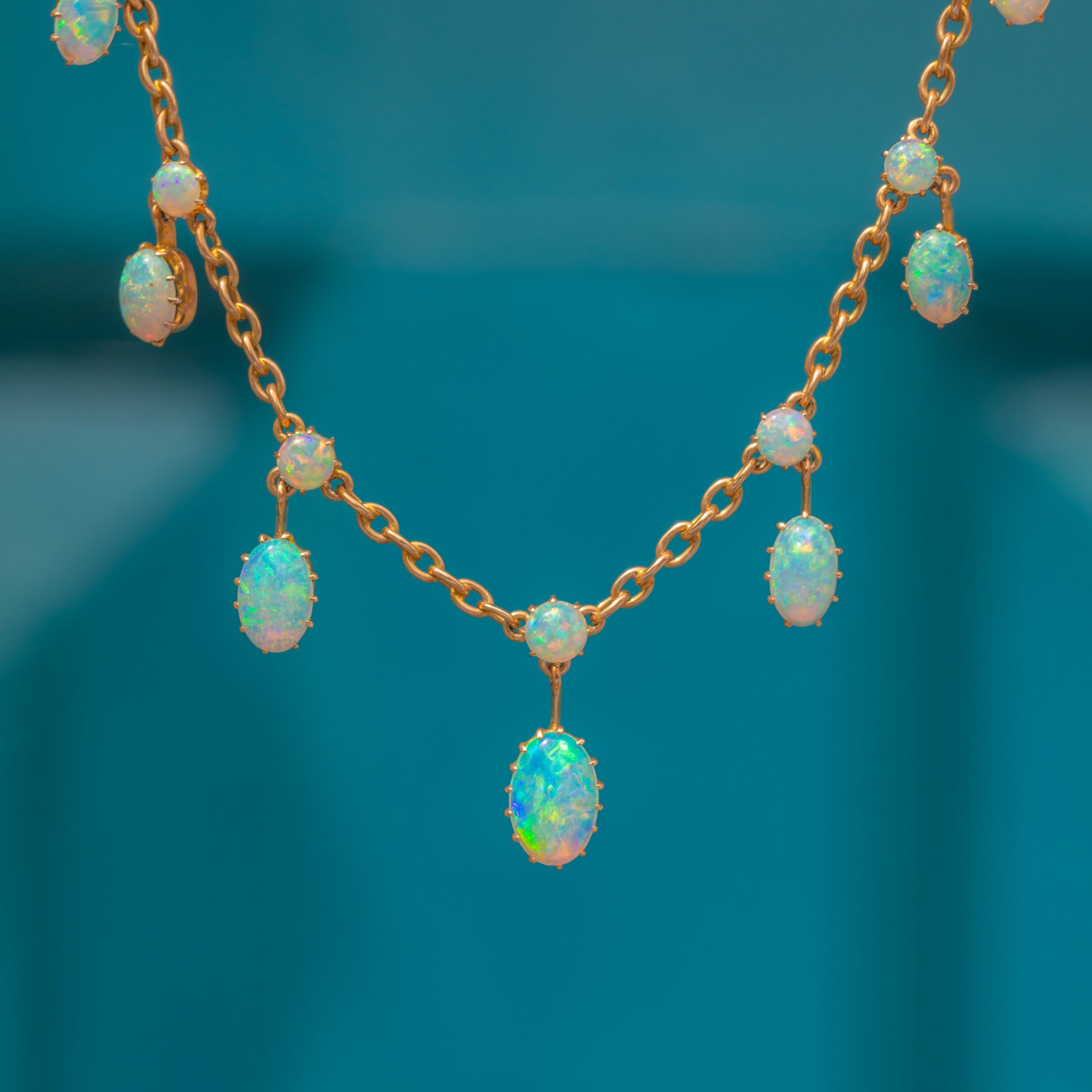 EXCELLENT: A splendid antique 18ct Gold Opal fringe necklace in excellent condition! This gorgeous piece is complete with 22 Opal gemstones, which are all set securely and smoothly domed. The 18ct Gold chain is buttery and rich, with a bolt ring to allow you to wear this piece with absolute confidence! Given the age of this piece, she's lasted incredibly well over the years- with very minimal wear to note.