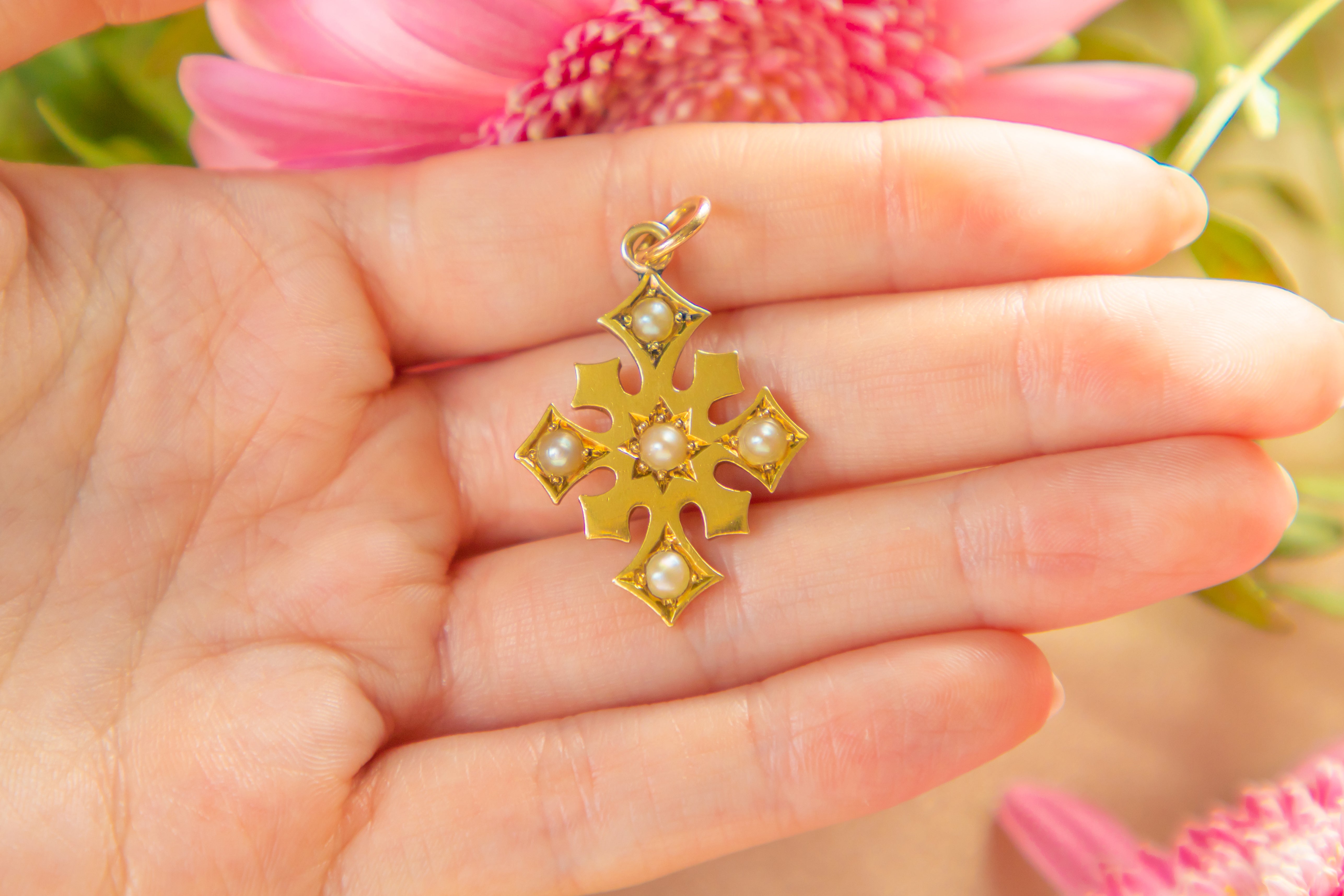 How gorgeous is this antique 18ct Gold Pearl cross pendant! Her unique cross shape is crafted from scrumptious 18ct Gold, with 5 Pearls possessing a pink luster, set at each point and in the centre.