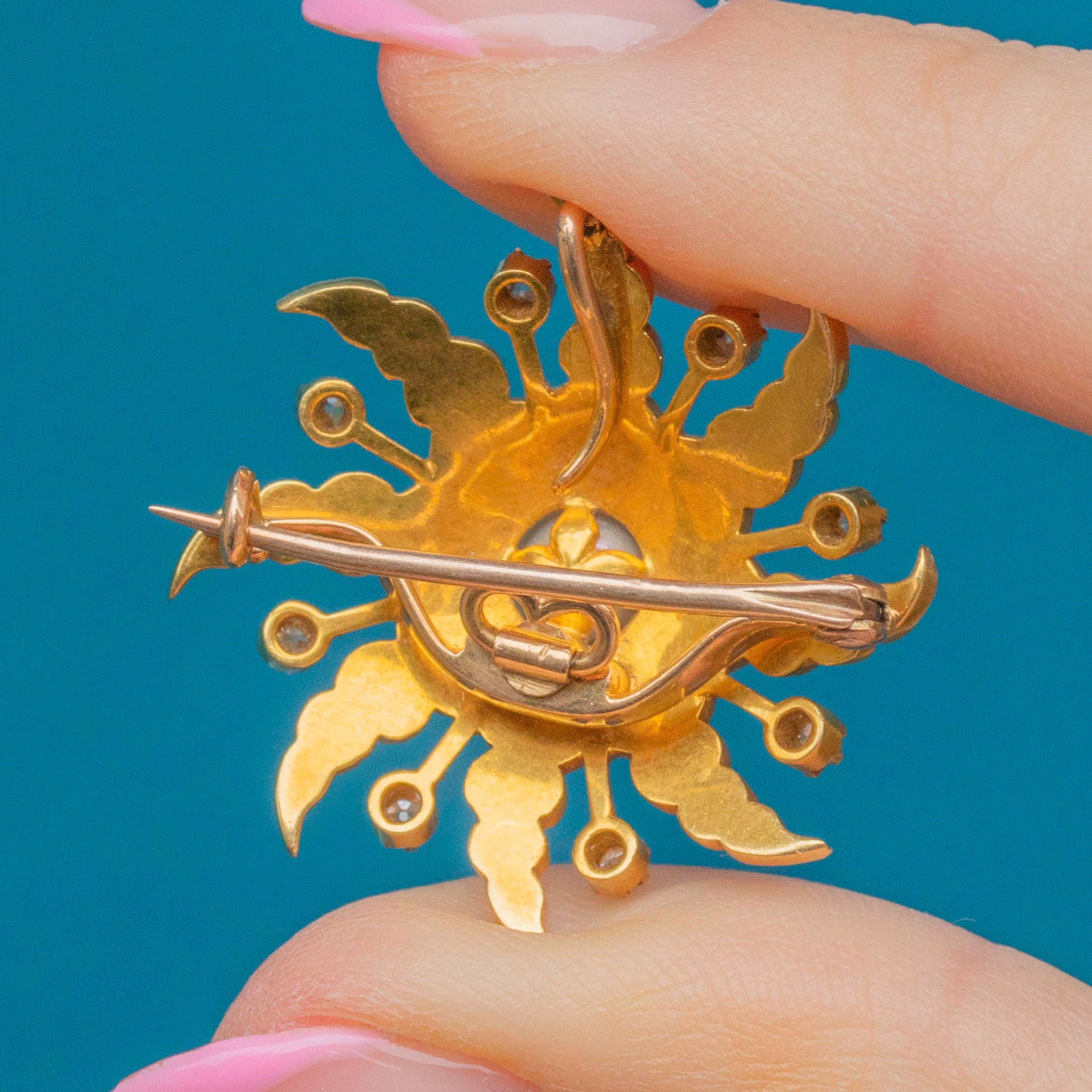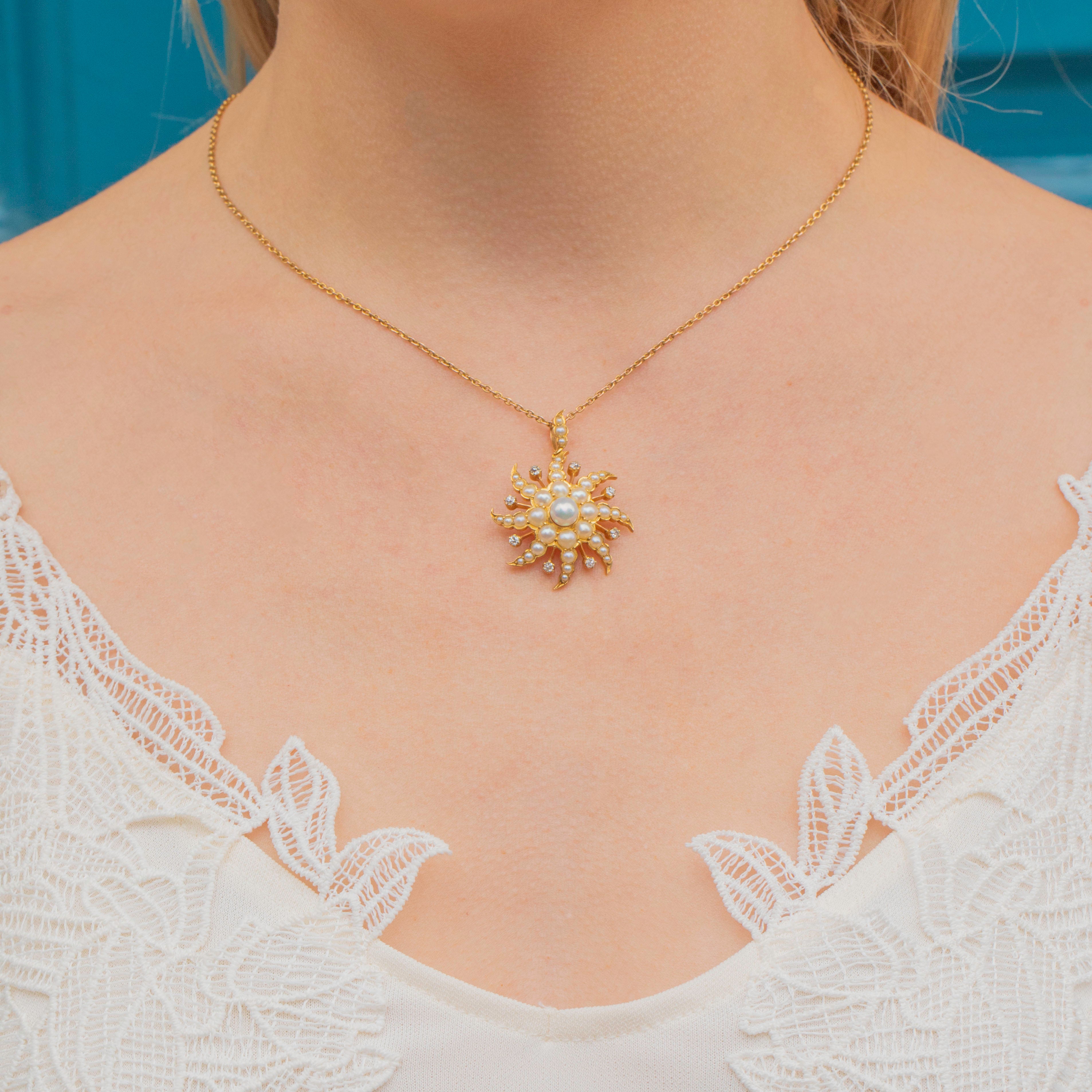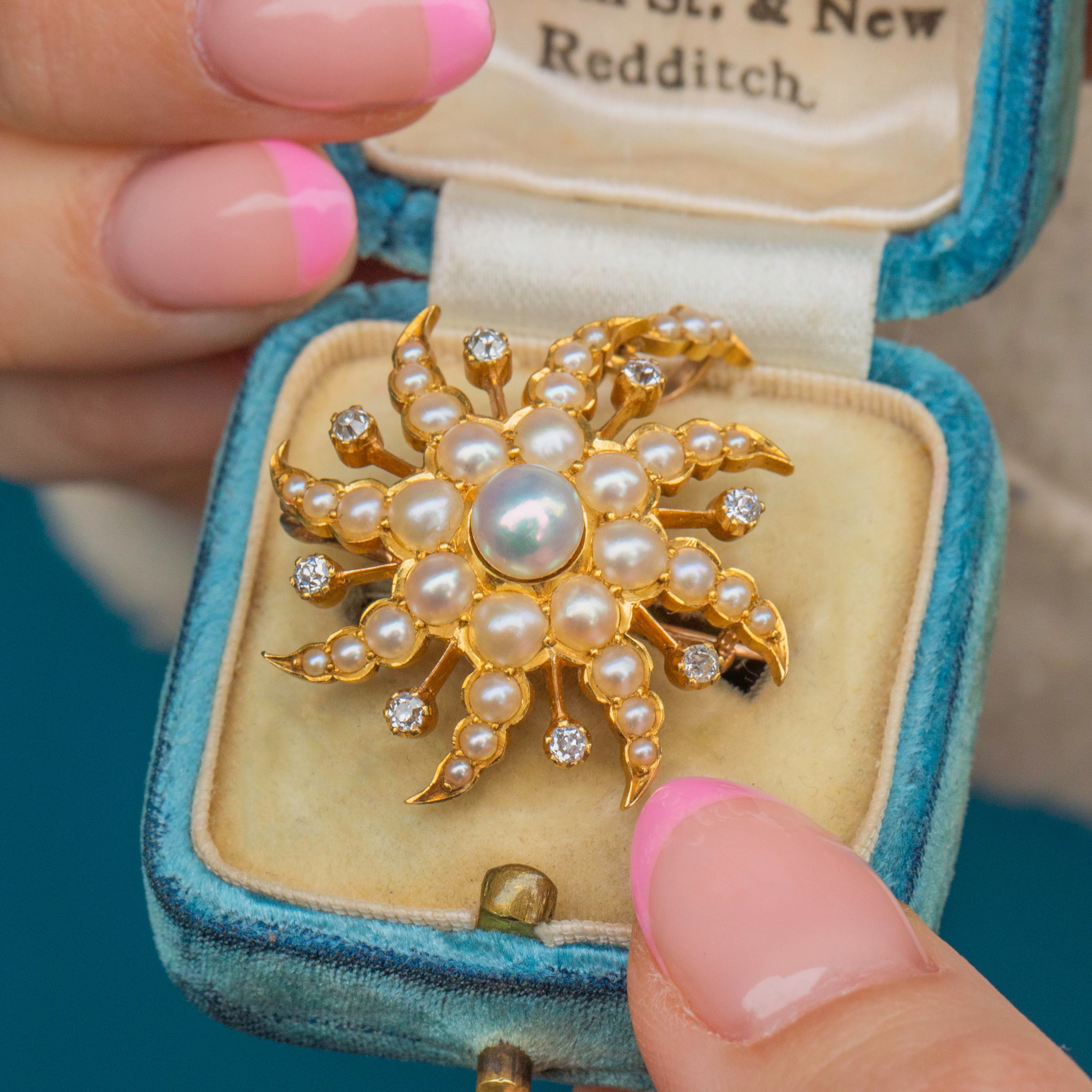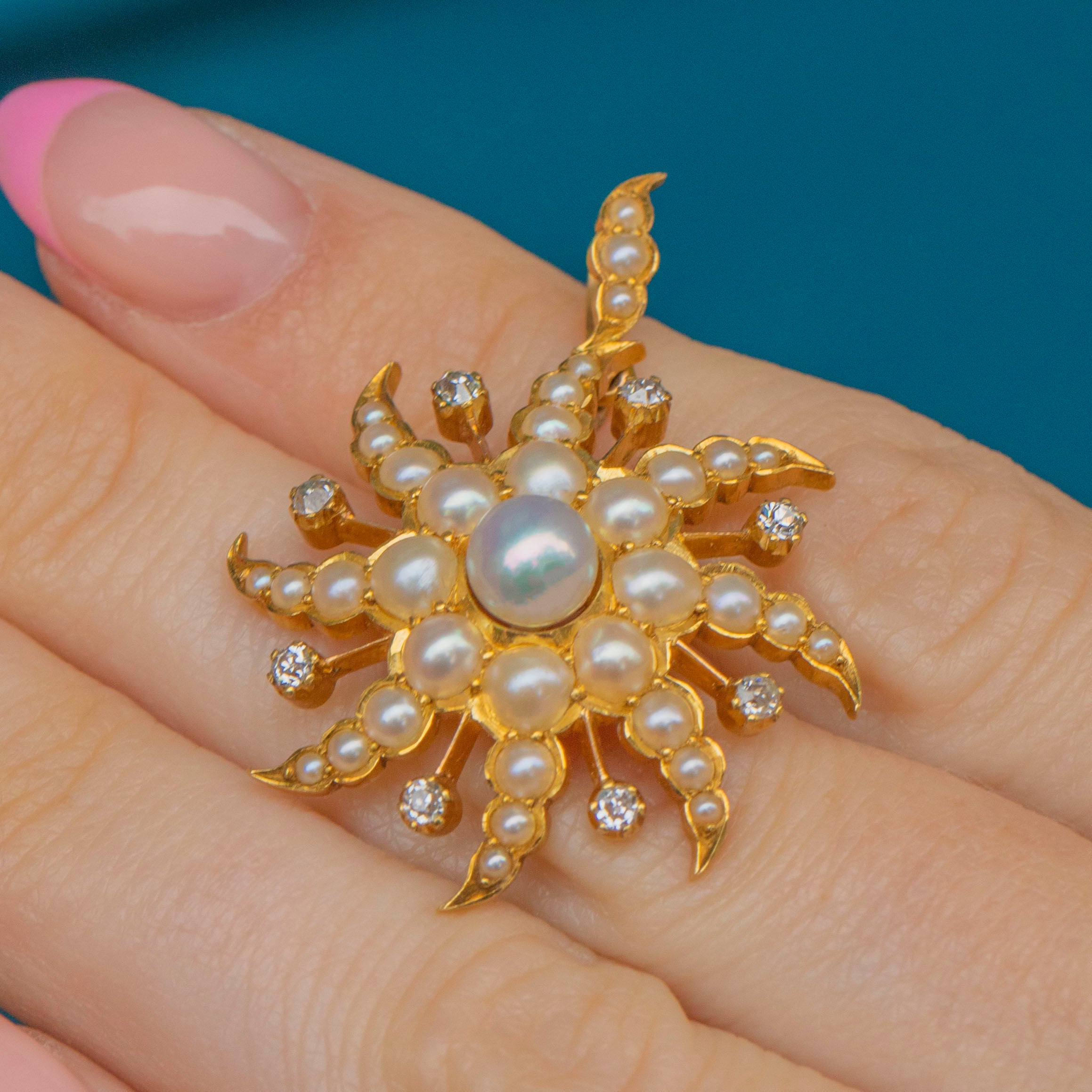 EXCELLENT. This antique 15ct Gold Pearl starburst pendant is in excellent condition. Each Pearl is secure and present, with a myriad of shimmering hues throughout. The Diamonds are all present and free from fleabites, providing a twinkling accent. The structural integrity of the piece has withheld the test of time and has retained its superb starburst form effortlessly. On the back, her detachable brooch fittings are in perfect working condition!