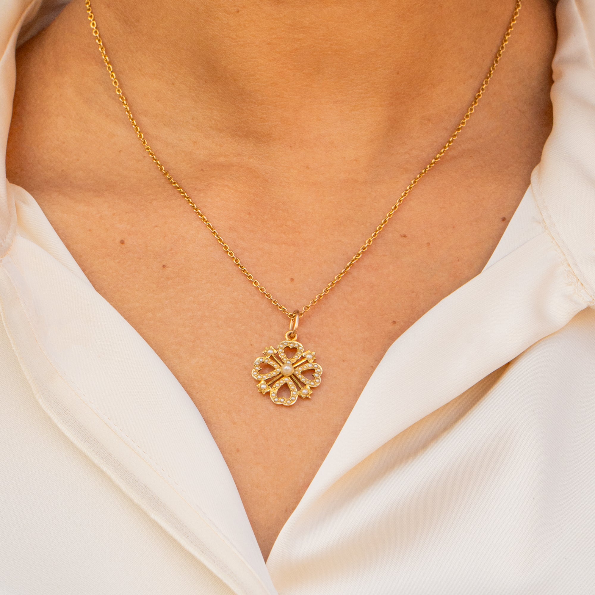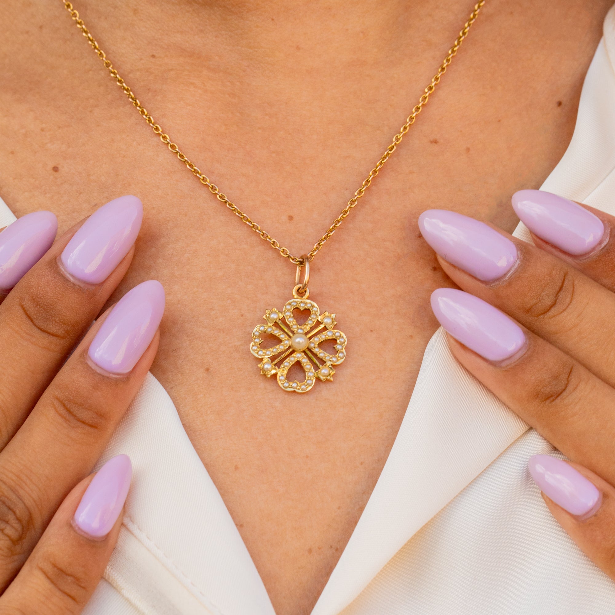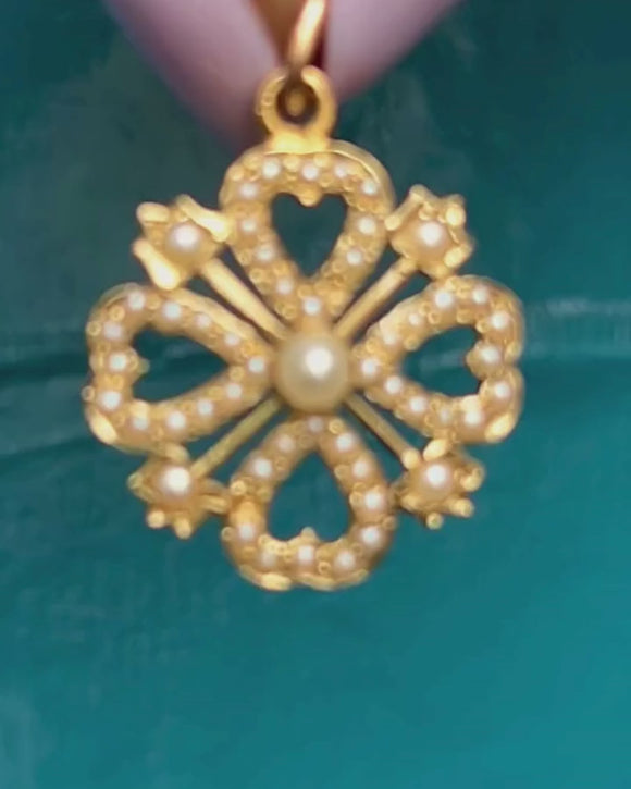 Four Pearl encrusted hearts are arranged around a plump Pearl centre, radiating a mesmerising iridescence as they catch the light. Exuding femininity and opulence from her every curve, this antique Pearl pendant will steal the show once she's suspended from a chain across your décolletage!