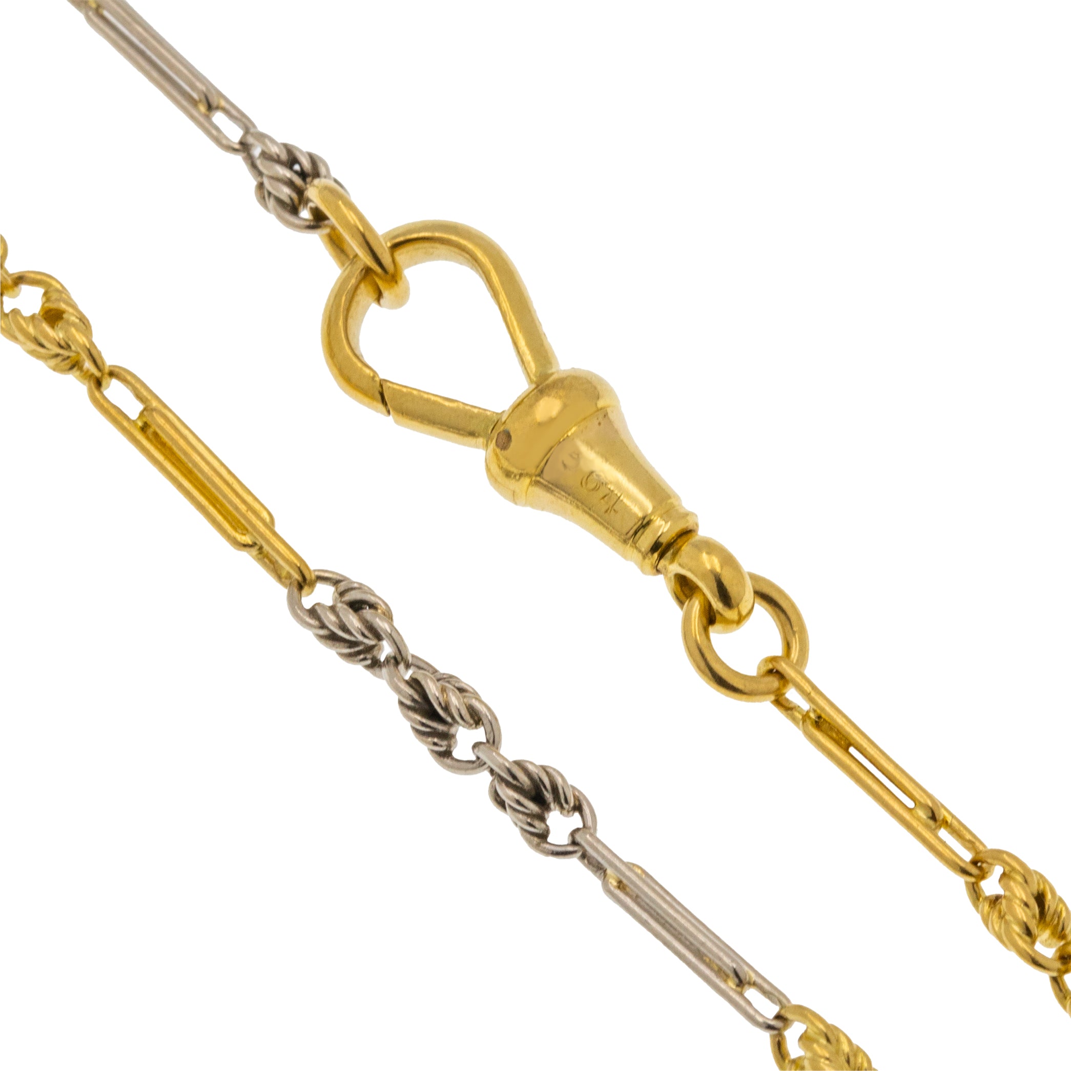 This antique 18ct Gold and Platinum bi-colour bracelet will be the hot topic of conversation as she adorns your wrist! Platinum and Gold lover's knots and paperclip links are entwined to form her 7.5" length; the contrast of mixed metals is what will set your collection apart from the rest.