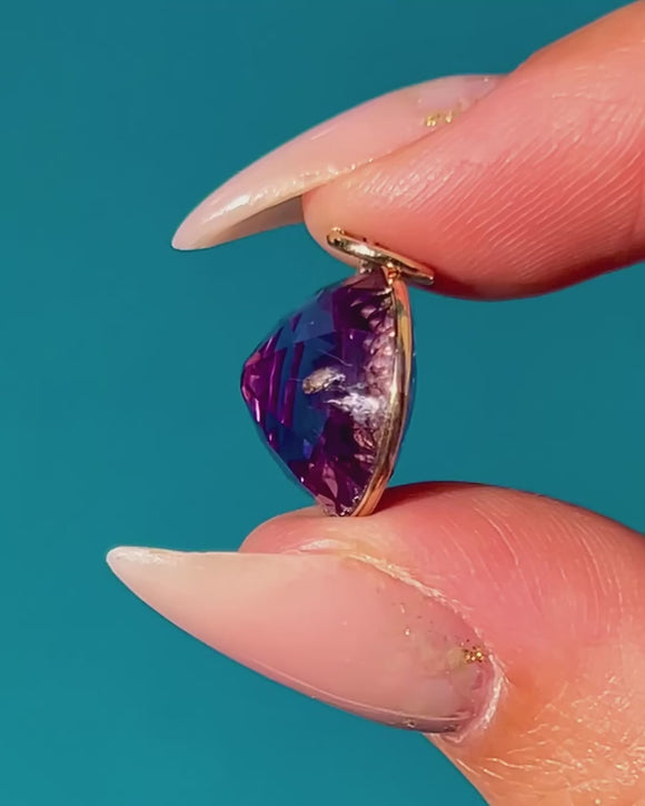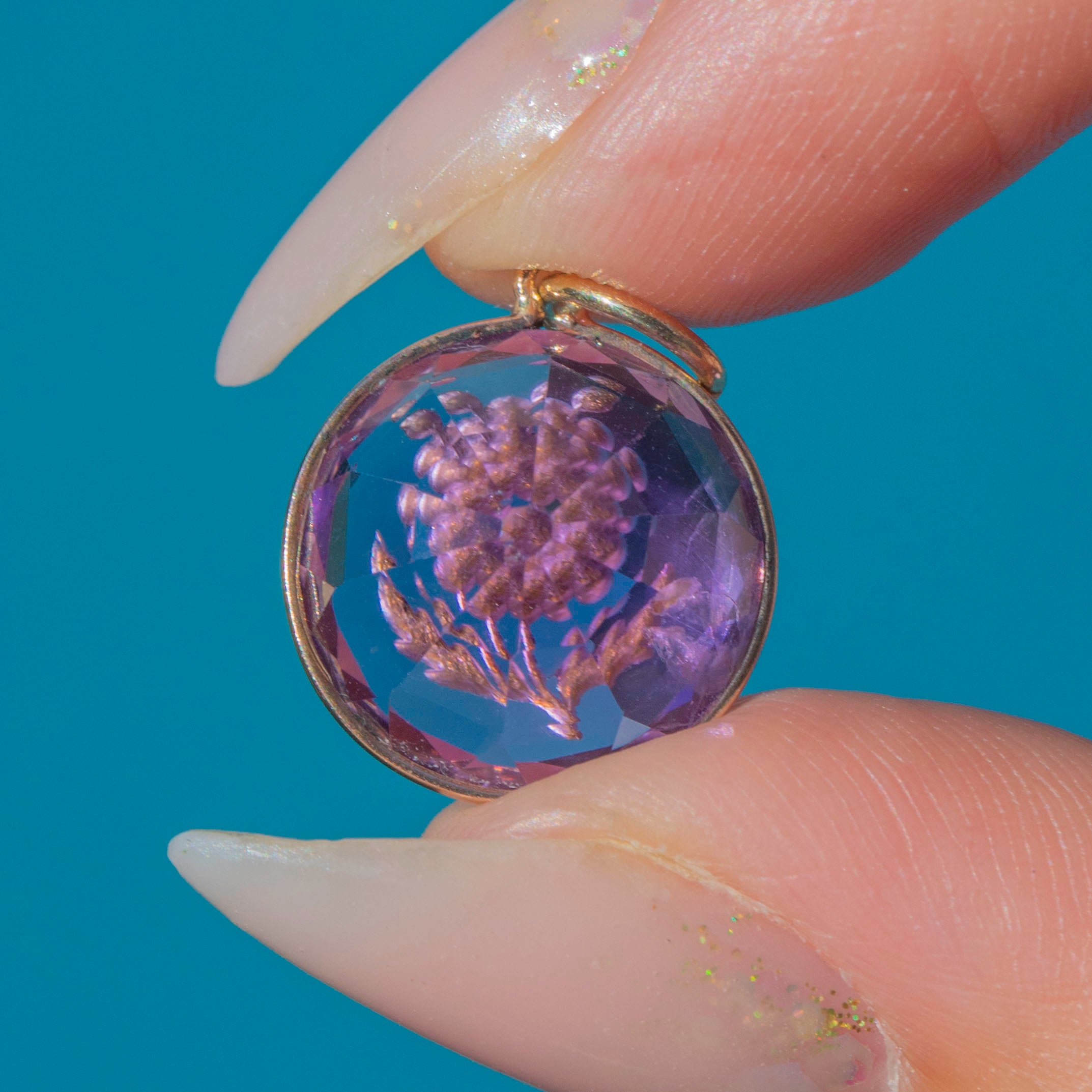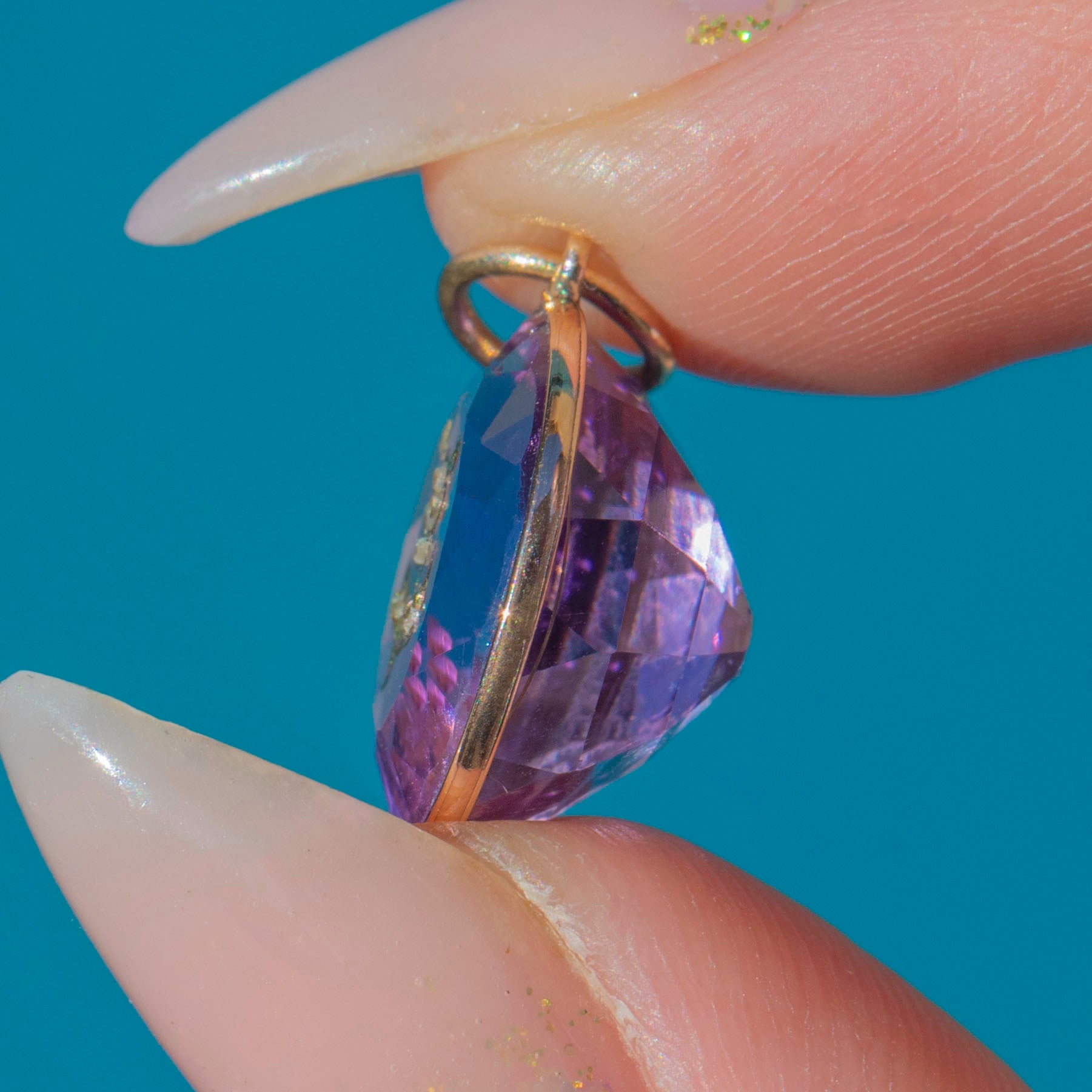This exquisite Victorian “Rose of Sharon” charm is crafted in rich 18ct Gold, set with a vibrant purple Amethyst at its heart. The impressive Amethyst weighs approx 6.90ct, with a bold domed cut that radiates colour and depth. Surrounding the centre are tiny Rose-cut Diamonds, adding delicate sparkle to the floral motif.