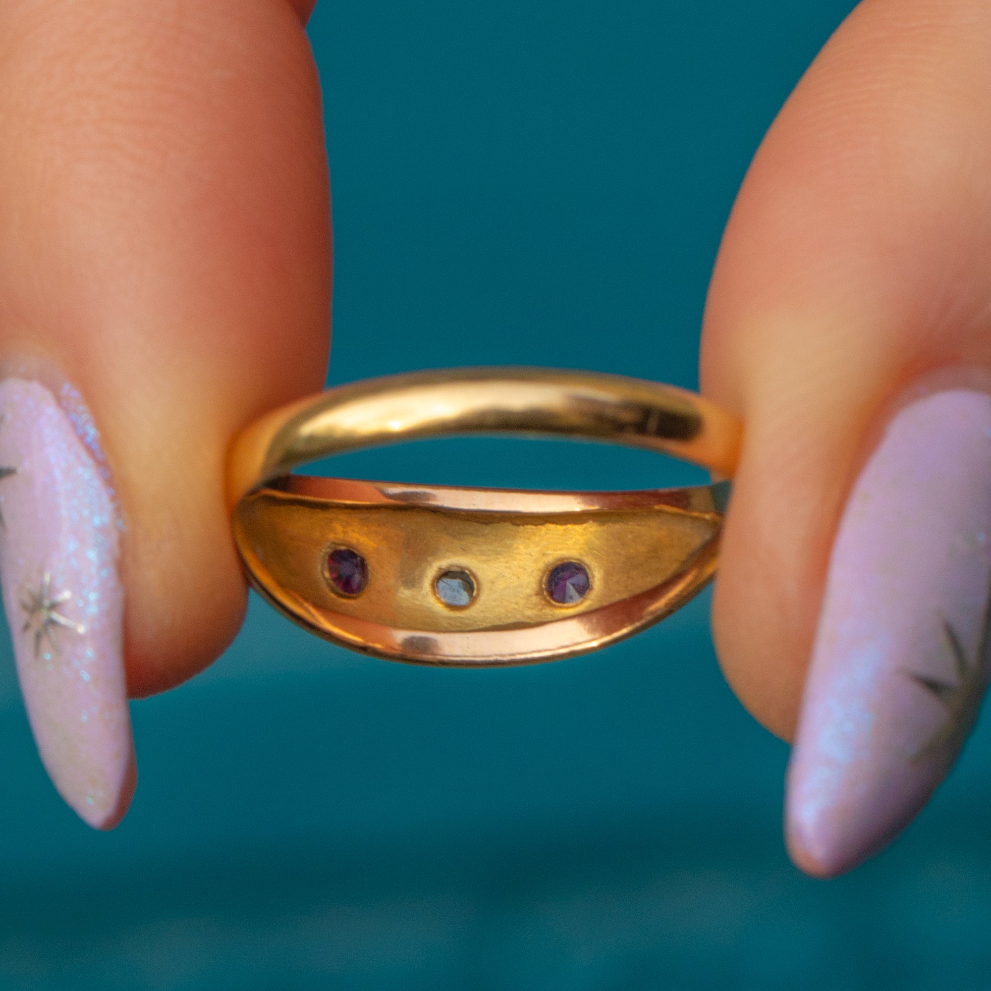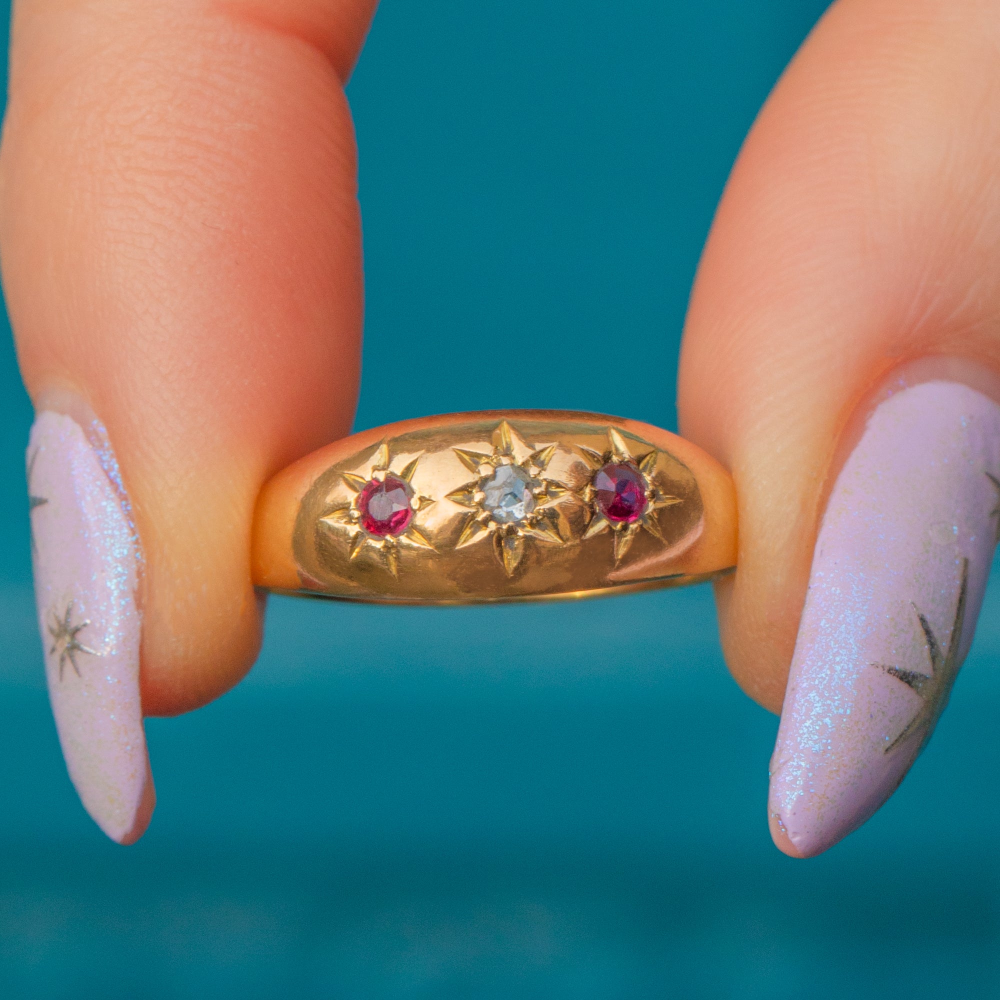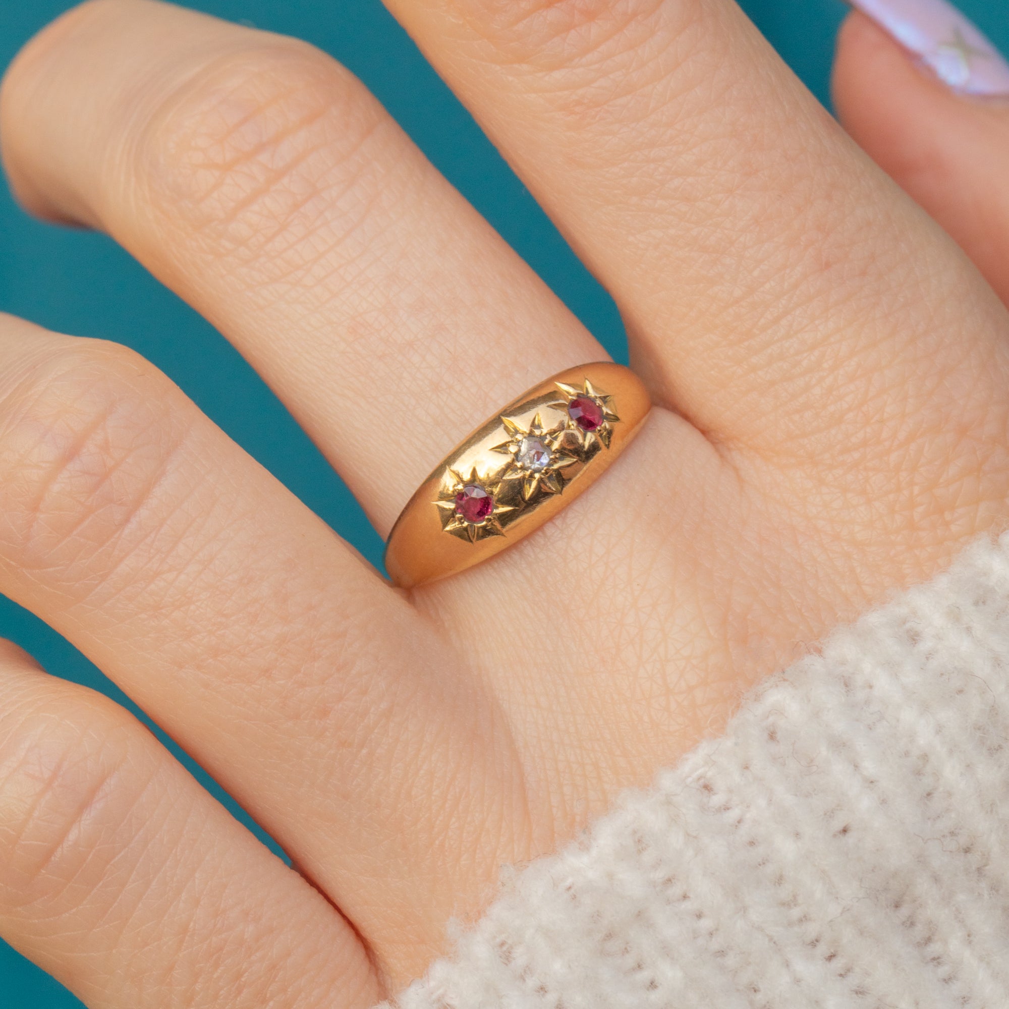 VERY GOOD-EXCELLENT. This antique 18ct Gold Ruby Diamond gypsy ring is in lovely condition. The gemstones are securely set and free from chips or abrasions, providing this antique Gold ring with a subtly sparkling accent. The Gold is bright with only minor surface wear, commensurate with age, and has kept its form well. With a chunky antique 18CT stamp and so much wear potential, this Victorian Ruby Diamond ring is set to become your new everyday essential!