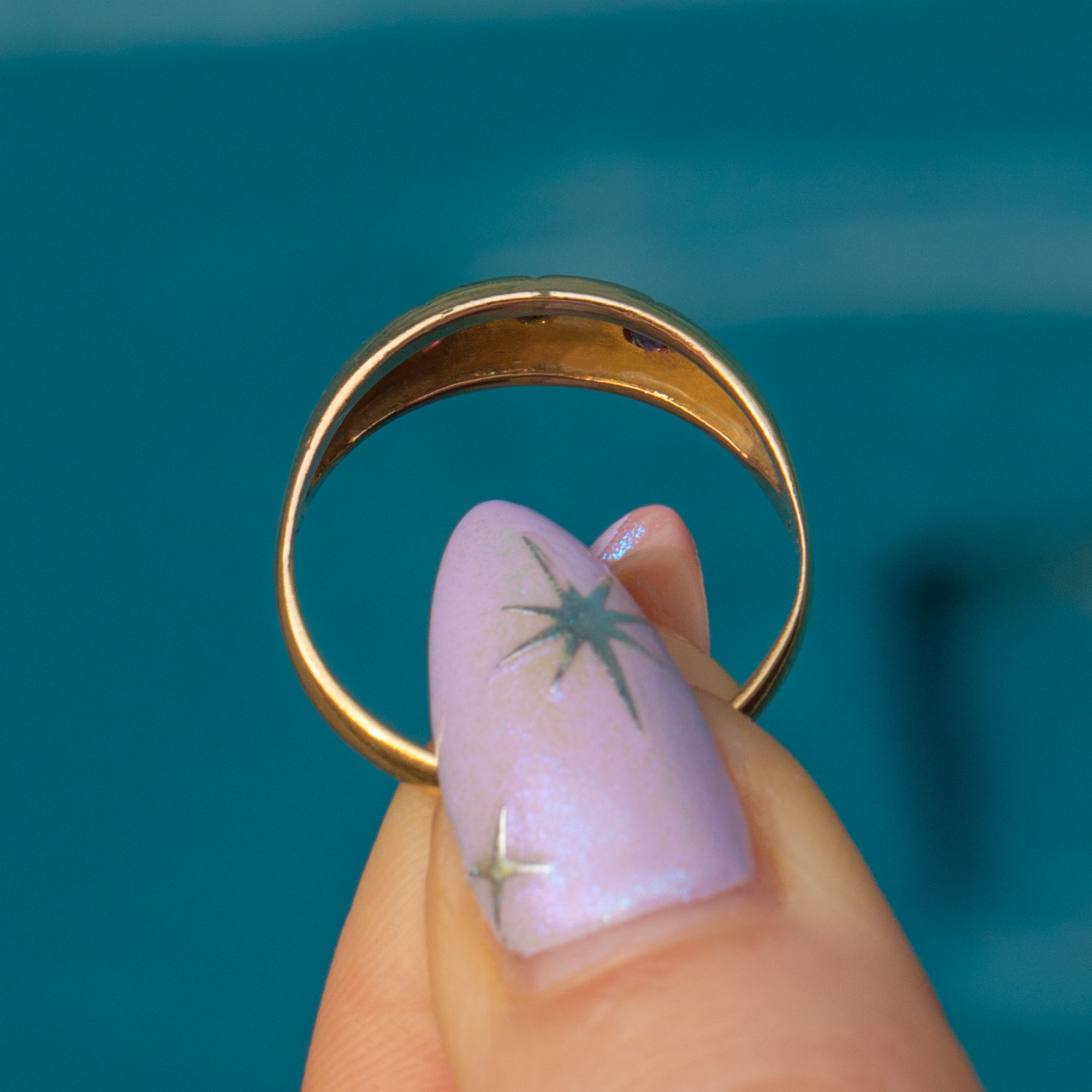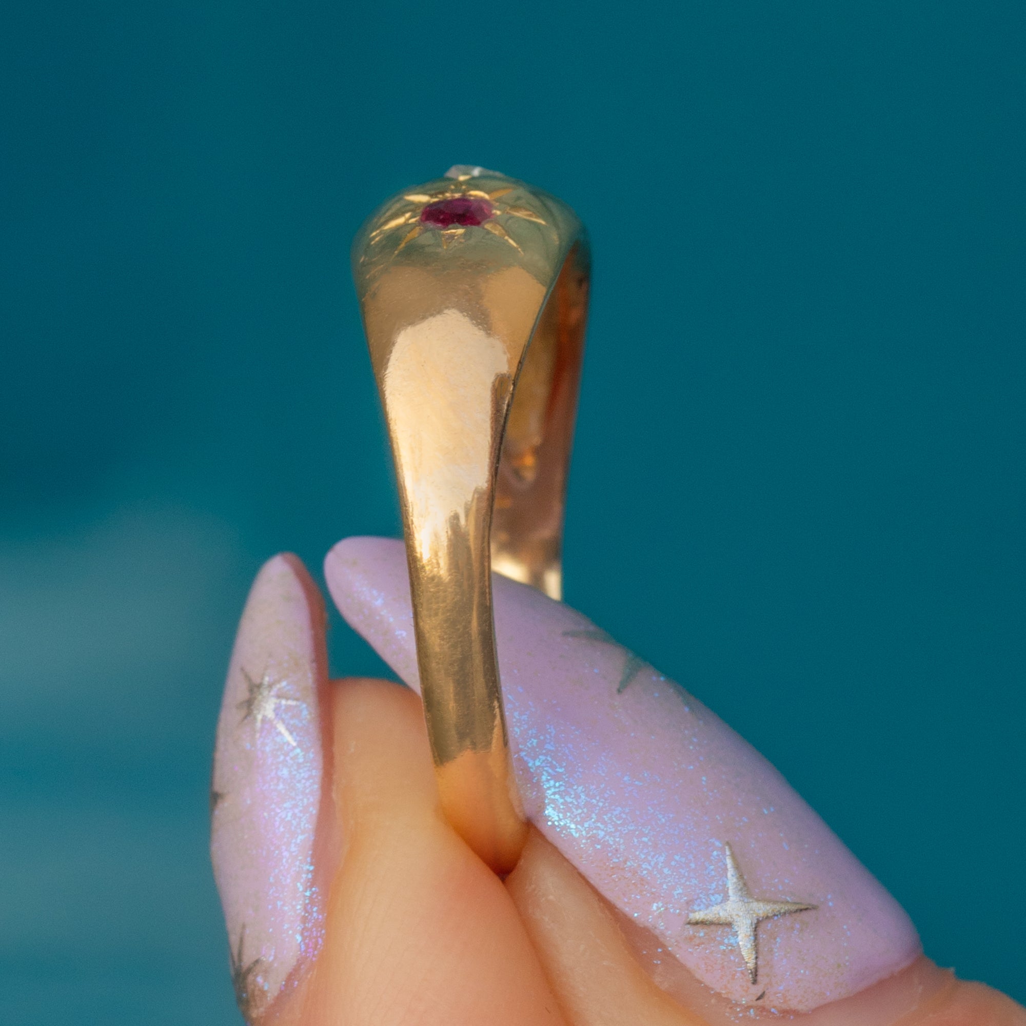 This luxurious antique 18ct Gold Ruby Diamond gypsy ring will bring celestial charm to your curated ring stack! The chubby ring band is crafted from bright 18ct Gold and is inlaid with a glimmering Diamond flanked by vibrant magenta-hued Rubies.