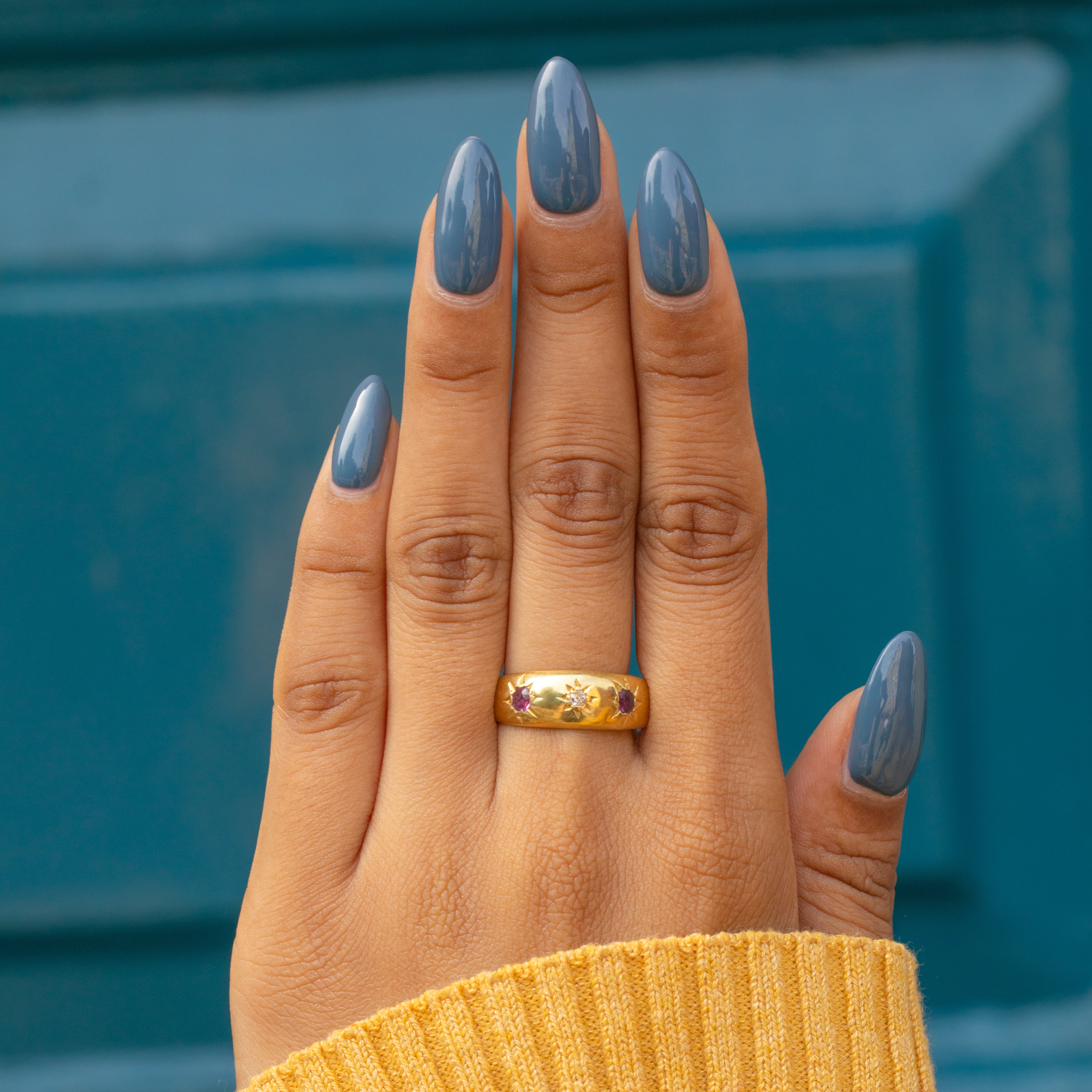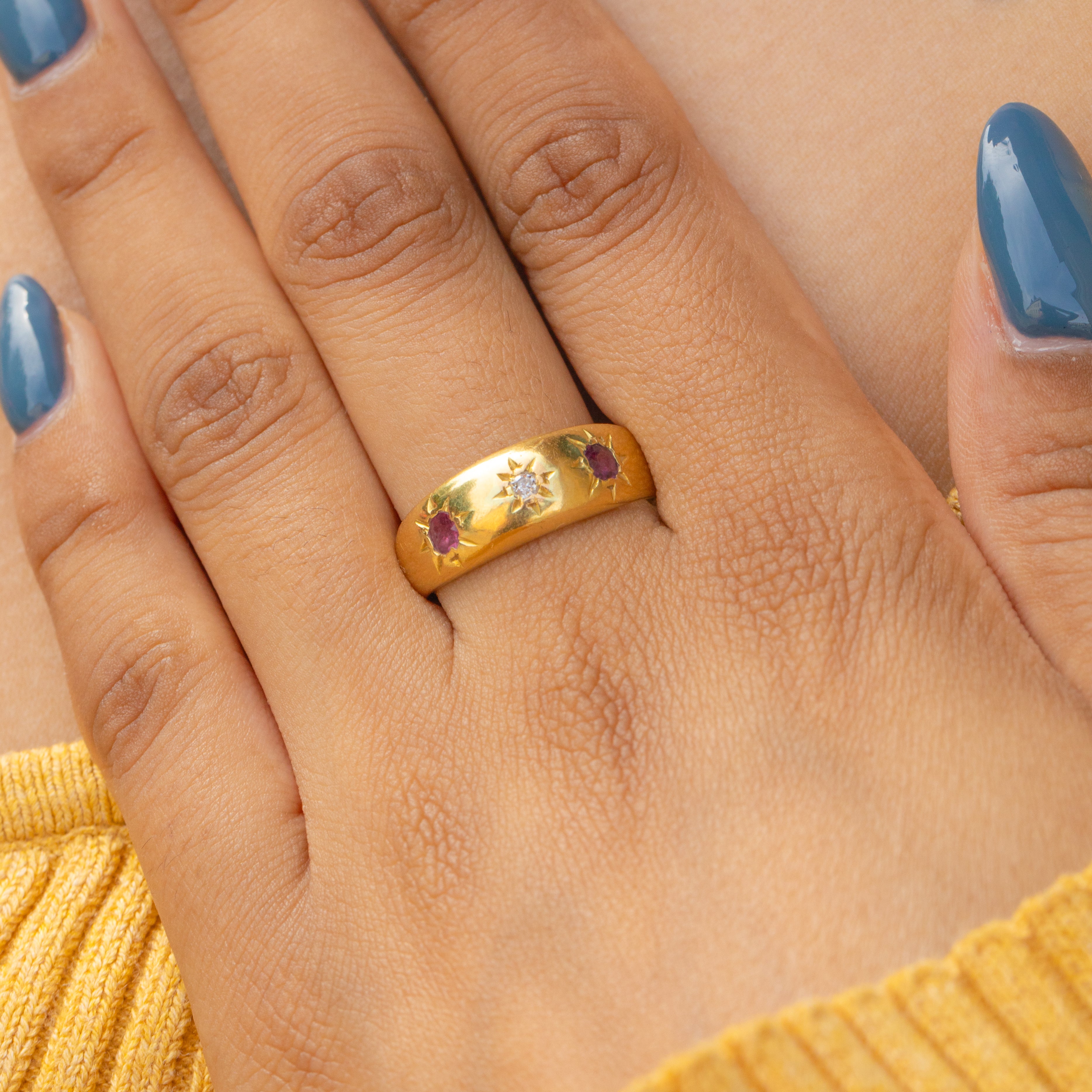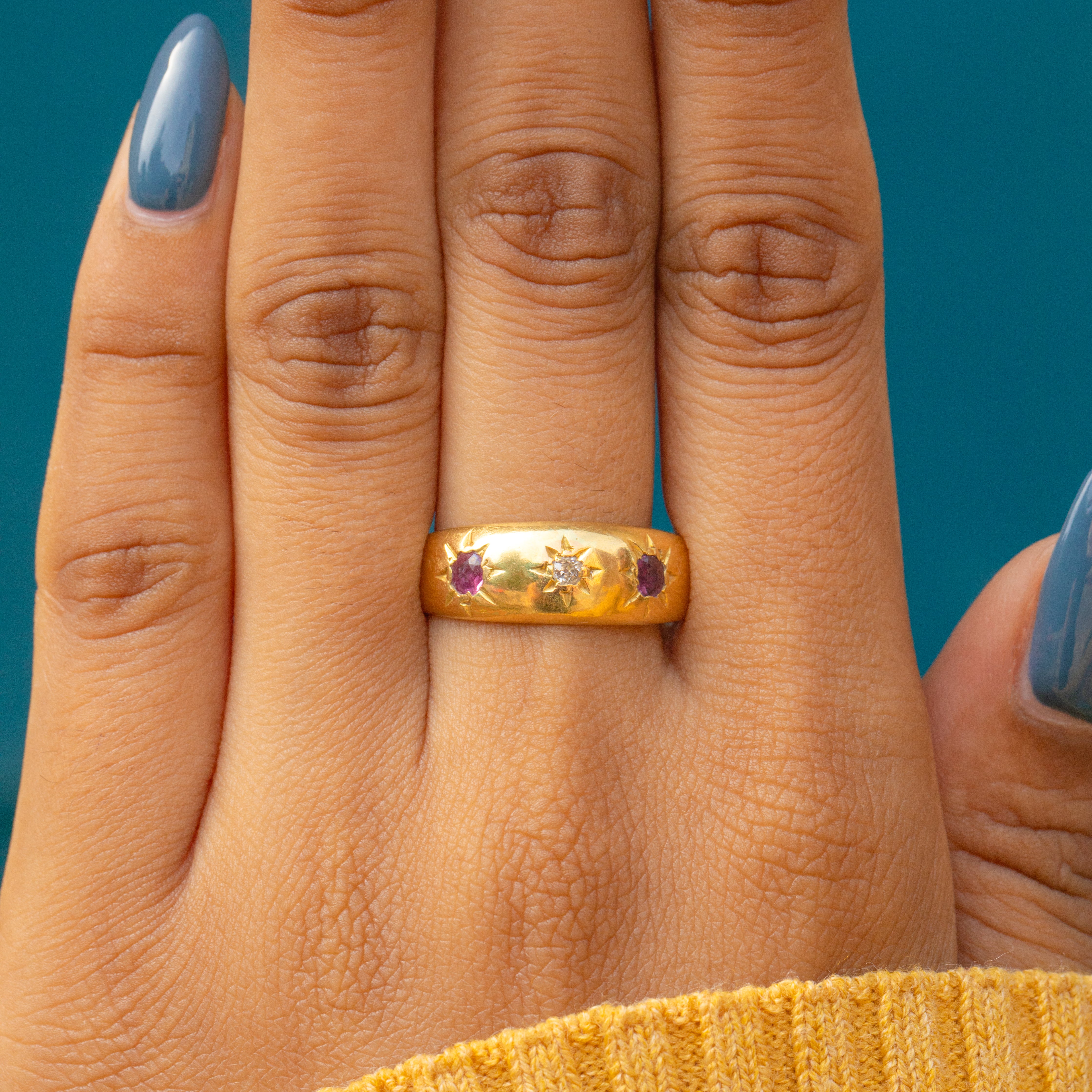 This Victorian gypsy ring will satisfy your penchant for celestial jewels, boasting three star-set gemstones in her centre. With Rubies akin to juicy raspberries flanking a twinkling white Diamond, this ring is a timeless piece of Victorian jewellery that you will treasure forever.