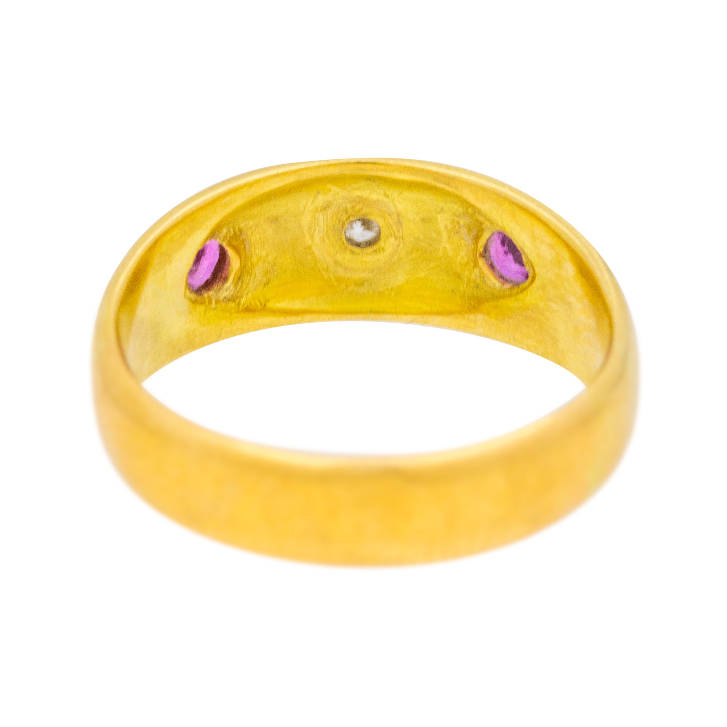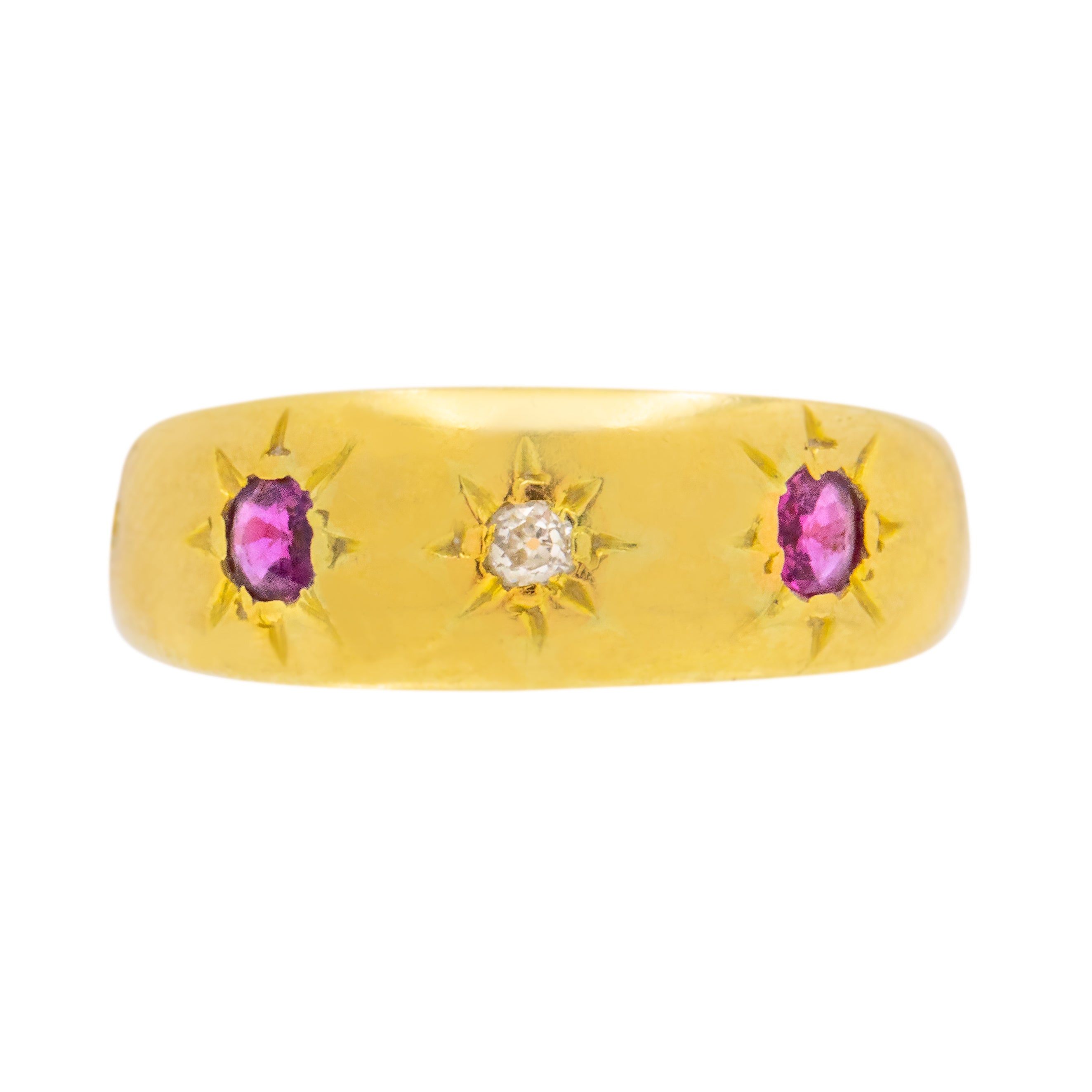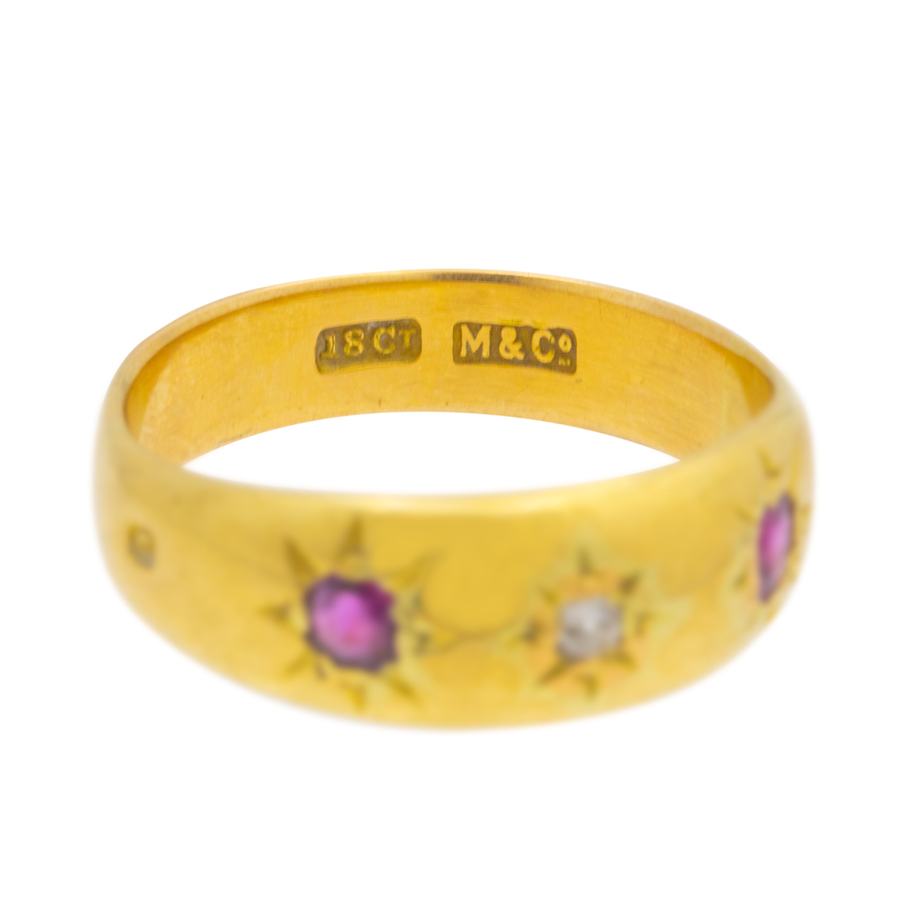 EXCELLENT.  This exquisite antique 18ct Gold Diamond Ruby star set gypsy ring is in excellent condition. The Gold is bright and sleek throughout, and the gemstones are securely set with no fleabites to note!