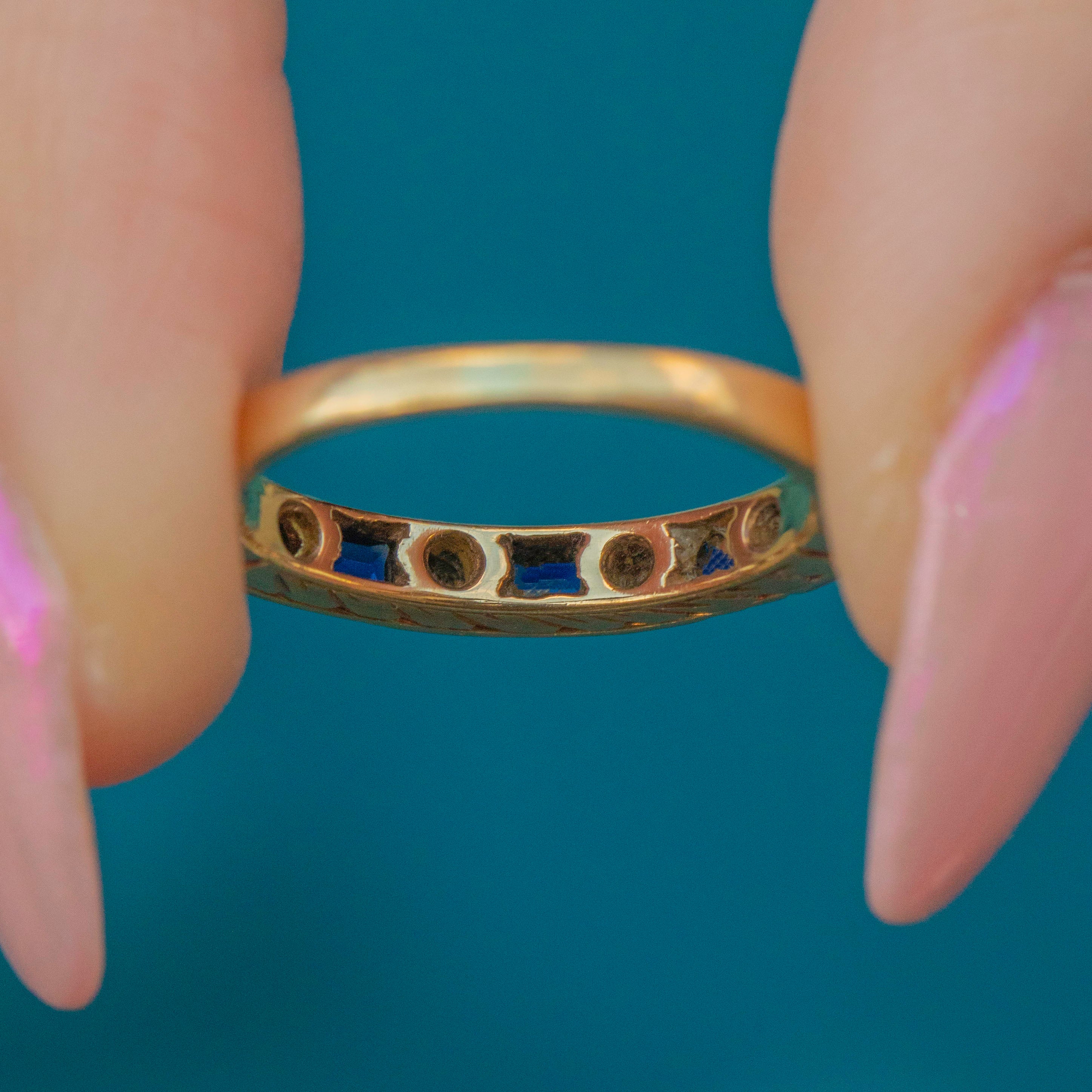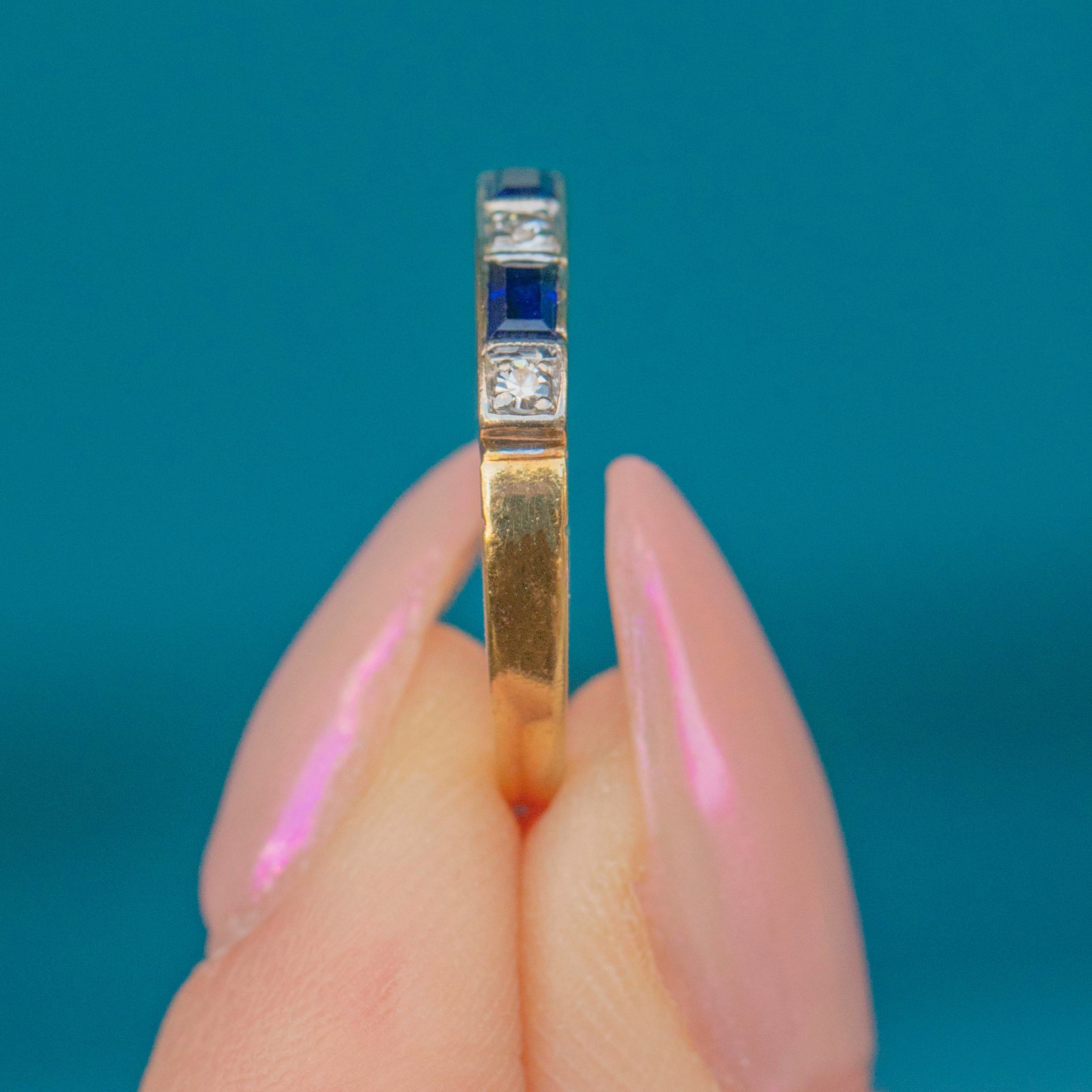 EXCELLENT. This antique 18ct Gold Sapphire Diamond stacking ring is in beautiful condition. The Diamonds are wonderful and sparkling to the high heavens, the Sapphires are also excellent, both unchipped and undamaged by time which is fantastic. She's a delight!