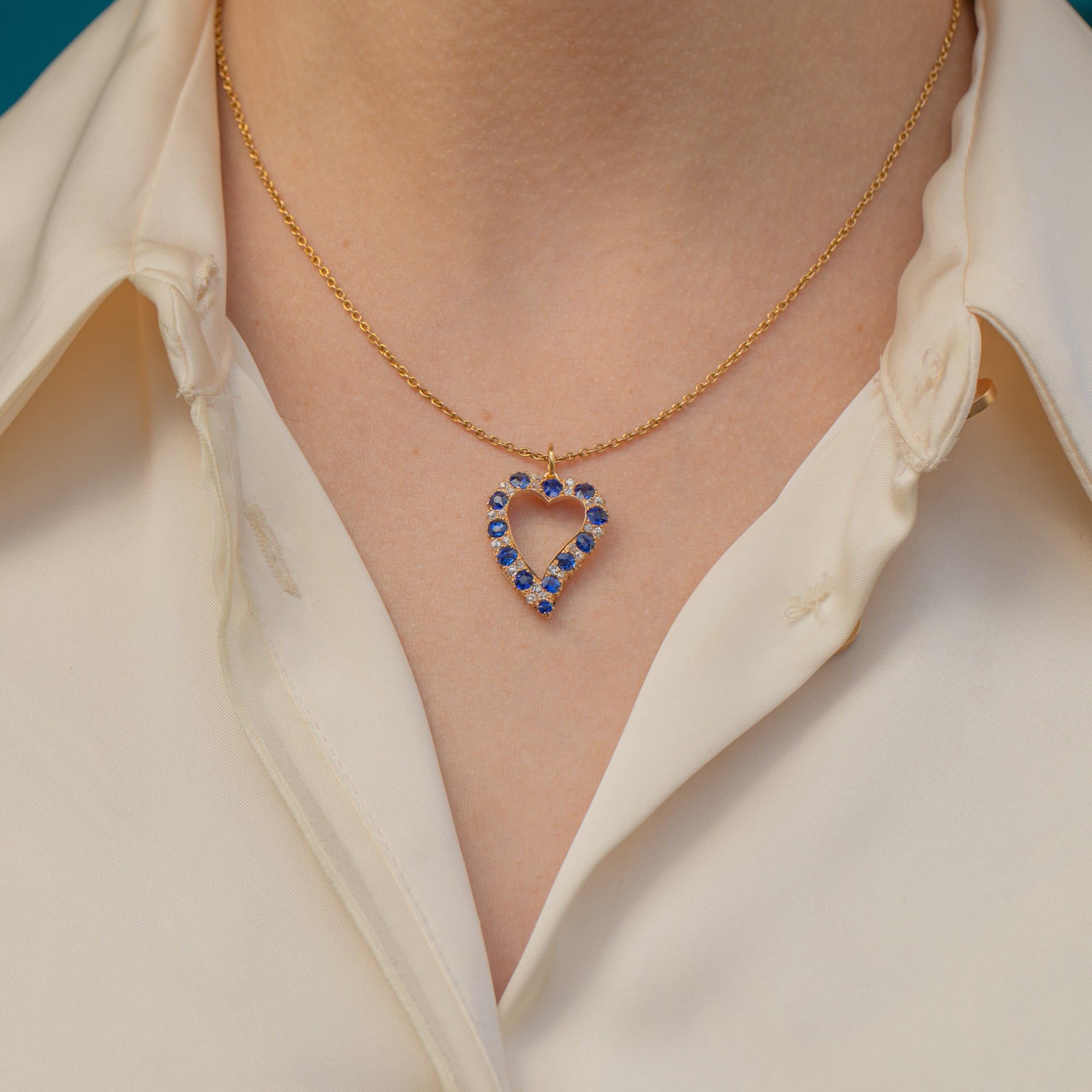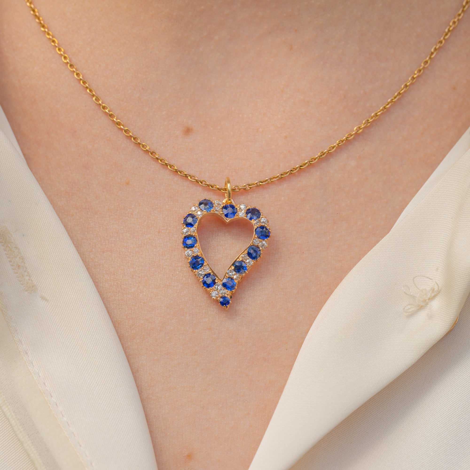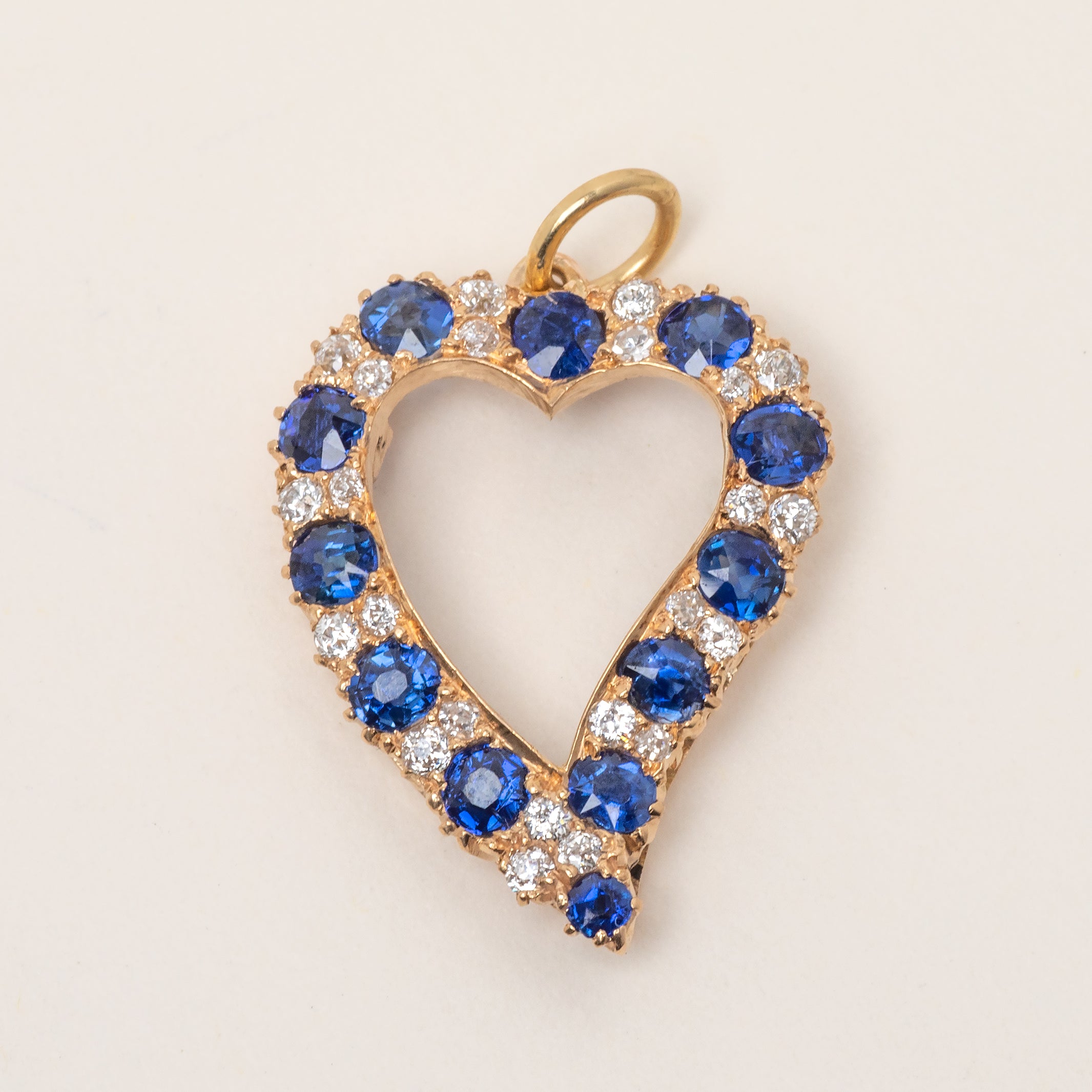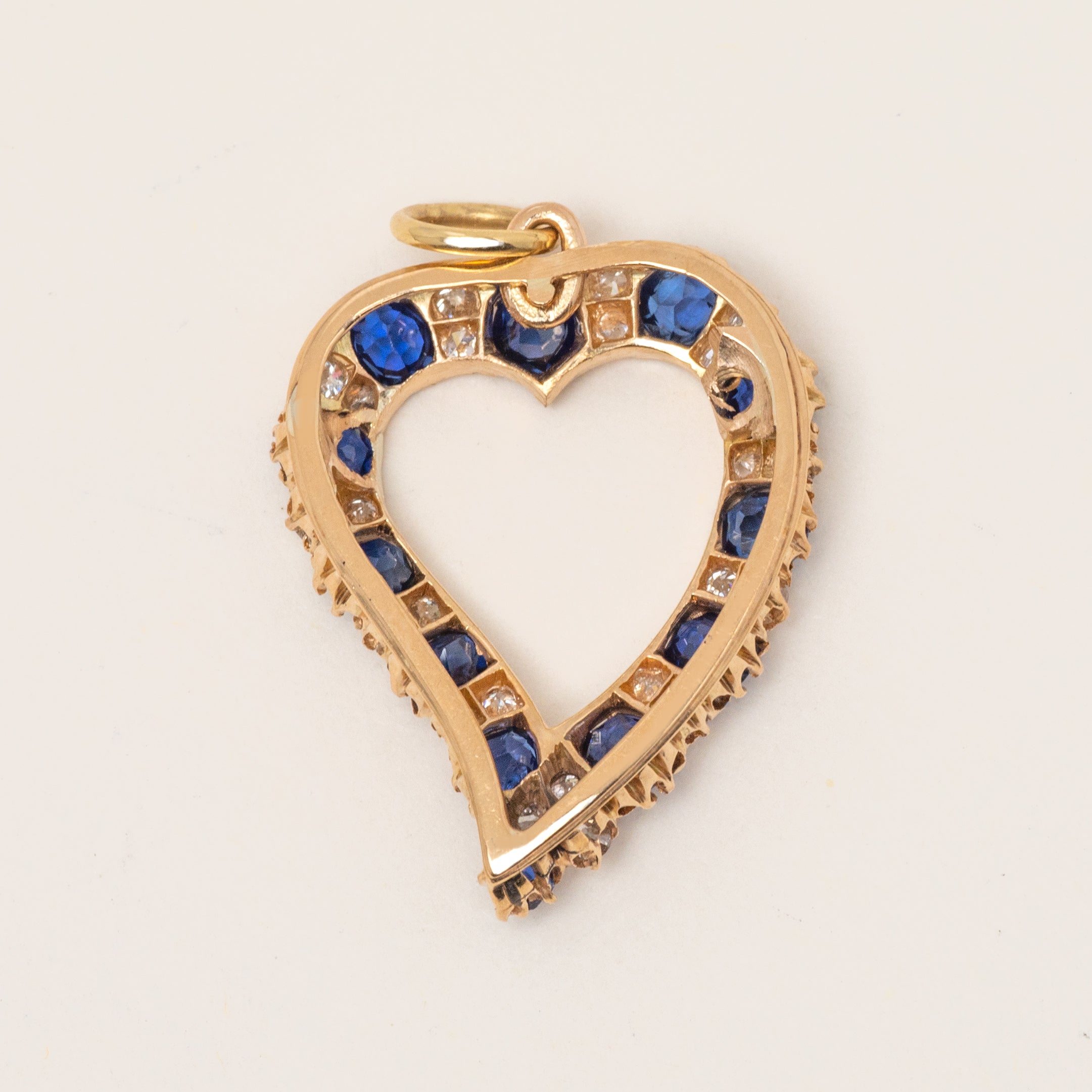 EXCELLENT. This antique 18ct Gold Sapphire Diamond witches heart pendant is in impeccable condition throughout. The hue of the 18ct Gold is remarkable, adding a touch of sunshine to any outfit. All of the Sapphires and Diamonds are intact with no signs of wear. Overall, a stunning antique love charm!