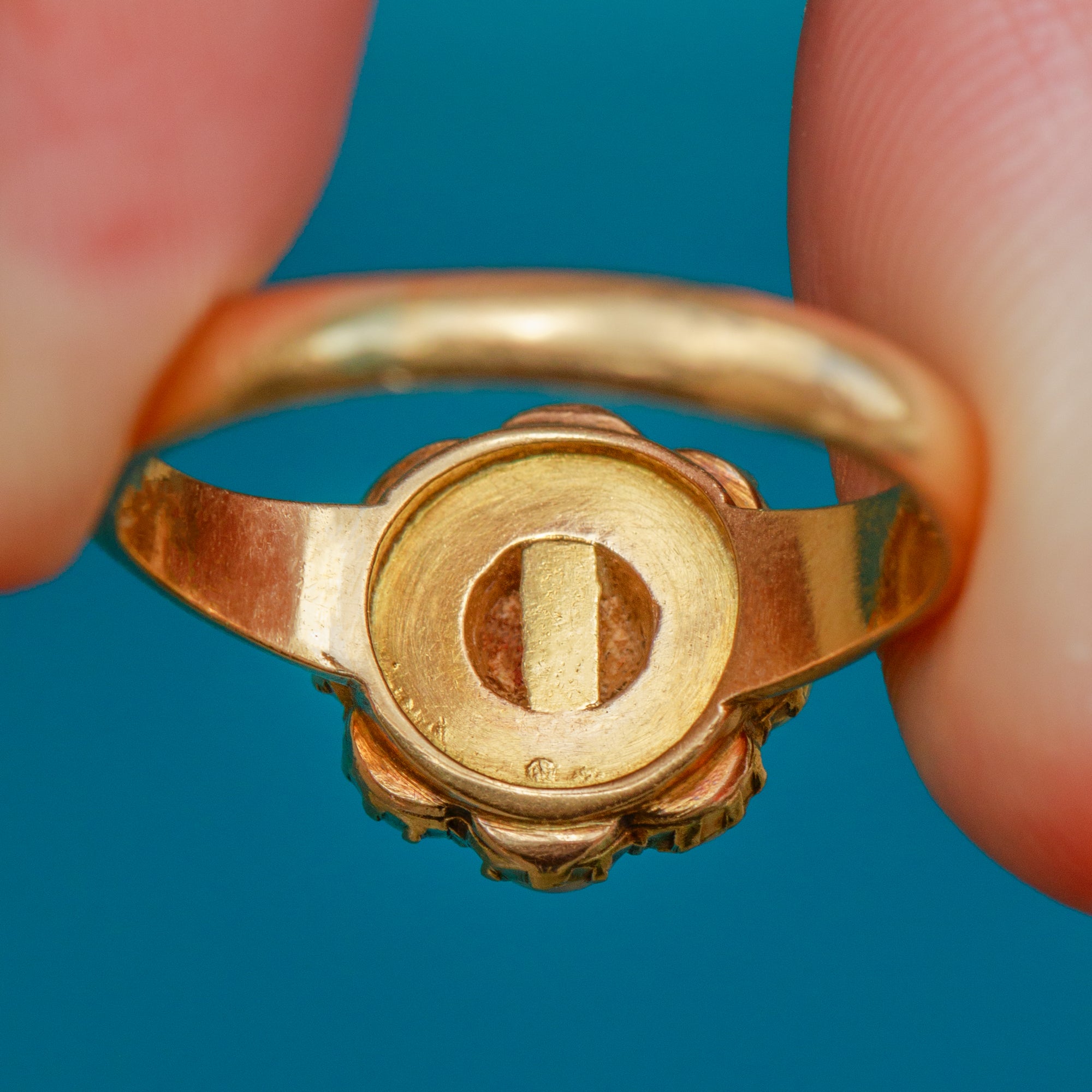 VERY GOOD-EXCELLENT: This antique 18ct Gold Sapphire Pearl cluster ring is in lovely condition. The Sapphire shows no signs of wear and is secure in her 18ct Gold setting. There is a beautiful lustre to the Pearls and some colour variation between them, but if anything, this adds to her antique charm. There is slight evidence of re-sizing at the back of the band, which is subtle and can't be seen when worn. The Gold has a wonderful saturation and the band is smooth and comfortable to wear!