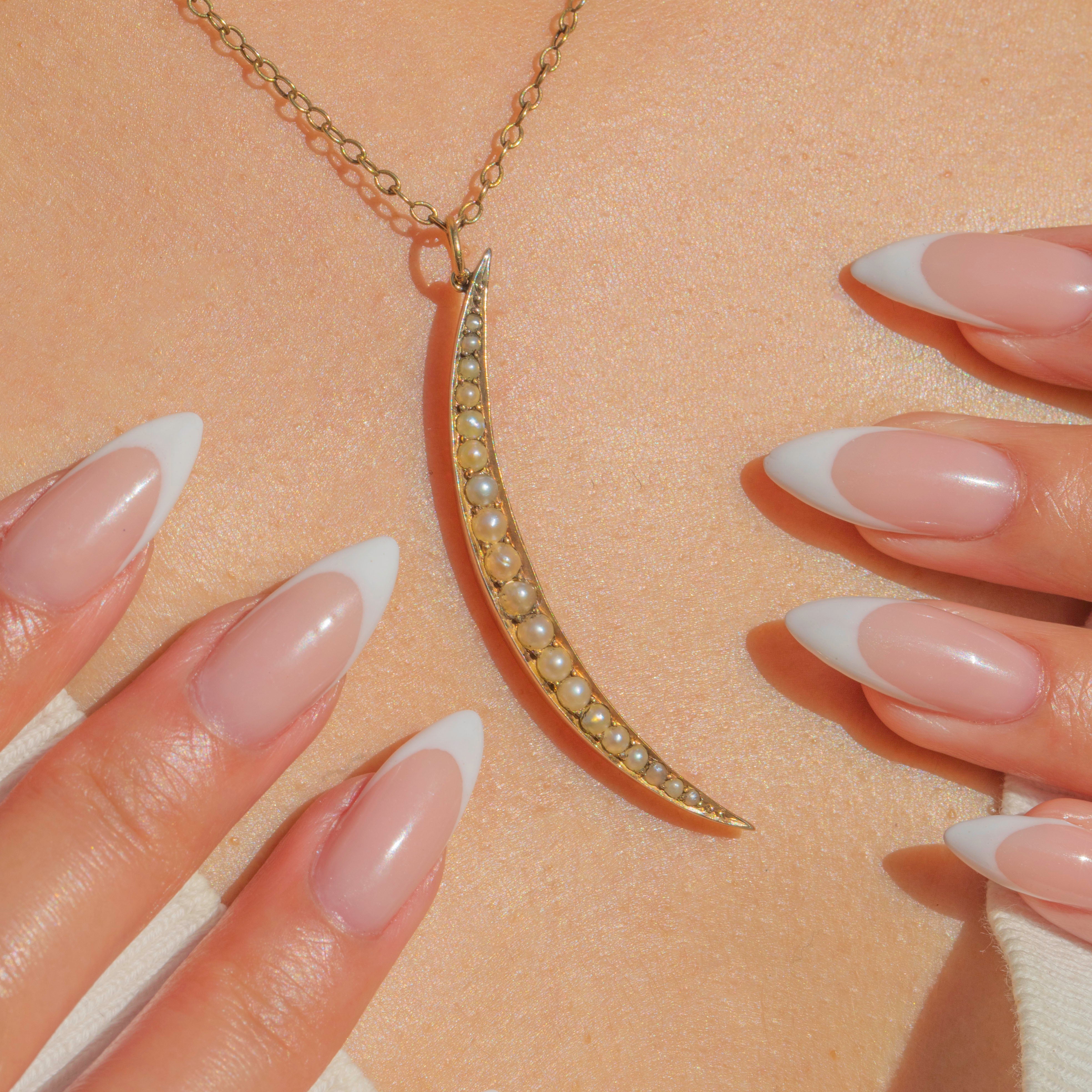 Antique 18ct Gold Skinny Pearl Crescent Moon Pendant
