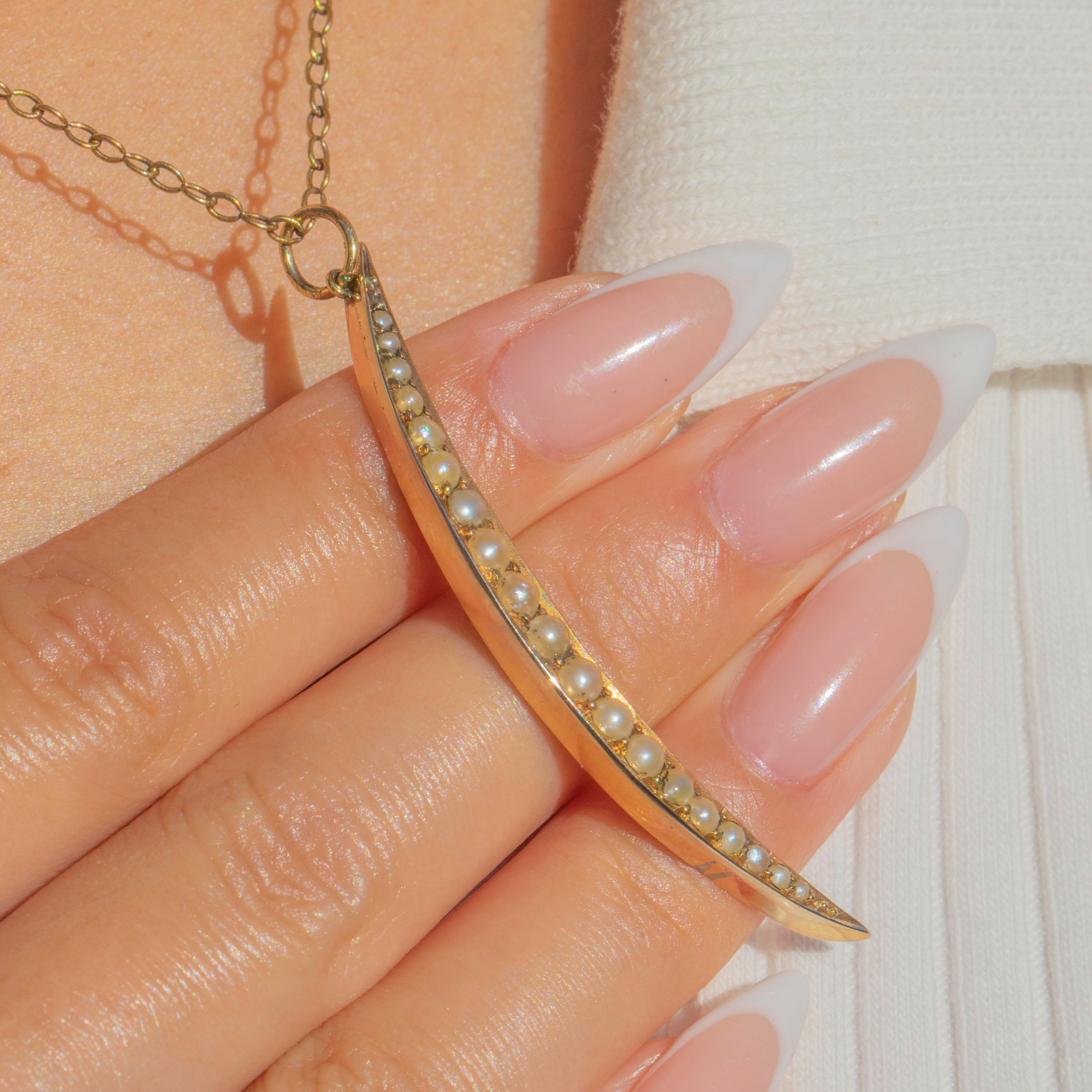This Antique Victorian crescent moon pendant is crafted in rich 18ct Gold and set with a row of lustrous natural Pearls. The Pearls graduate in size from 1.3mm to 2.5mm in diameter, creating a delicate taper that accentuates the elegant arc of the crescent. On the reverse, a charming star detail adds a hidden flourish of craftsmanship typical of Victorian jewellery.