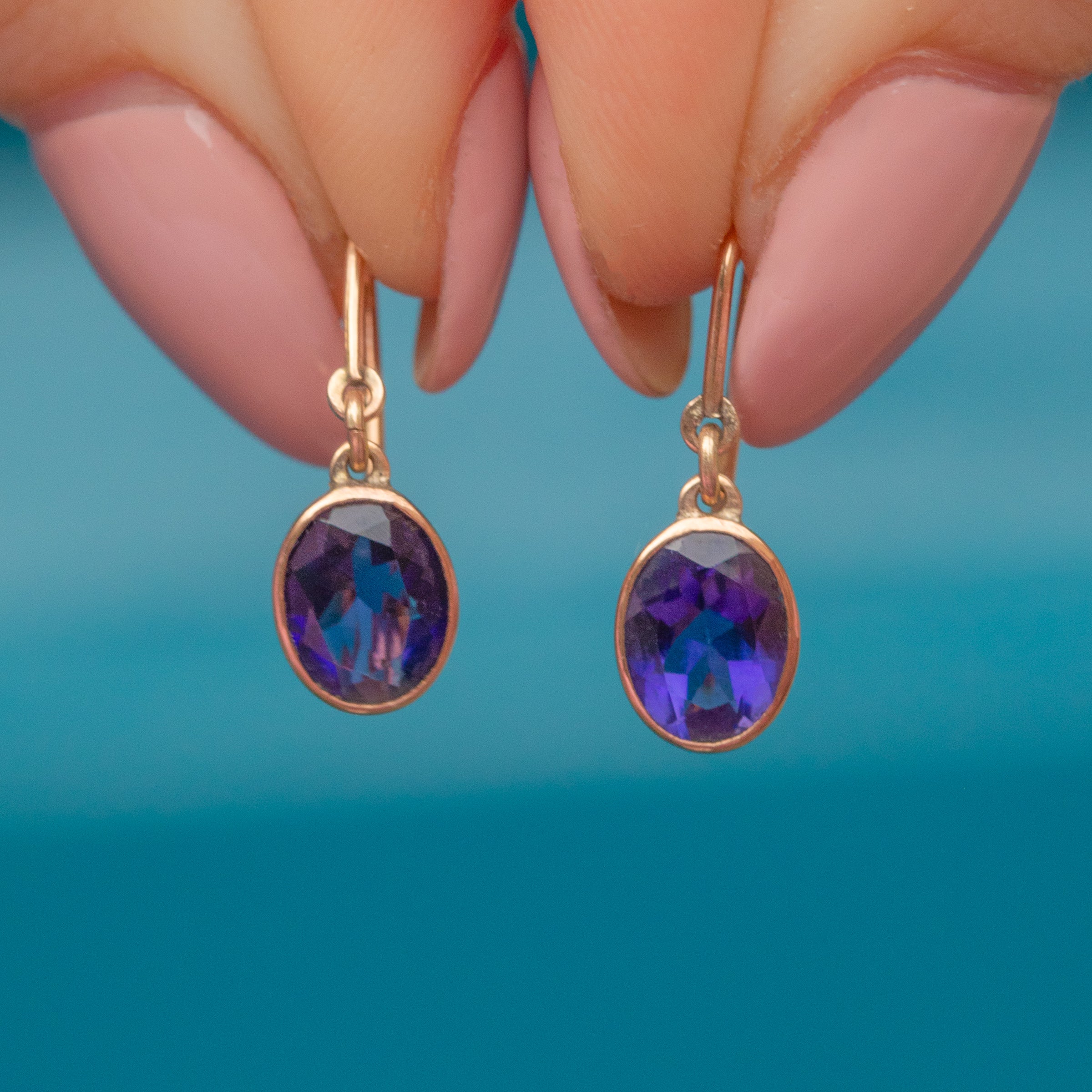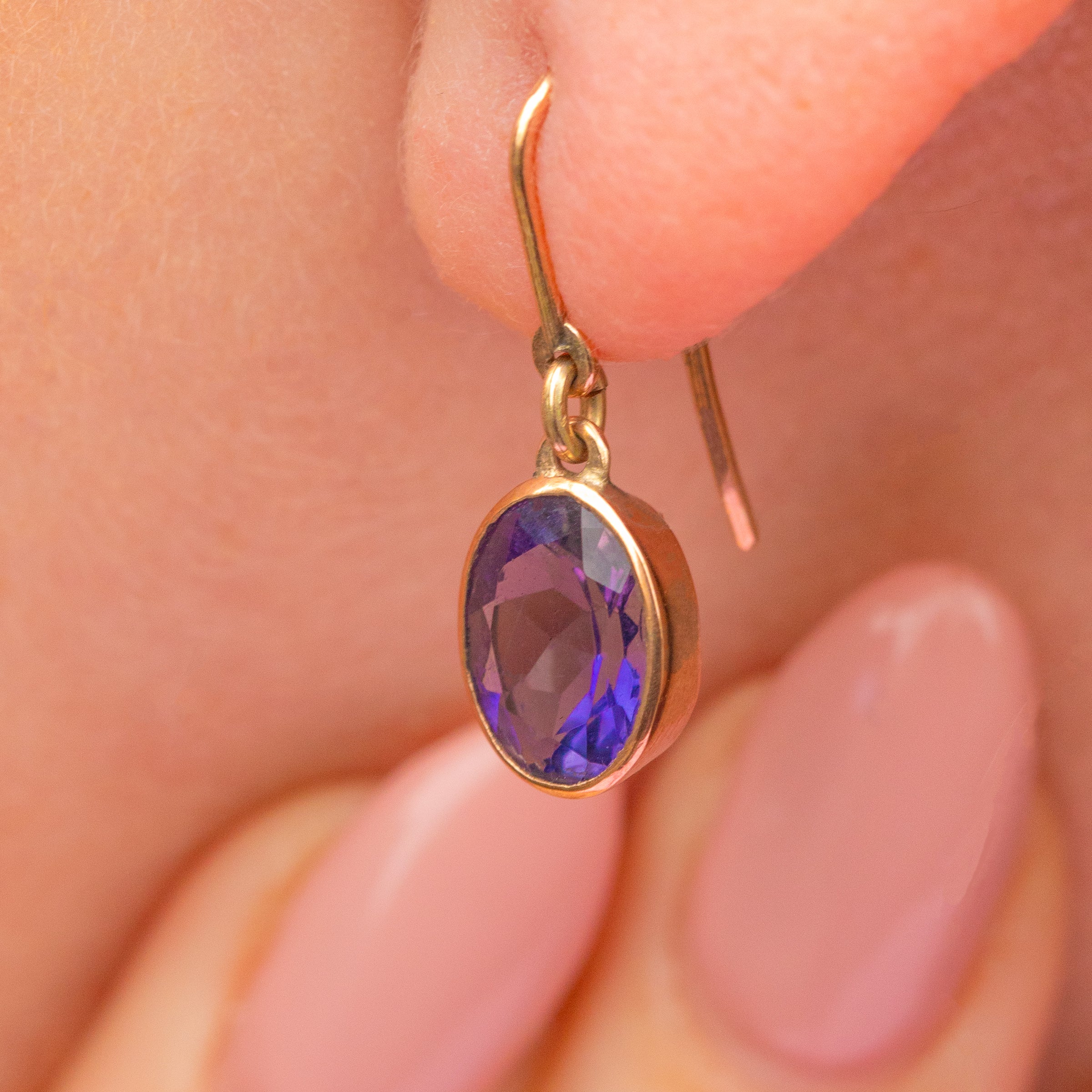 These antique 9ct Gold Amethyst drop earrings are perfect for adding an instant pop of colour to any outfit! The rich violet Amethyst drops are encased in warm buttery 9ct Gold bezels, making for a regal and sophisticated pairing.