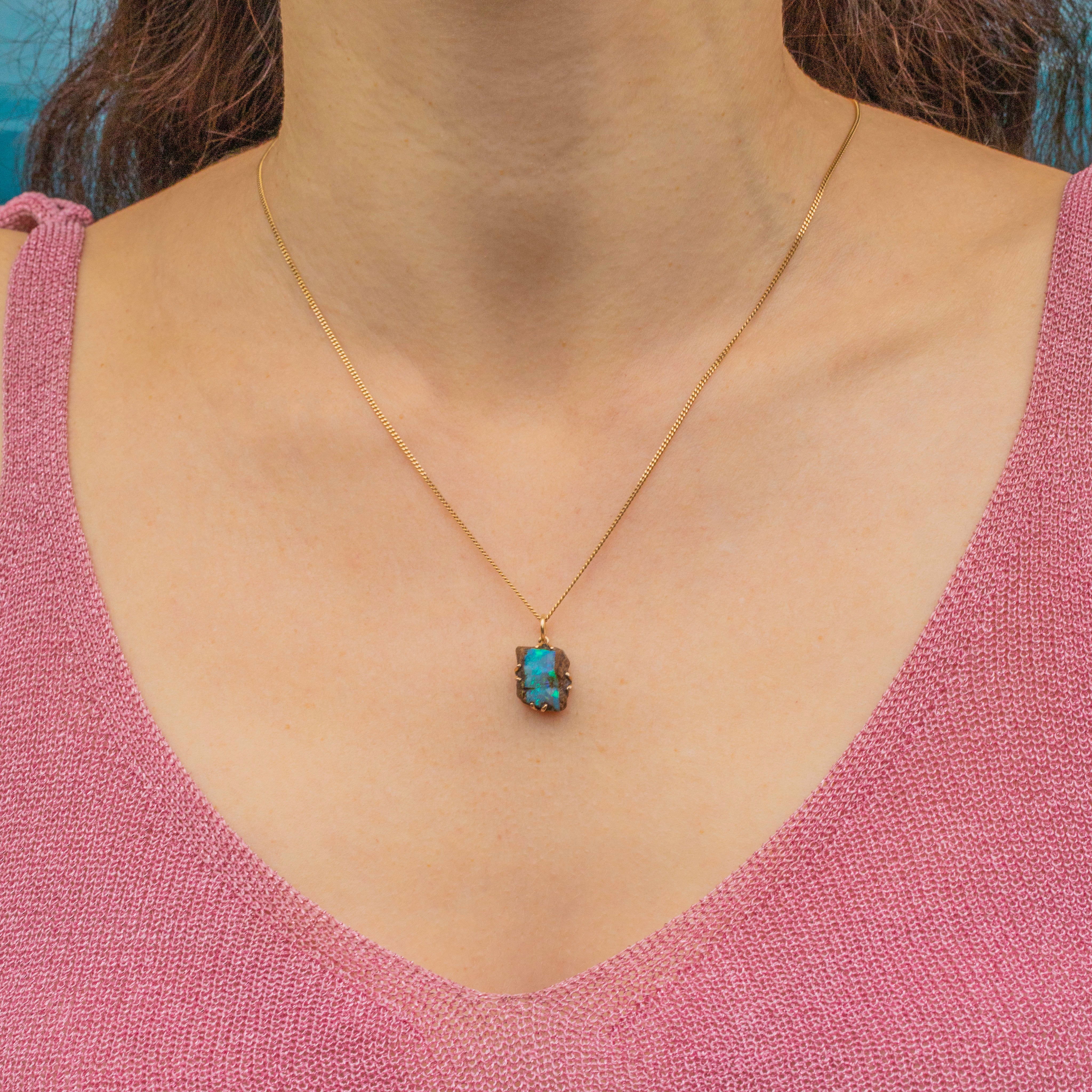 Secured in saturated 9ct Gold, that perfectly complements the iridescent glow of her boulder Opal, this Art Deco pendant is the perfect choice for any earthy girls out there who love to keep a token of nature close to their hearts.