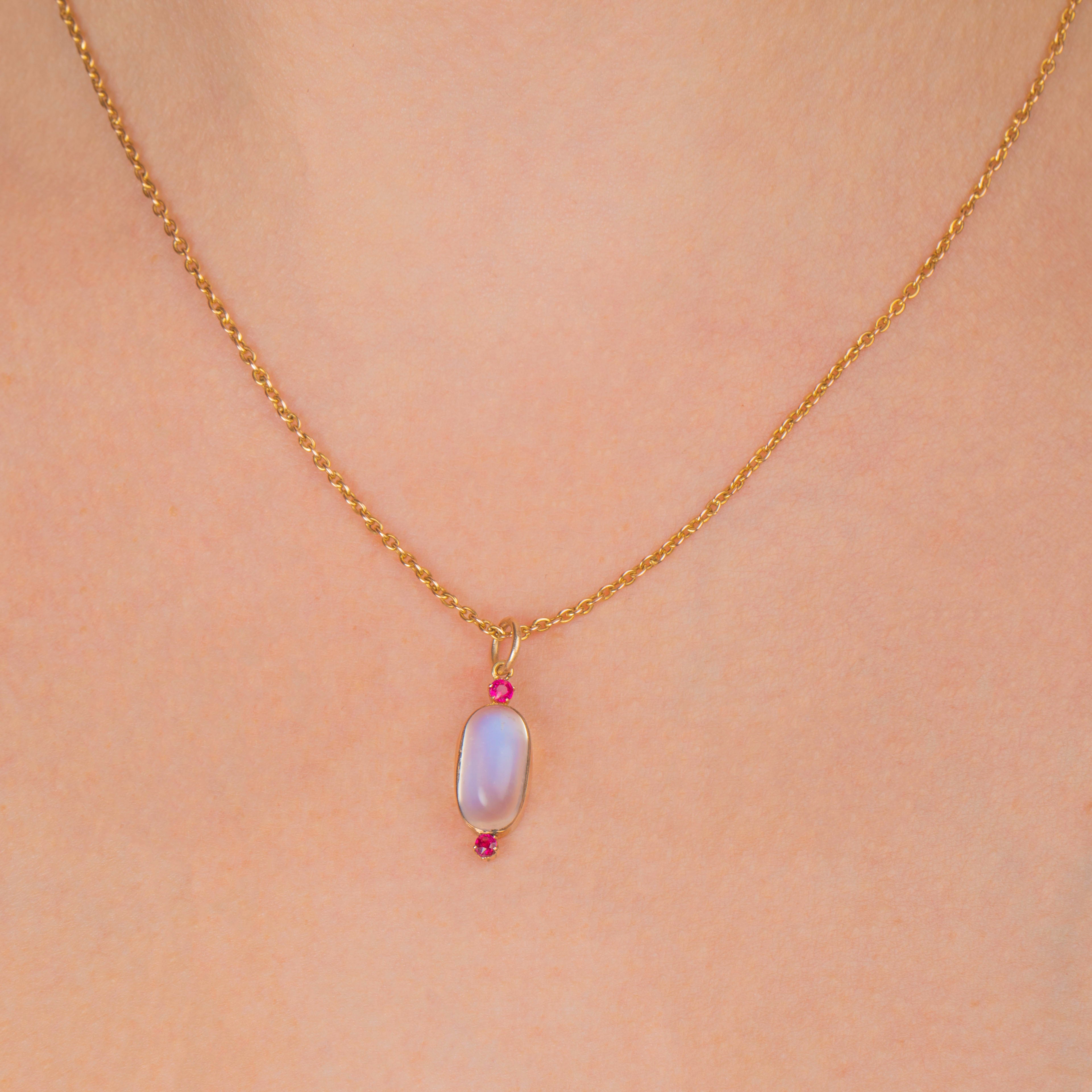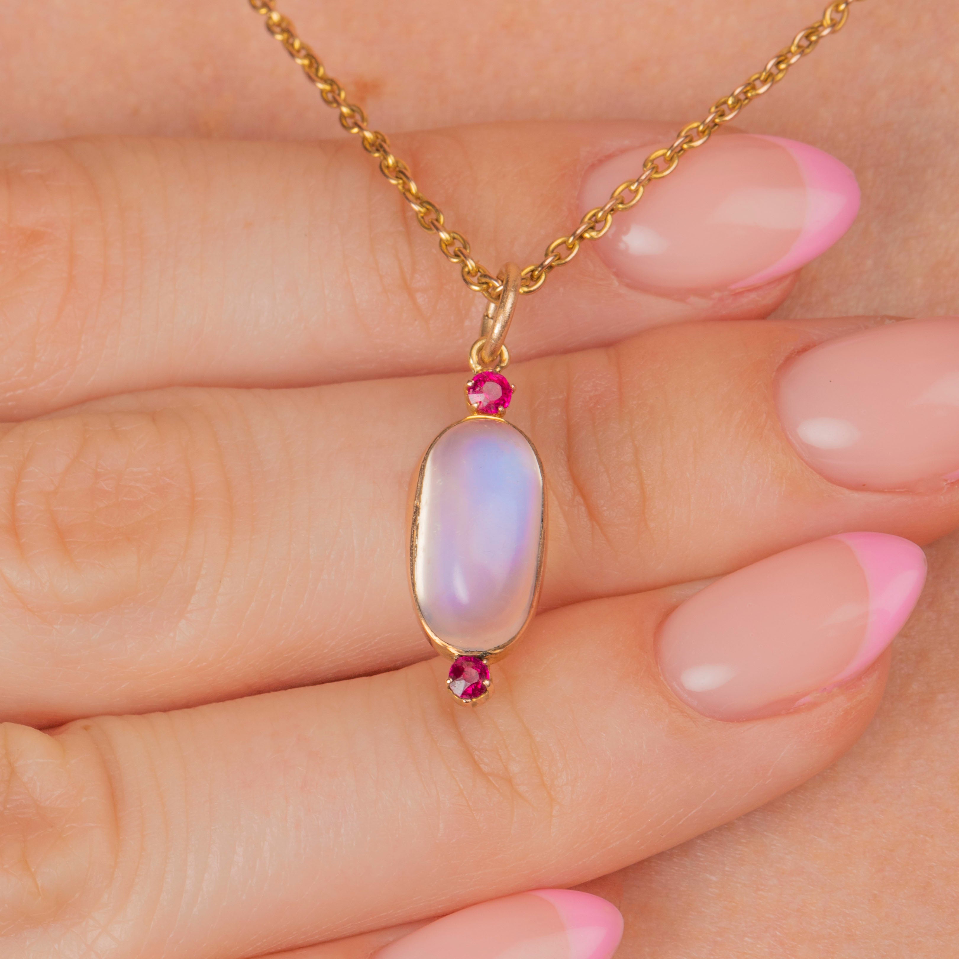 Ceylon Moonstones are highly sought after for their distinctive blue tones, and we love how the pink tones of the Rubies add a dash of vibrancy.