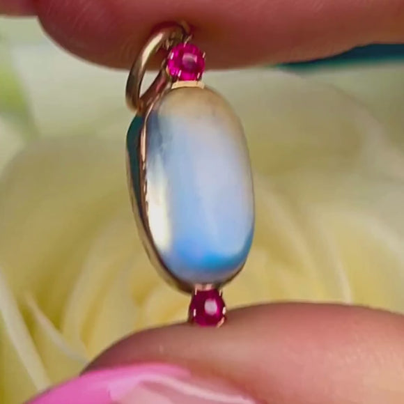 This antique 9ct Gold Ceylon Moonstone charm will leave you mesmerised! Made from 9ct Gold, this charm is home to a cabochon cut Ceylon Moonstone as well as two Rubies.